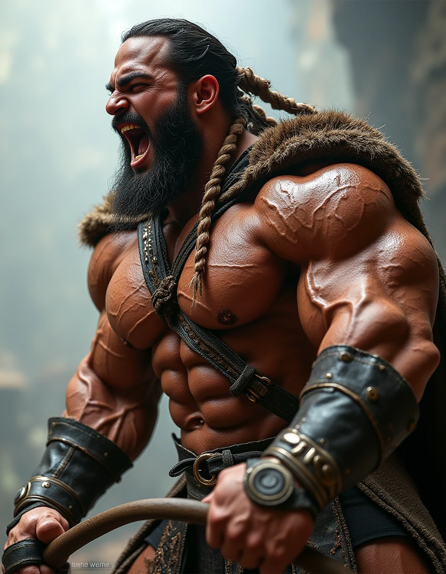 His highly muscular, massive, and bulky body features thick, massive, and well-defined thighs, strong, massive arms, broad shoulders, defined abs, and a large chest.