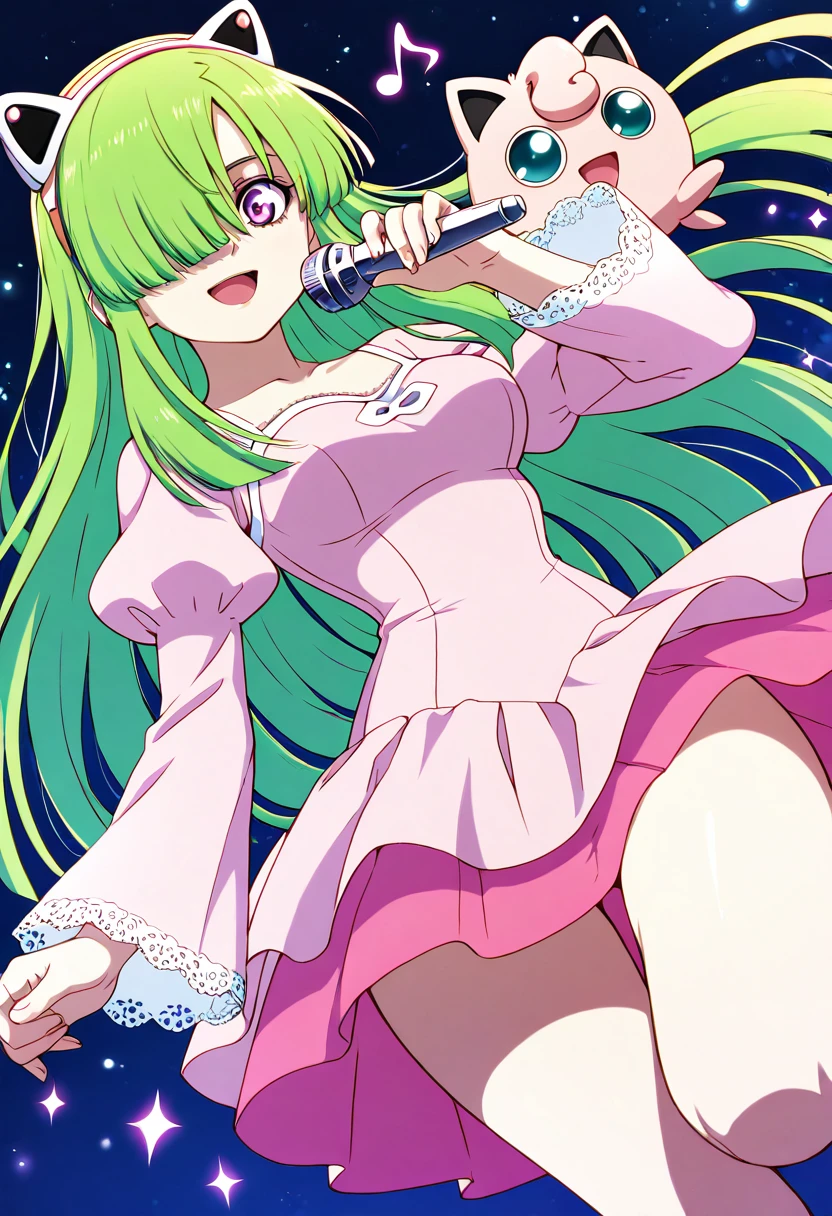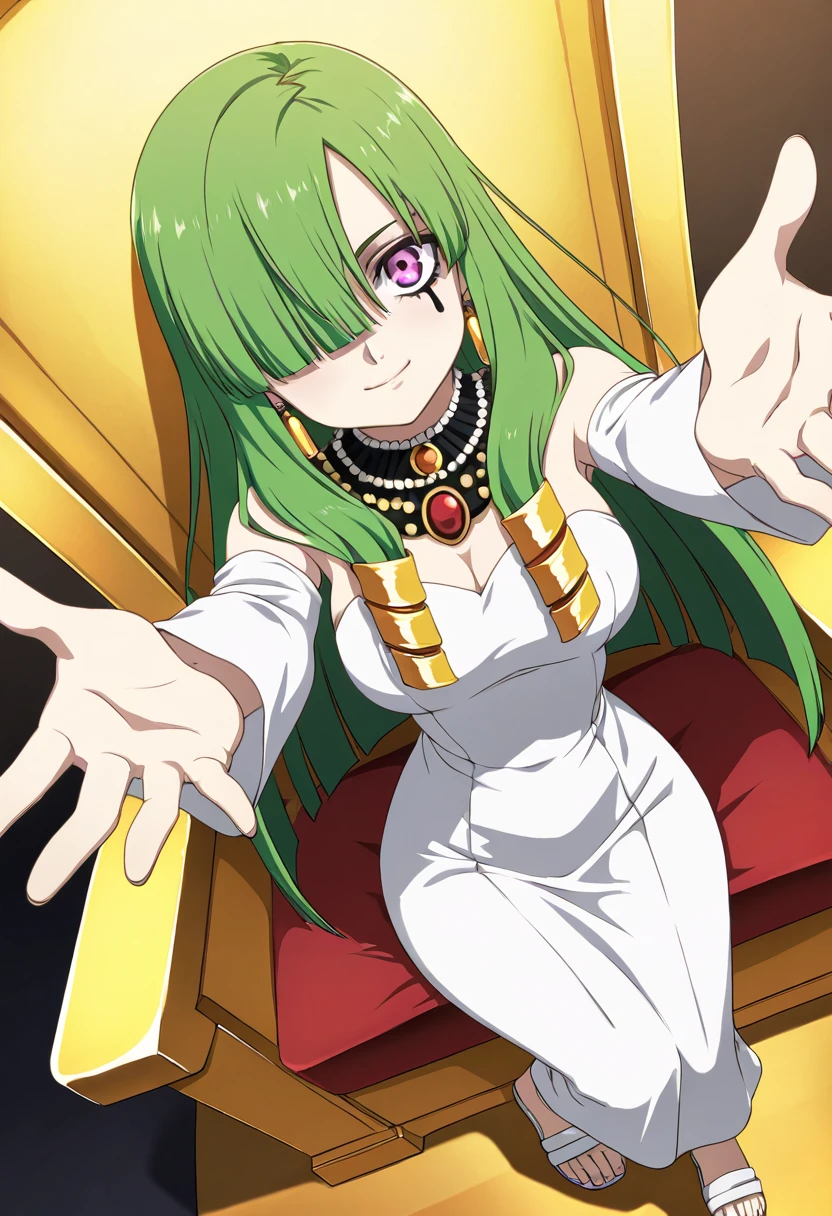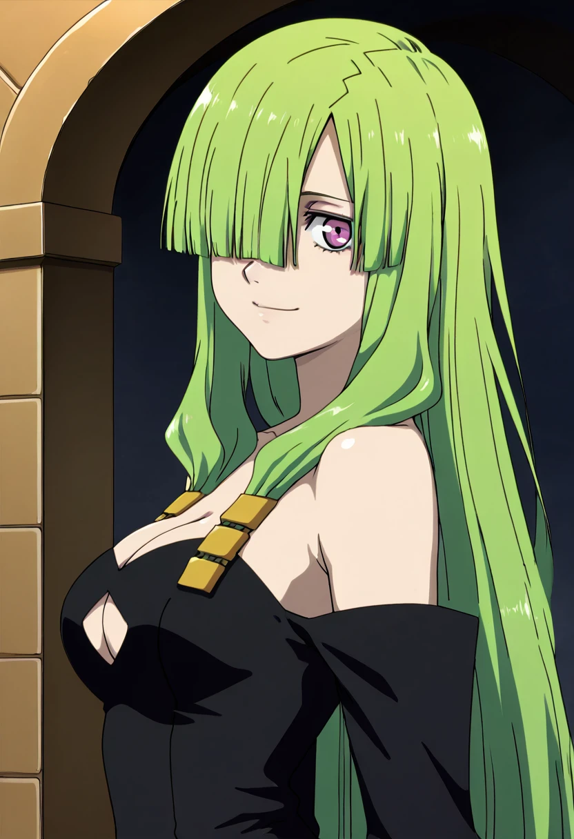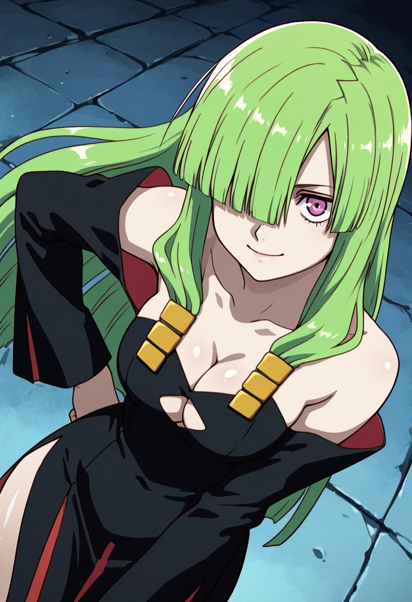 zzDoll, purple eyes, green hair, long hair, hair over one eye, bare shoulders, cleavage, detached sleeves, black dress, clothing cutout,