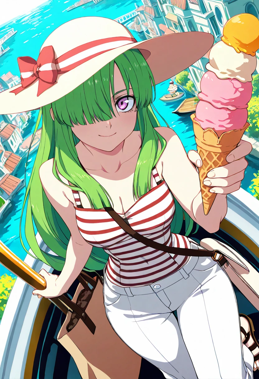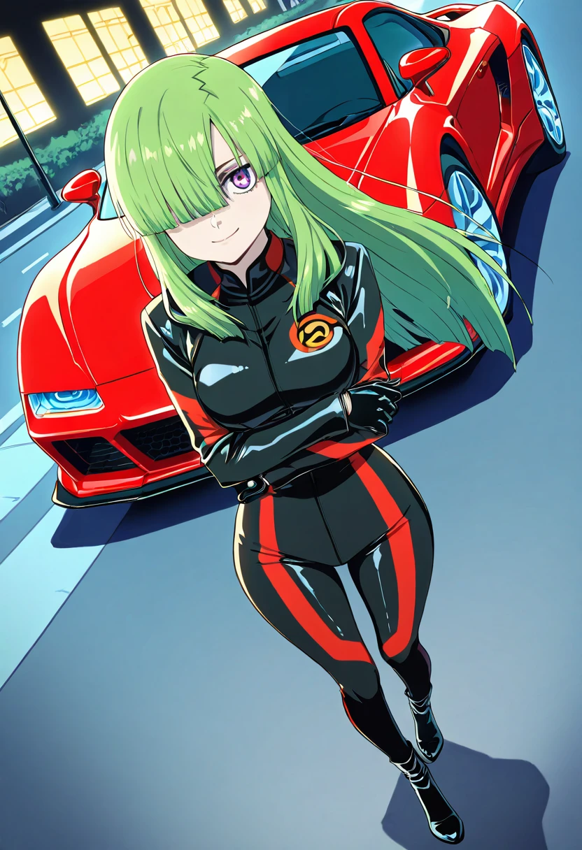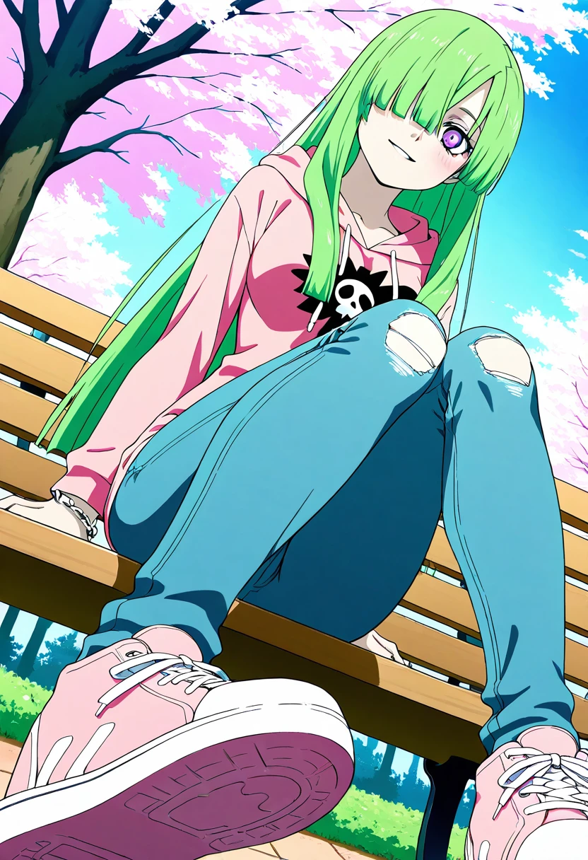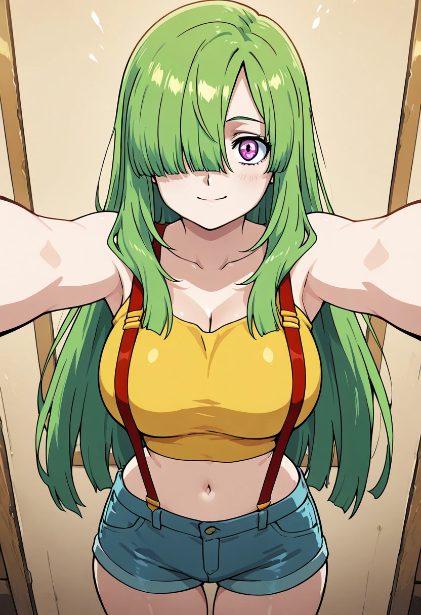 zzDoll, purple eyes, green hair, long hair, hair over one eye,
