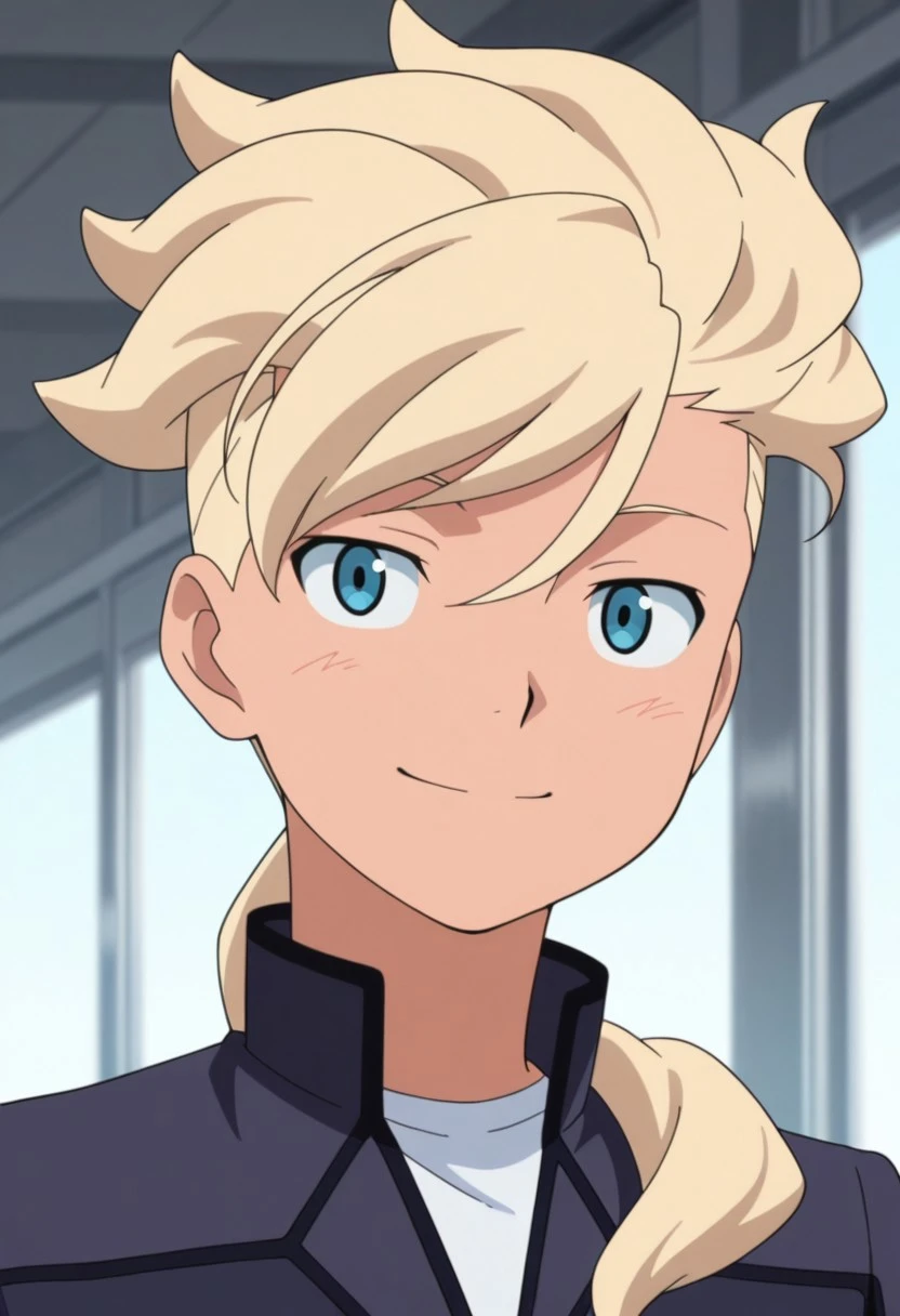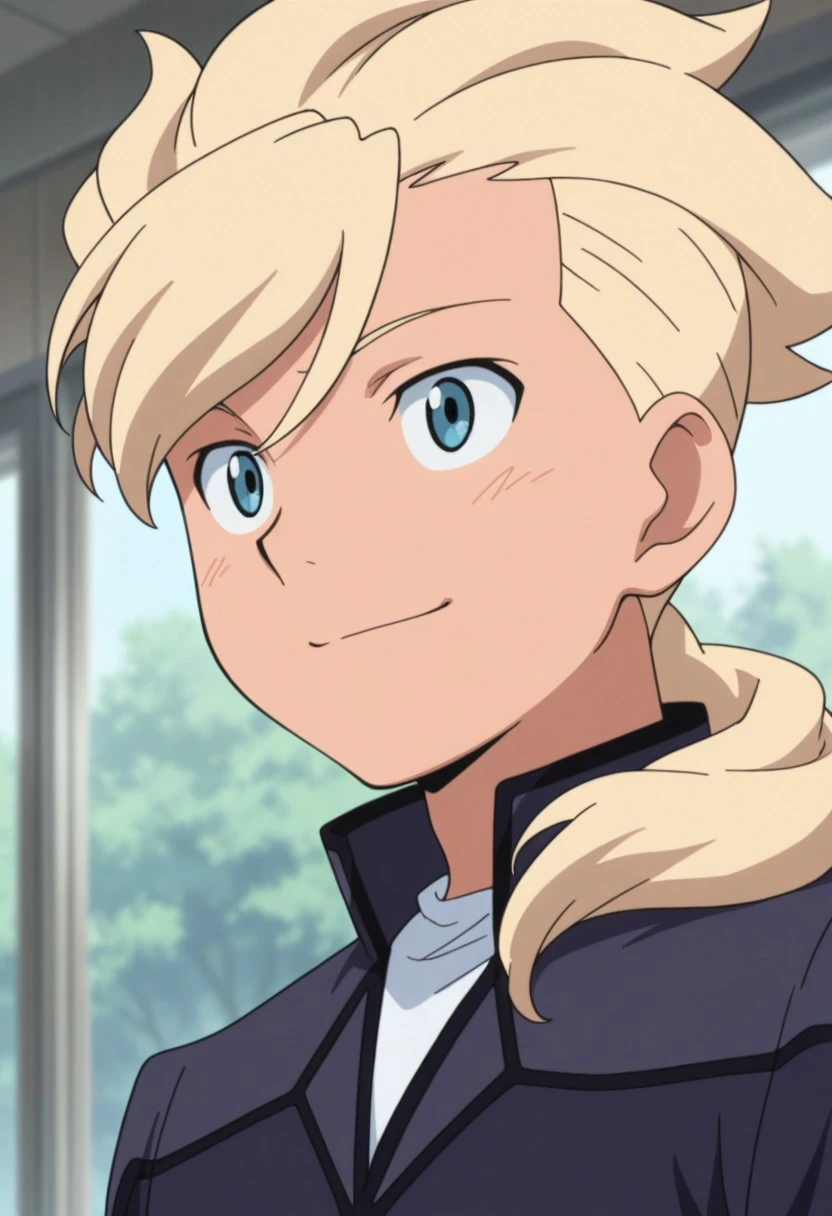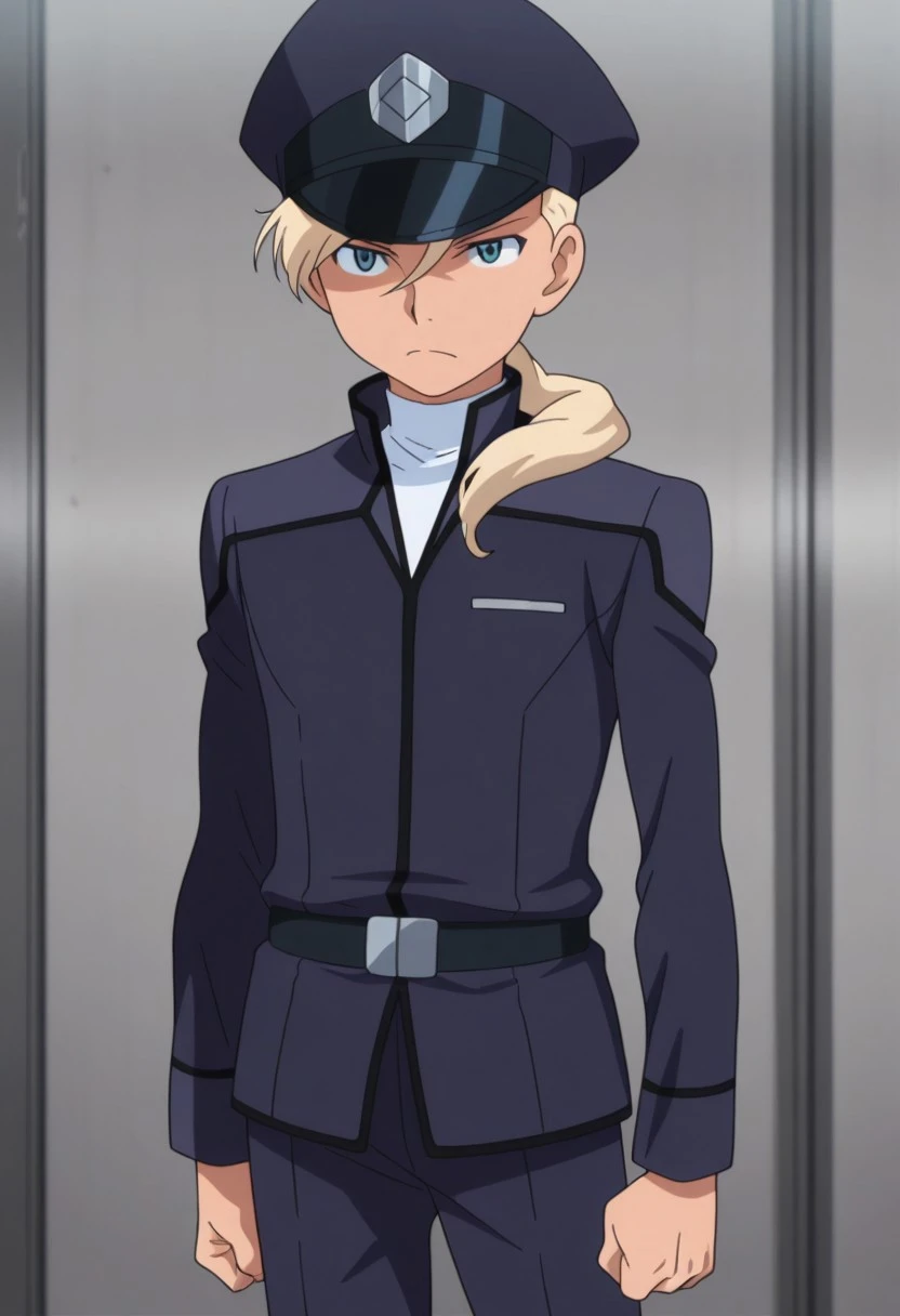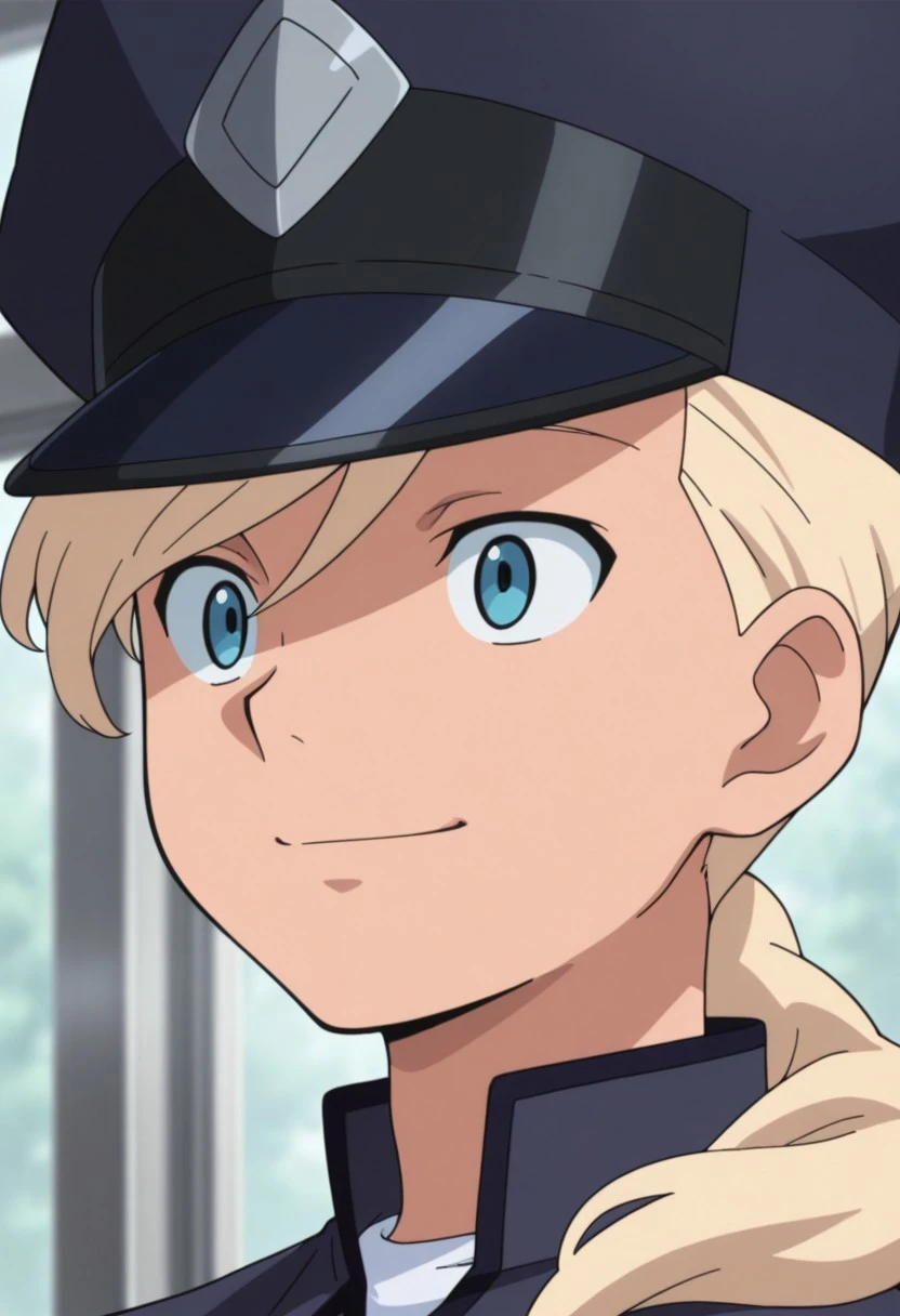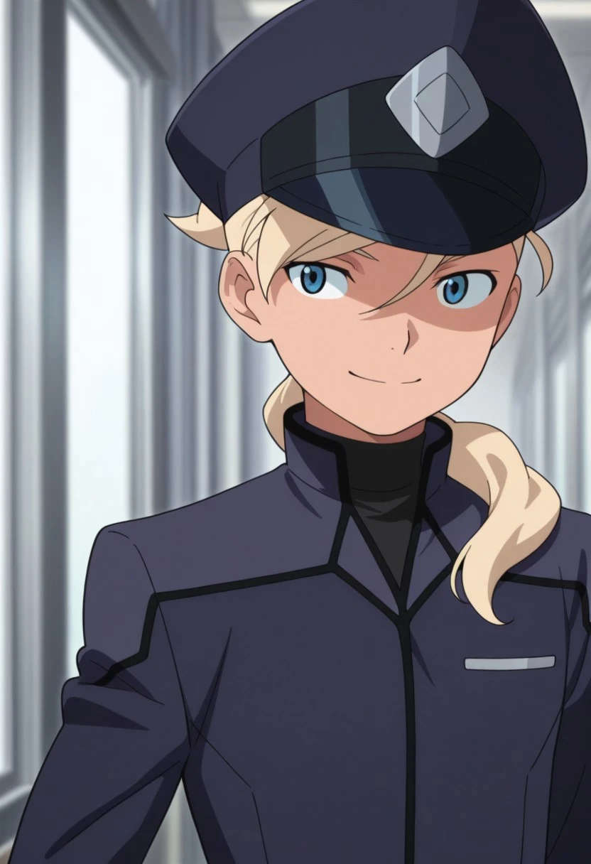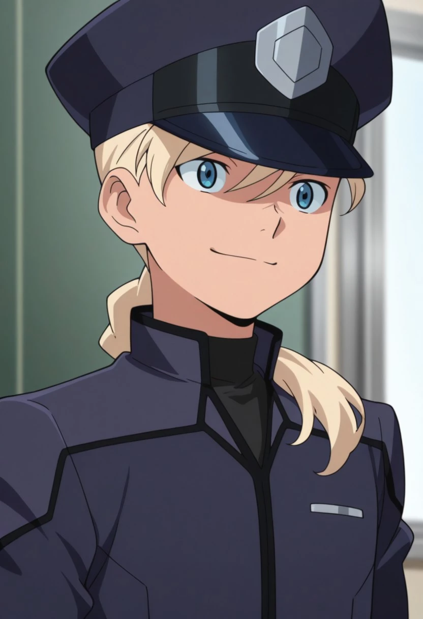 Asemusuno, 1boy, male focus, solo, blue eyes, blonde hair, ponytail, hair over shoulder, school uniform, hat, peaked cap, blue headwear, undershirt, blue jacket, long sleeves, belt, blue pants,