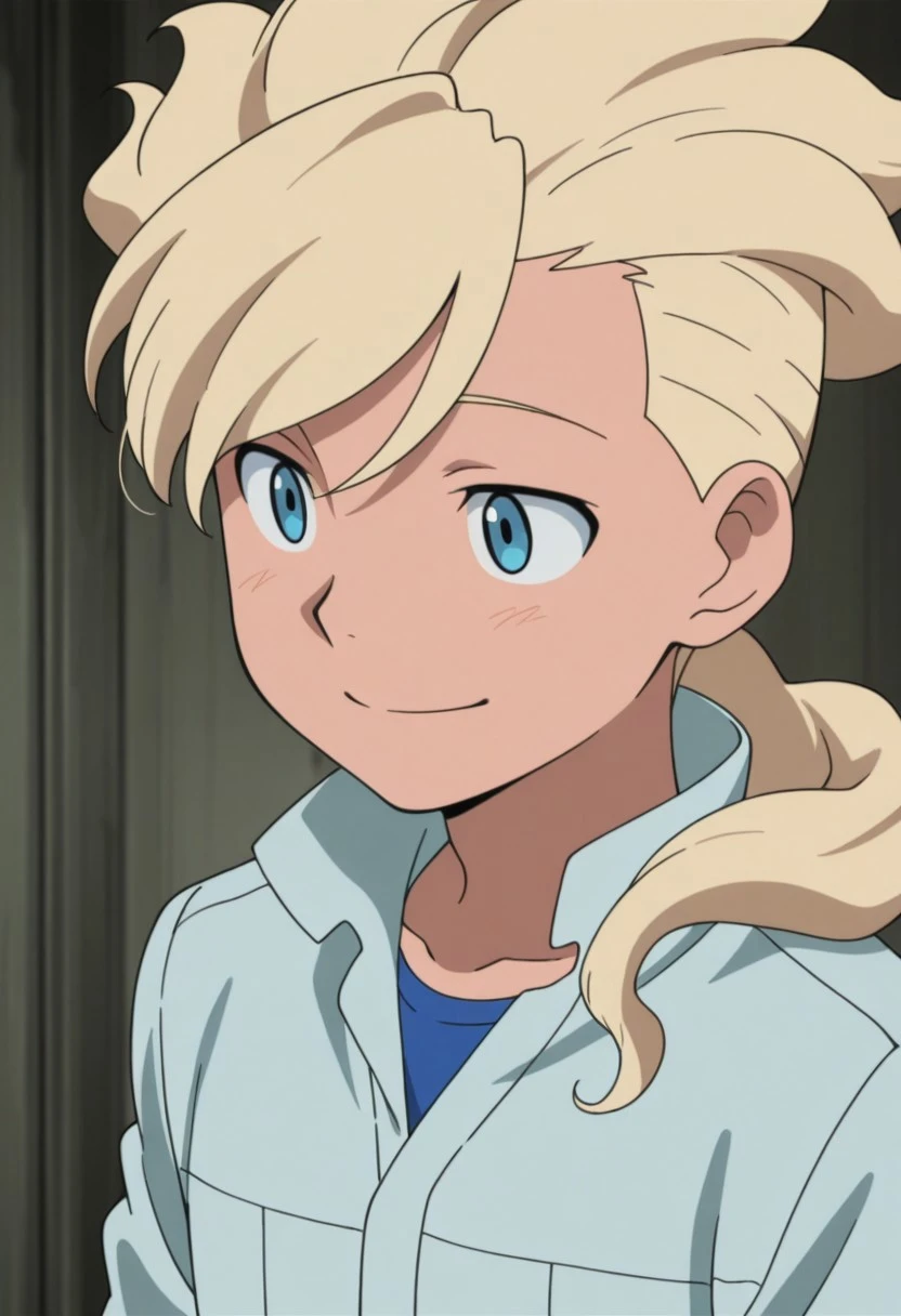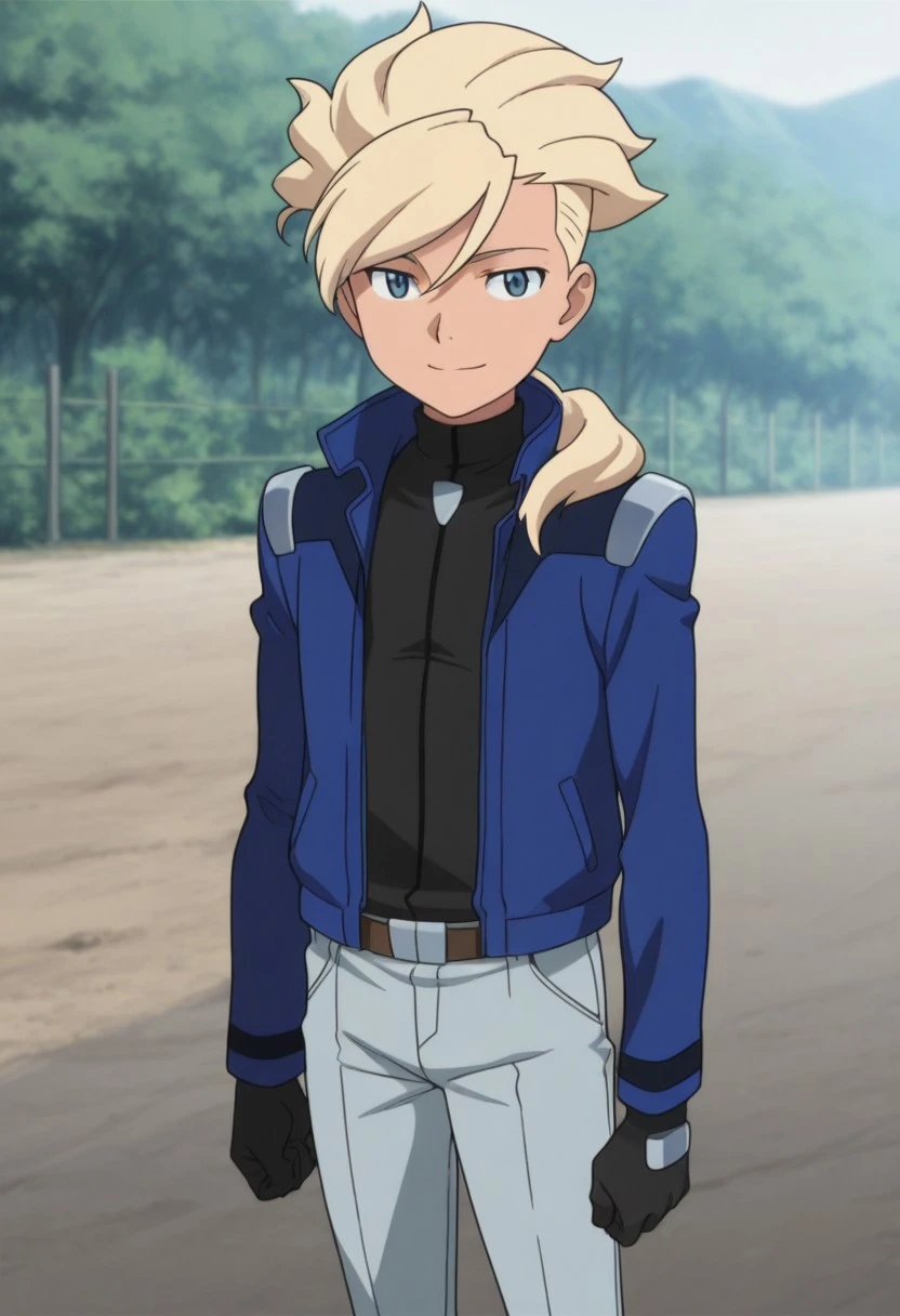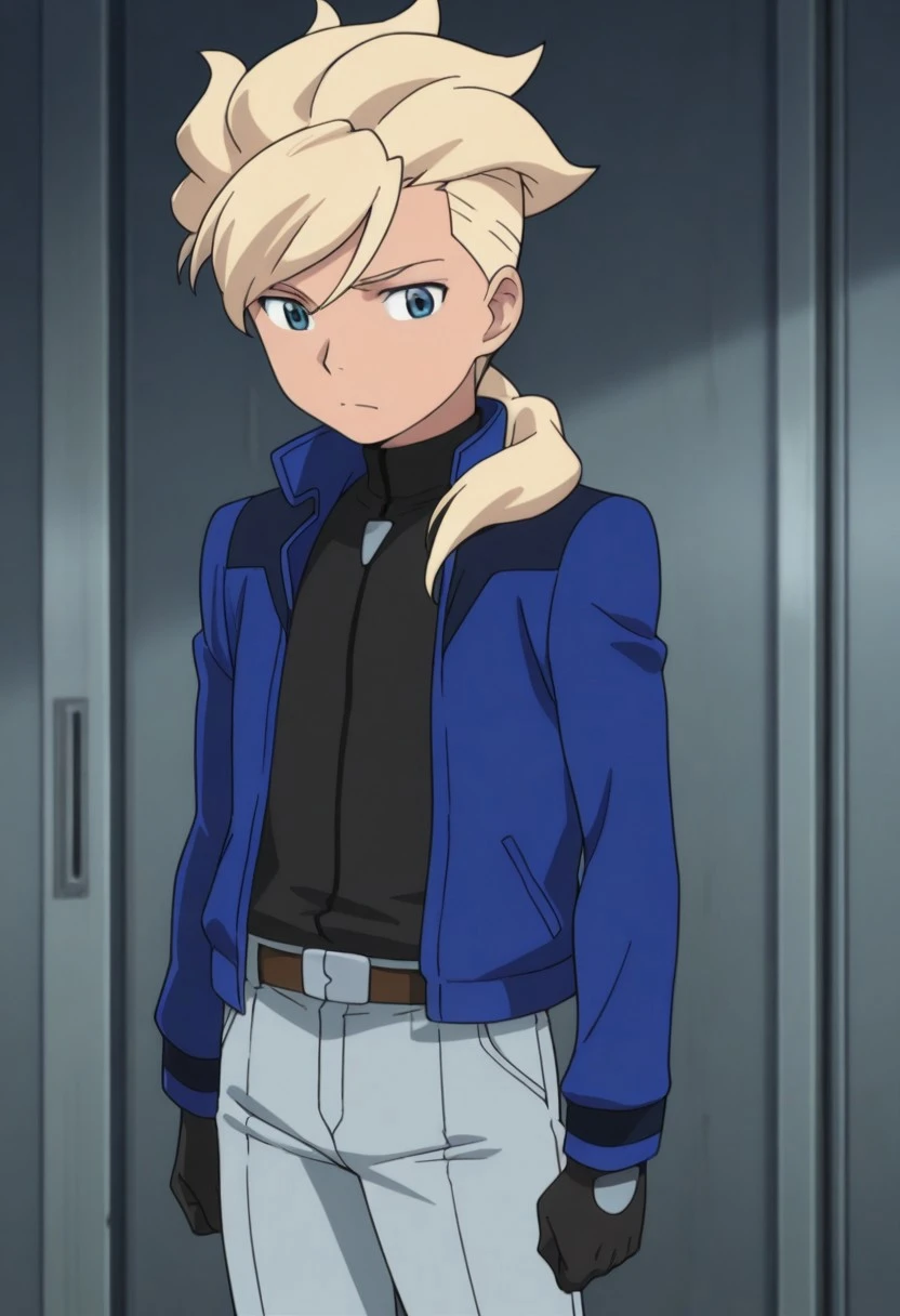 Asemusuno, 1boy, male focus, solo, blue eyes, blonde hair, ponytail, hair over shoulder, blue shirt, grey jumpsuit, black gloves, belt, shoes,