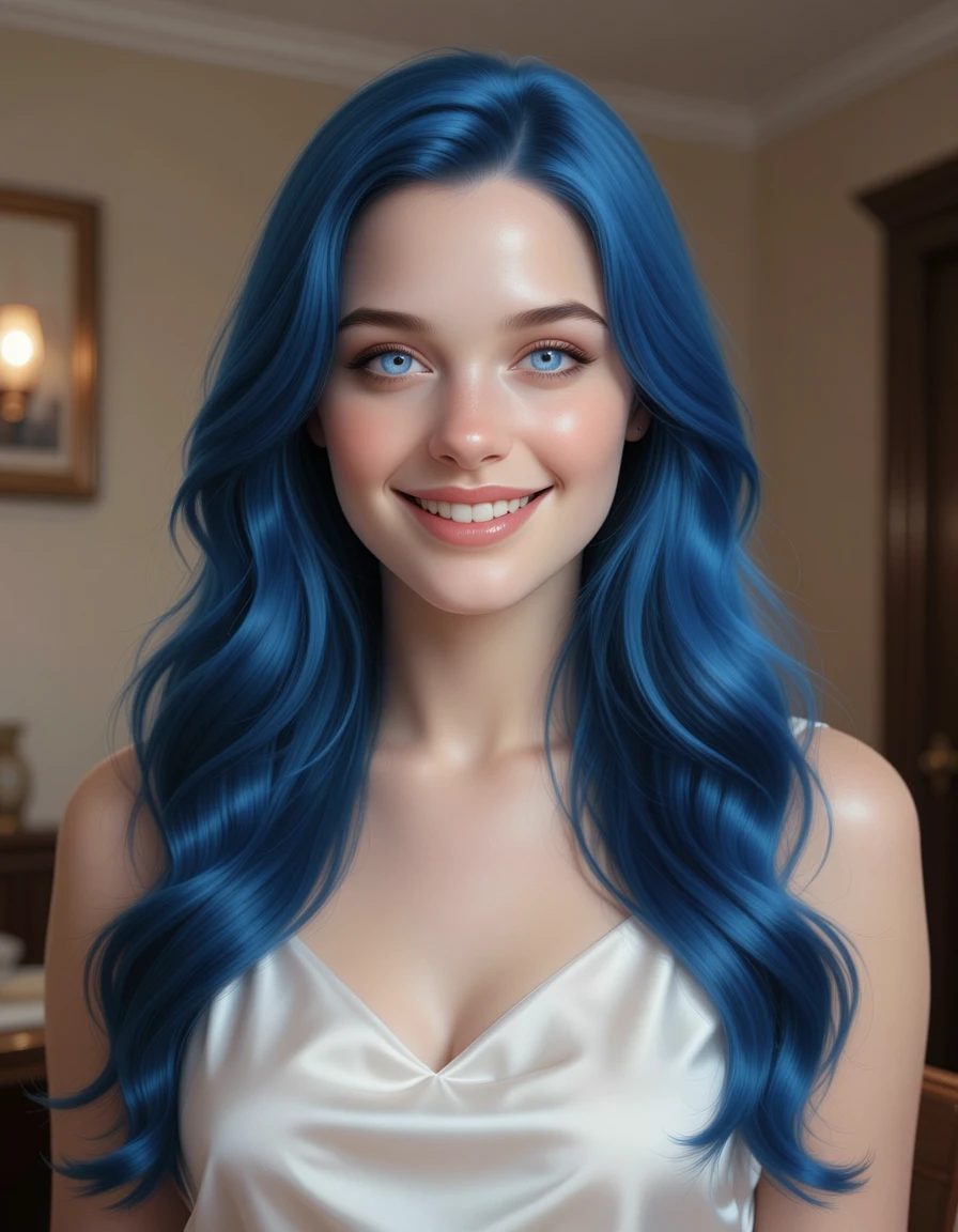 To achieve her authentic look (long dark blue hair and blue eyes), it is highly recommended to use the following prompt structure: