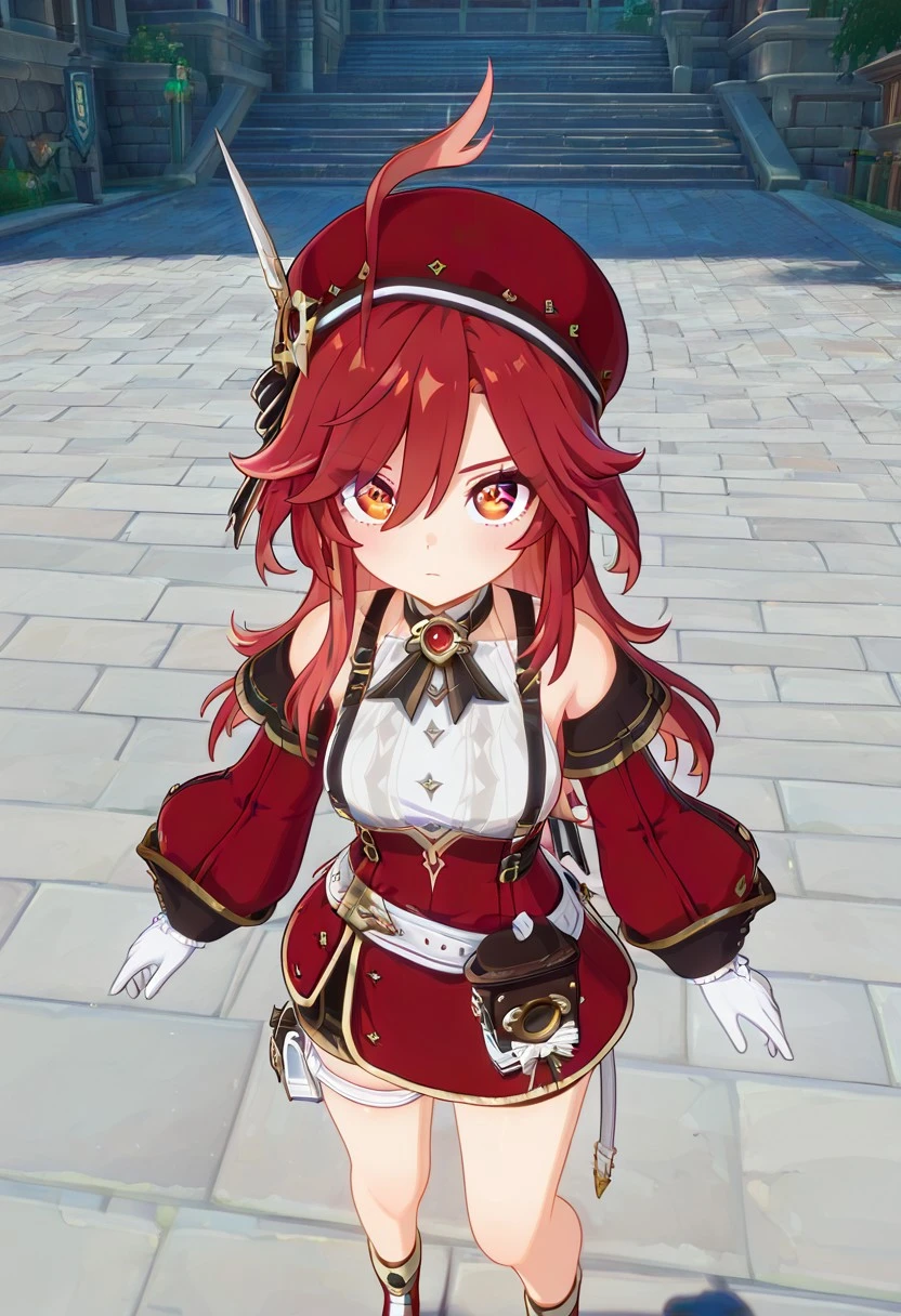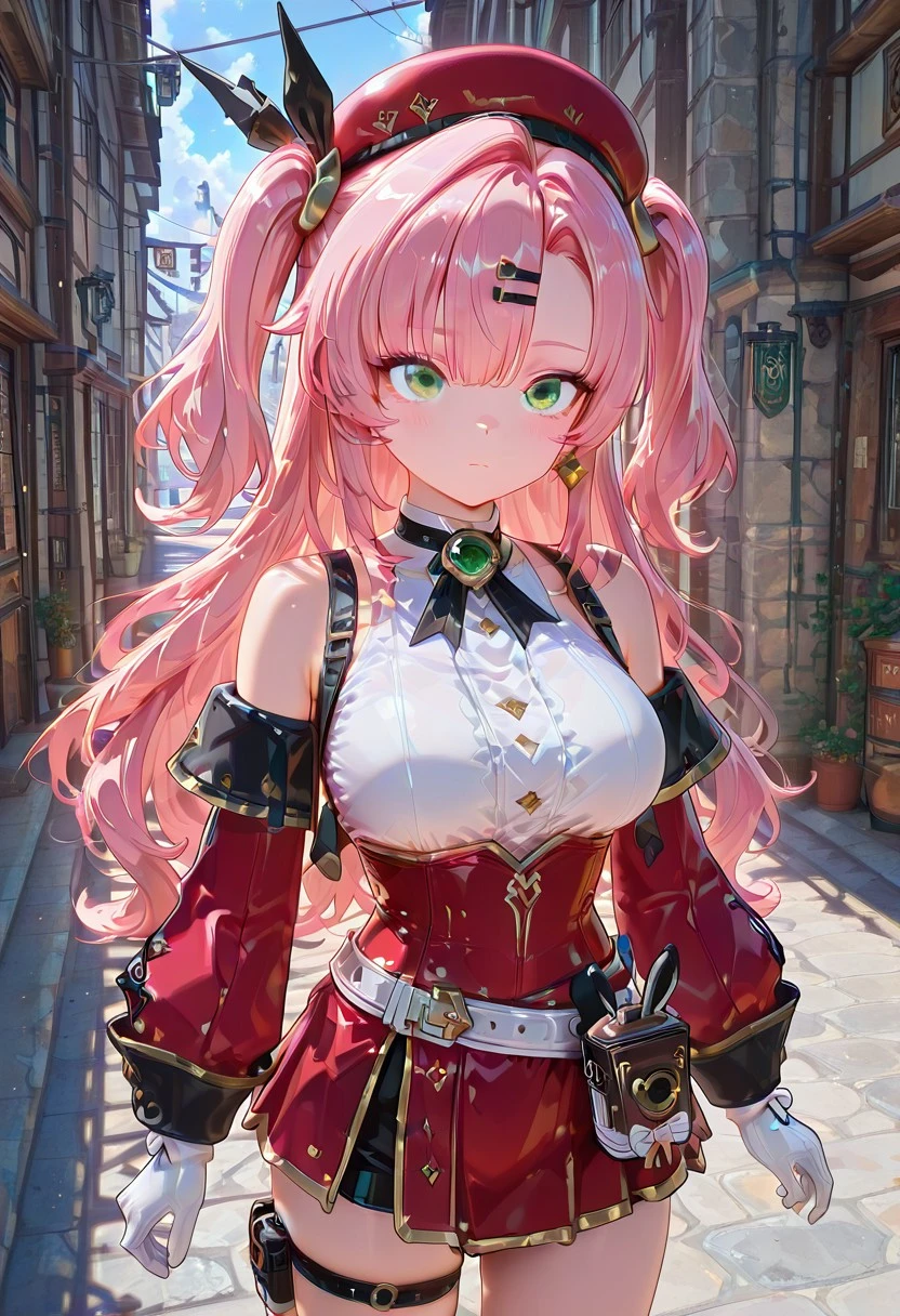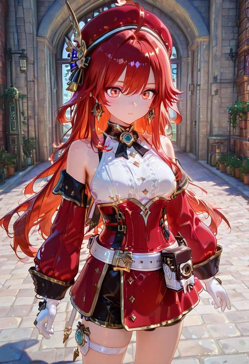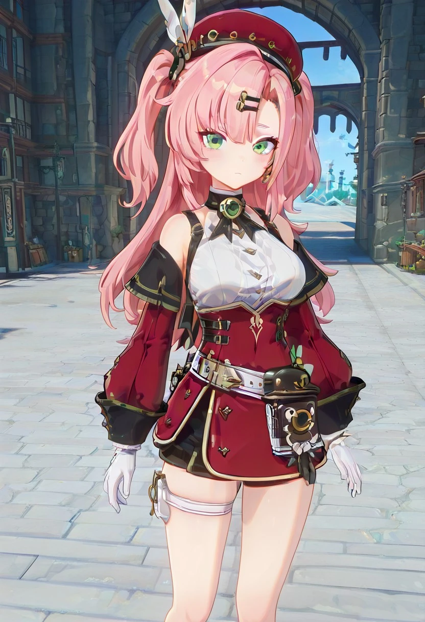 Chrlttclstyl,sleeveless top, white blouse, high collar, gemstone brooch, corset, red corset, gold trim,detached sleeves, long sleeves, red sleeves, white gloves,short skirt, red skirt, black shorts, thigh strap,beret, red hat, hair ornament,belt, waist pouch, satchel, gold accessories, decorative buckles.