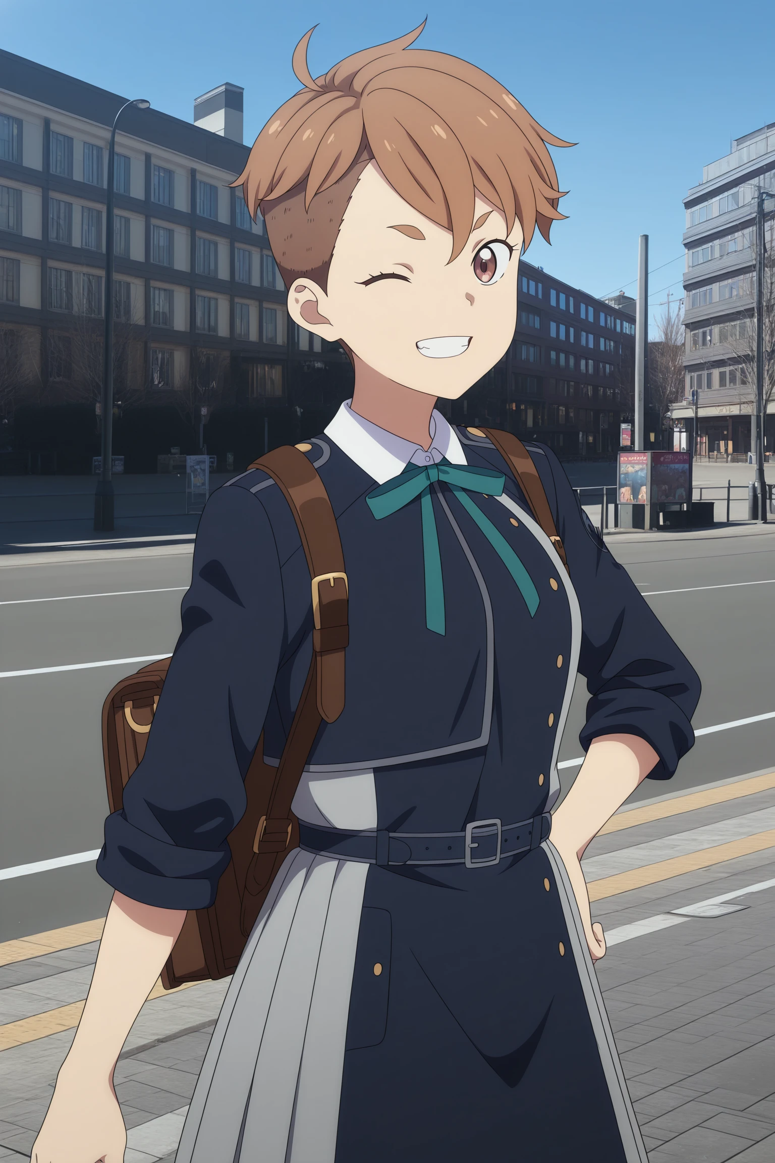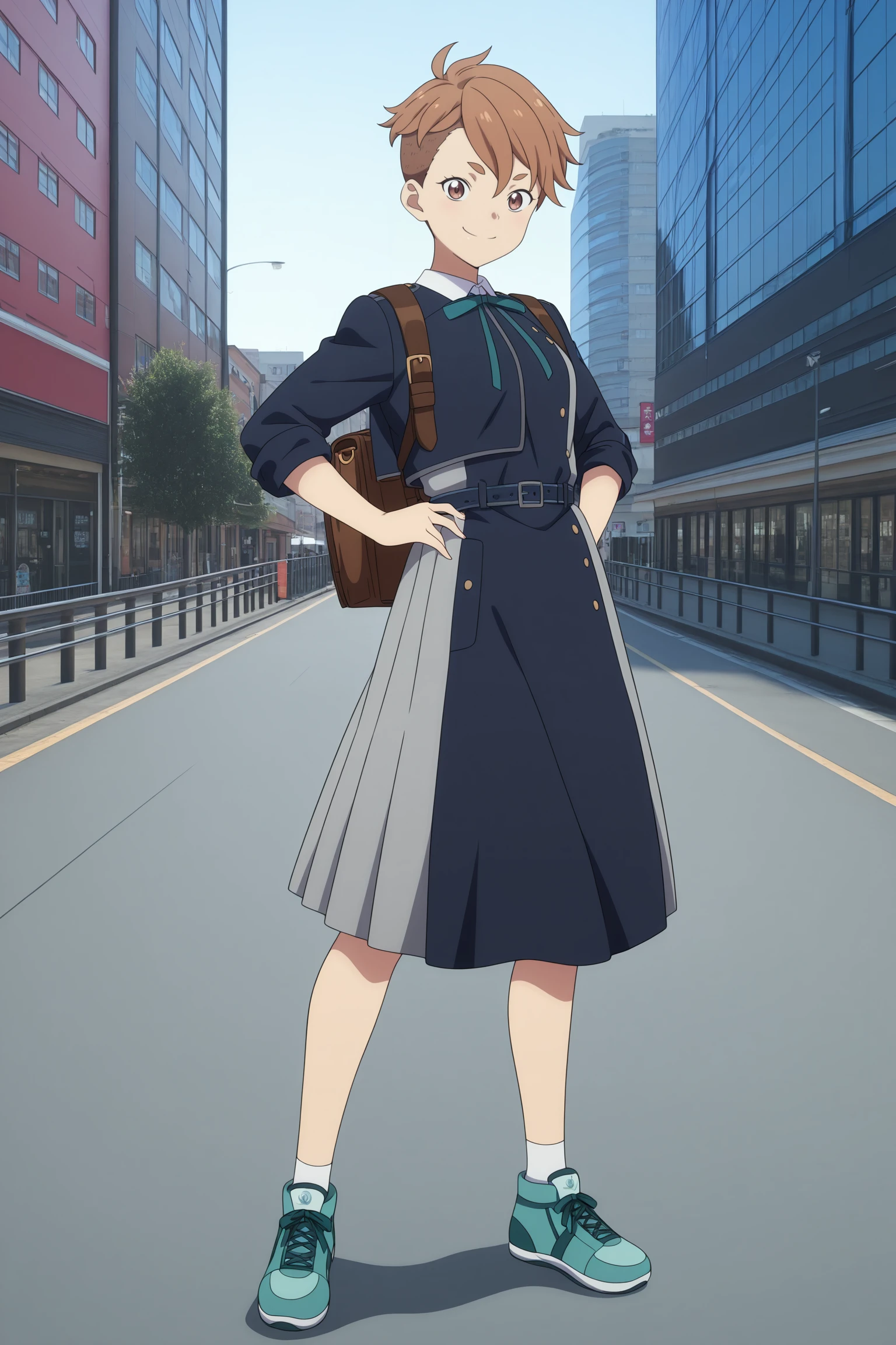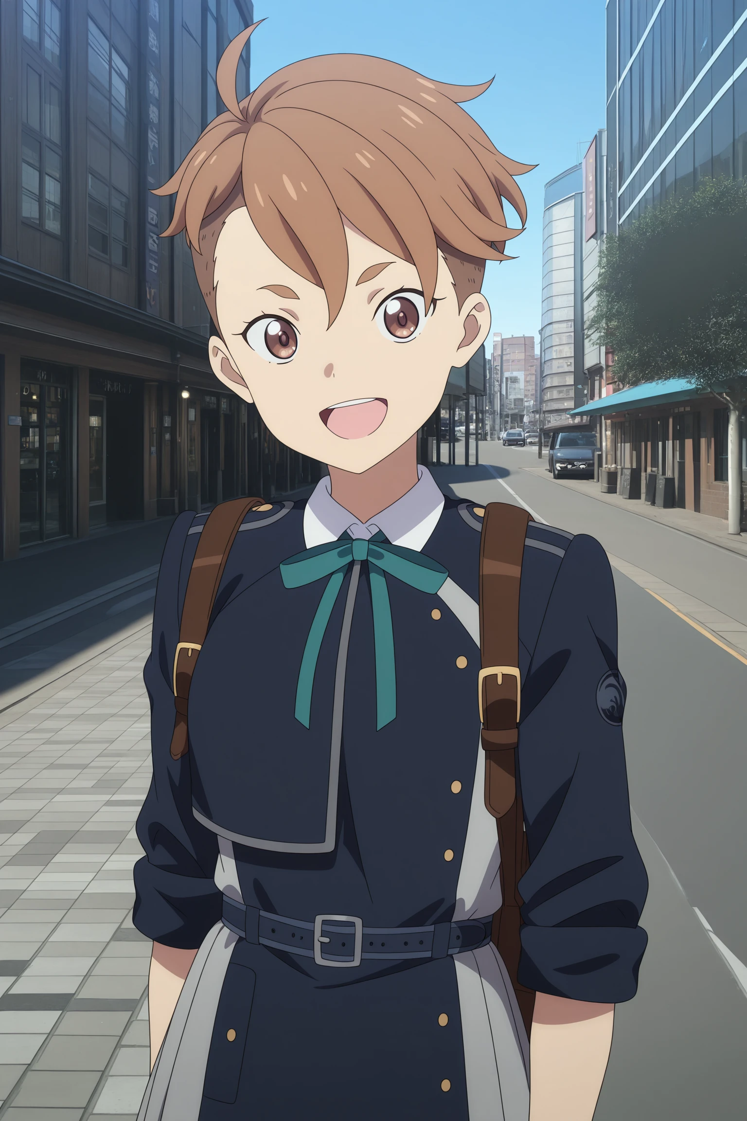 otome sakura, very short hair, brown hair, undercut, asymmetrical hair, brown eyes, sleeves rolled up, two-tone dress, blue dress, grey dress, aqua ribbon, neck ribbon, blue belt, backpack, white socks, ankle socks, aqua shoes, sneakers