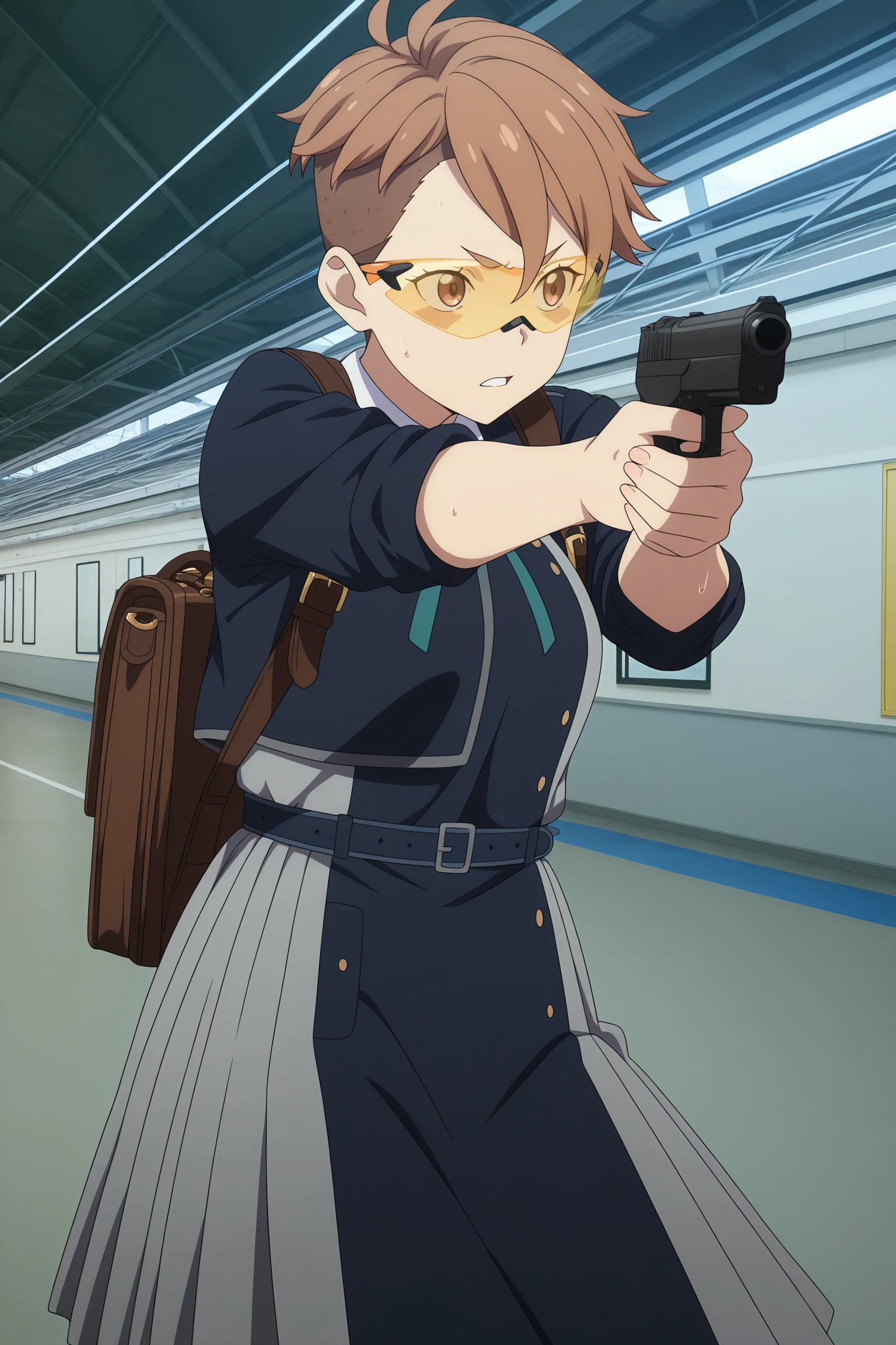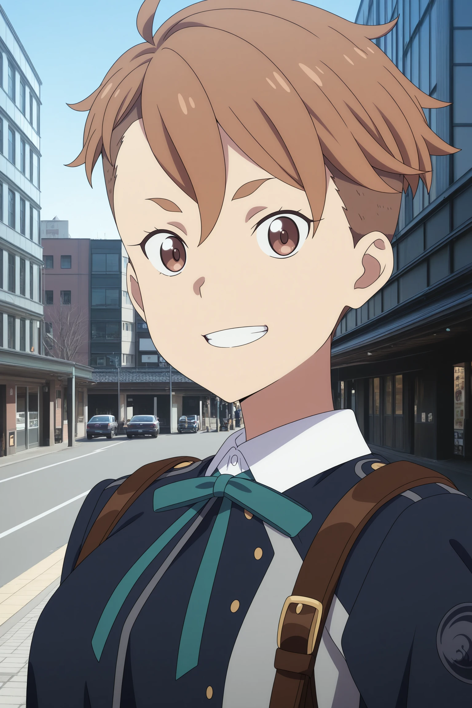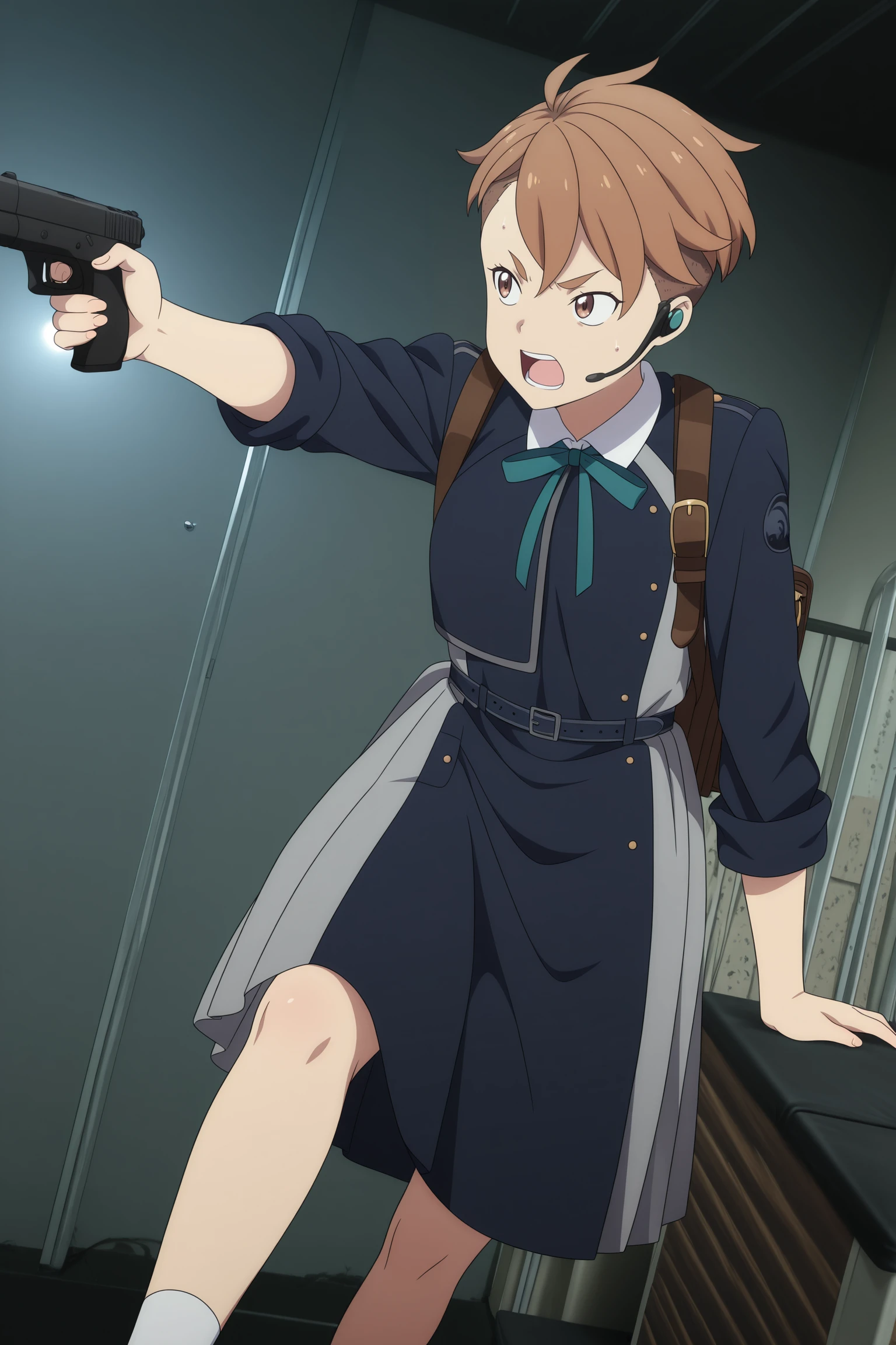 otome sakura, very short hair, brown hair, undercut, asymmetrical hair, brown eyes, sleeves rolled up, two-tone dress, blue dress, grey dress, aqua ribbon, neck ribbon, blue belt, backpack, white socks, ankle socks, aqua shoes, sneakers