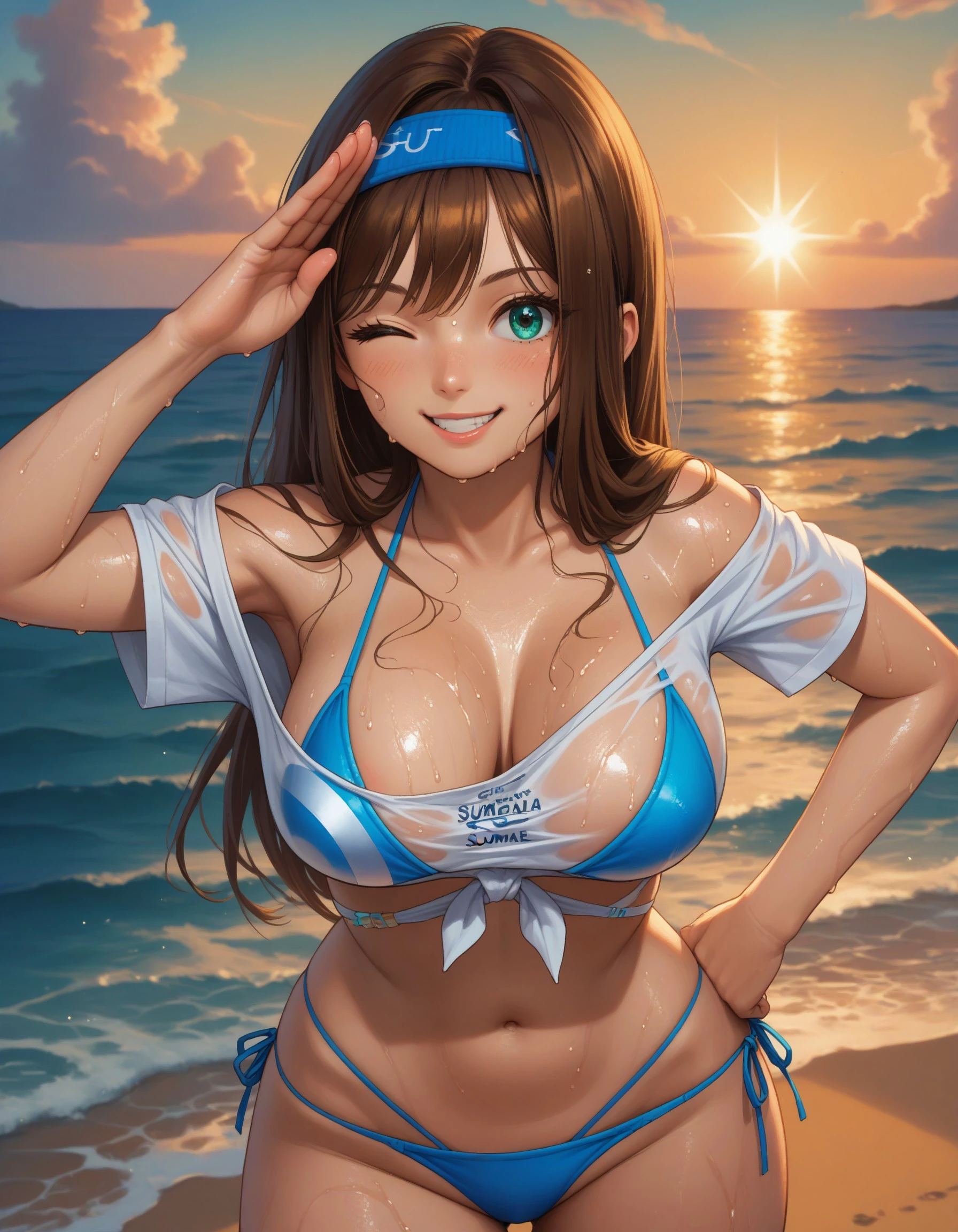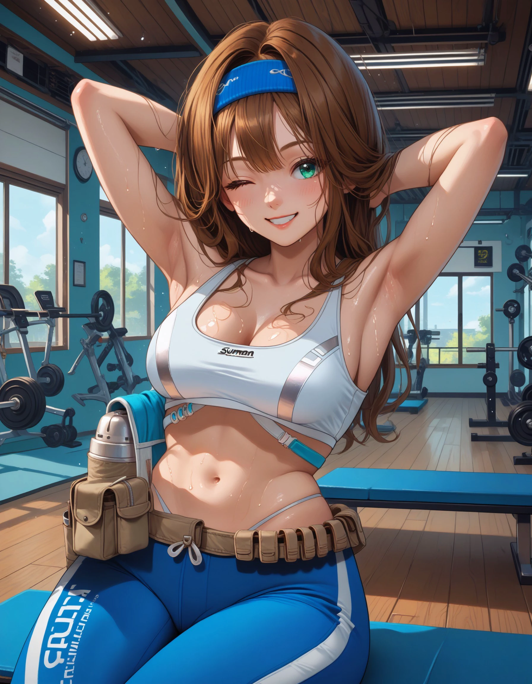 rumanink, aqua eyes, long hair, brown hair, hairband, large breasts, white sports bra, yoga pants, utility belt, sneakers, highleg panties, thong, knee pads