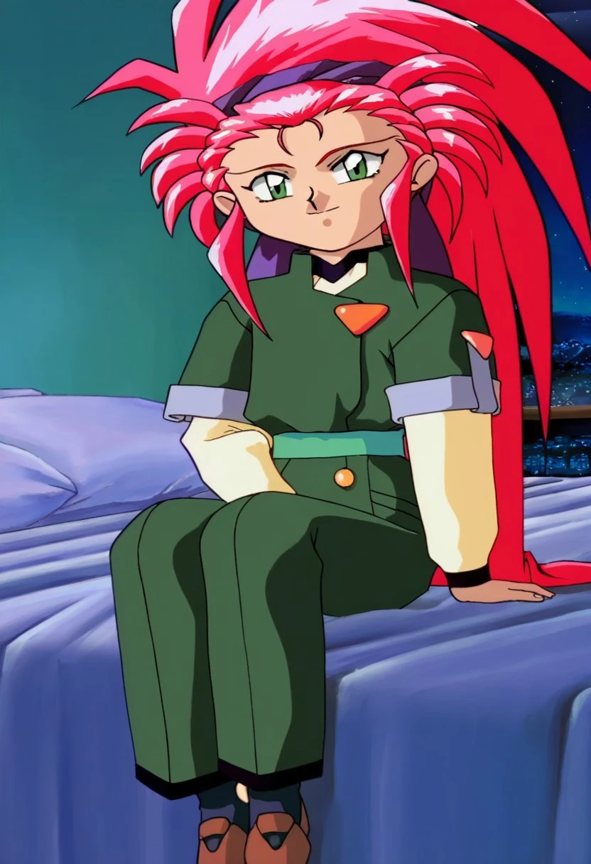 masterpiece,4K,best quality, amazing quality,official Tenchi Muyo art style,screencap,on model,2d animation, digital drawing \(artwork\), retro anime \(style\), flat colors,Washu, Washu Hakubi,long hair,red hair,spiky hair,short stature,modest proportions,ponytail hairstyle,1990's style retro anime,