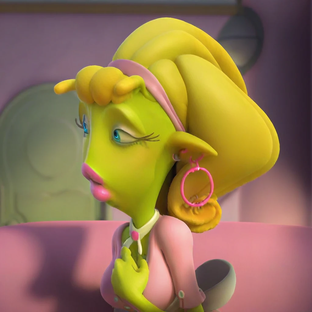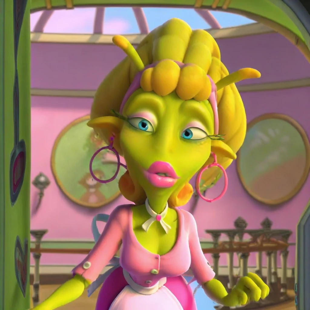 Mom, alien girl, humanoid, green skin, pointy ears, hoop earrings, blue eyes, blonde hair, beehive hair, antenna on head, thick lips, pink lips, neck collar, pink button up shirt, pink dress, apron