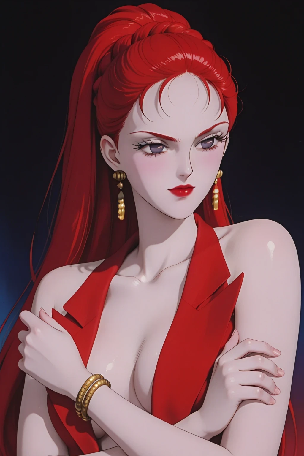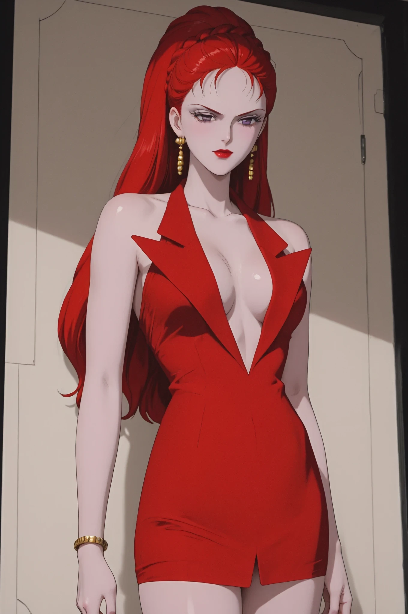 (masterpiece, best quality:1.2), 1girl, solo, _SM_Kaolinite_, red straight hair, forehead, bare shoulders, tight red dress with V-neck, pale pink skin, purple eyes, golden bracelet, gold earrings, white skin, Alone, red classic high heels, red lips makeup, hair slicked back, Ponytail braid, formal dress, LONG EYELASHES, Thick eyelashes,
