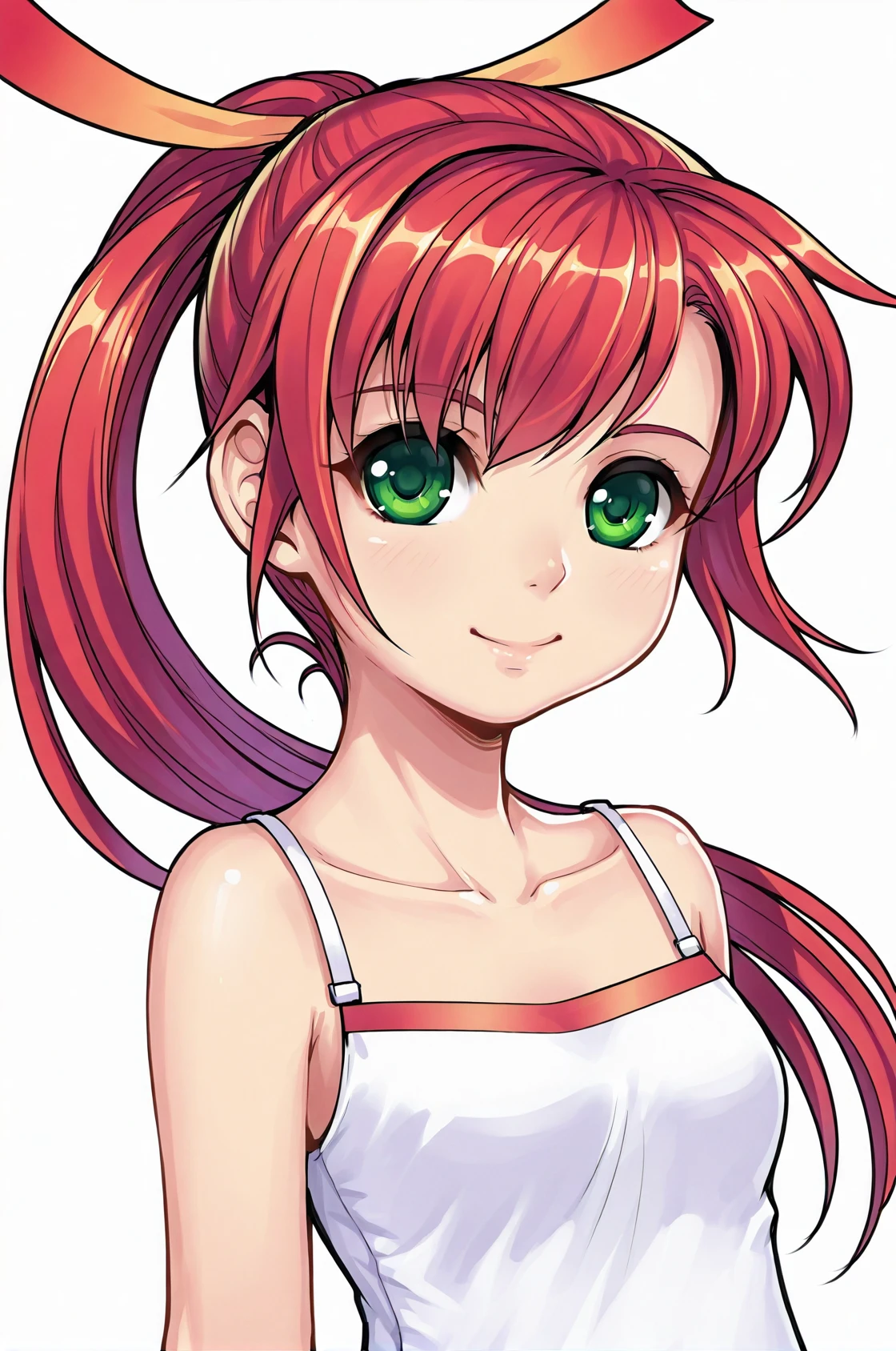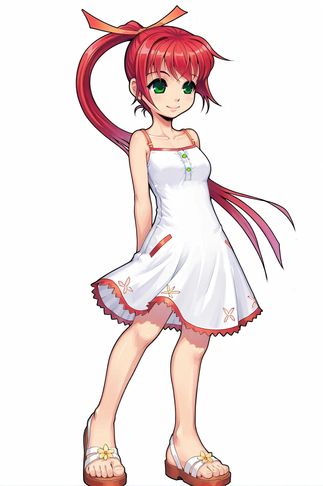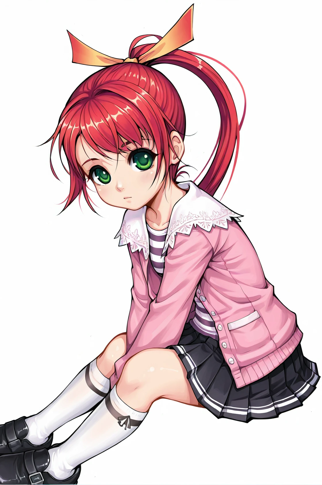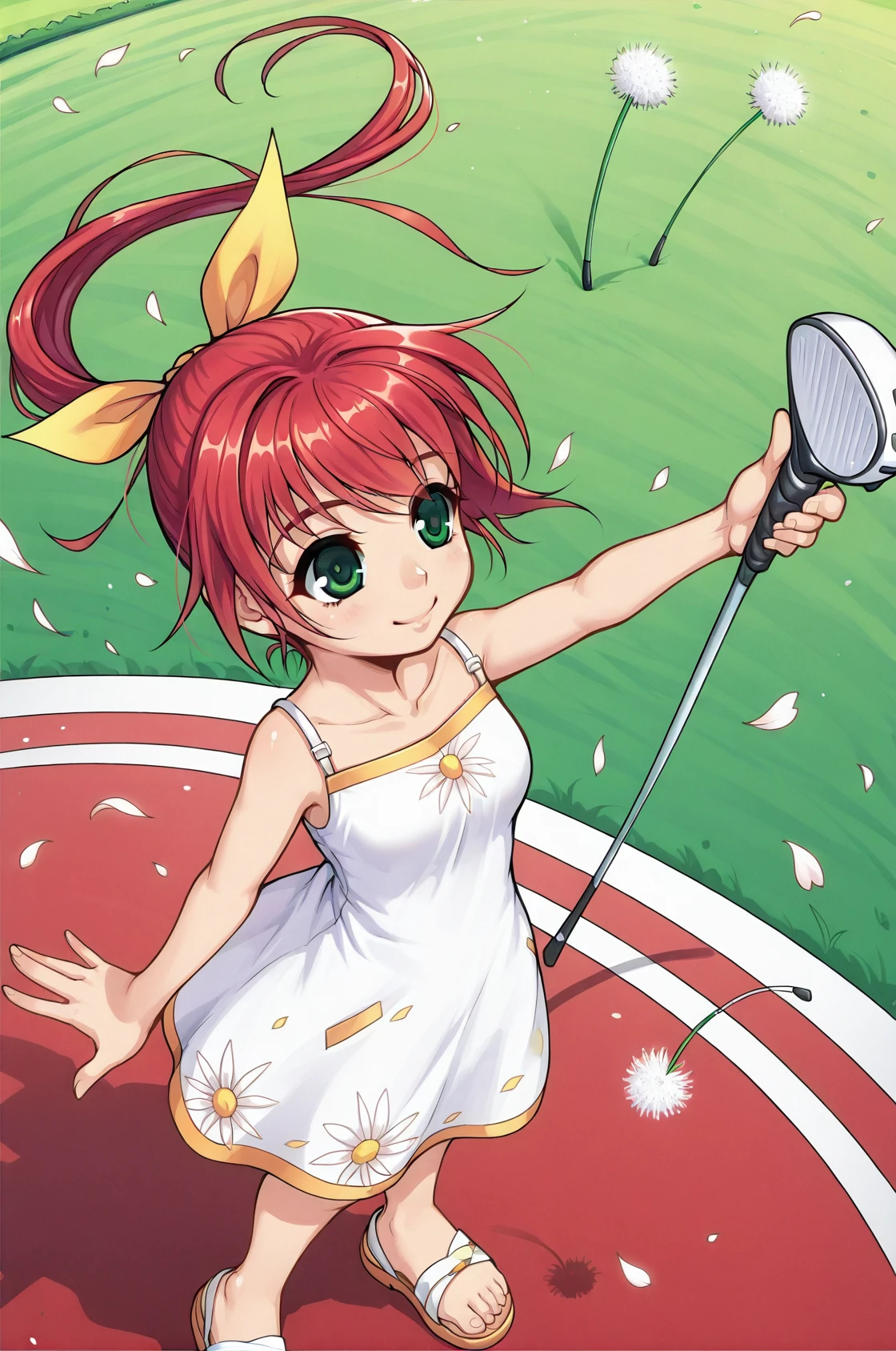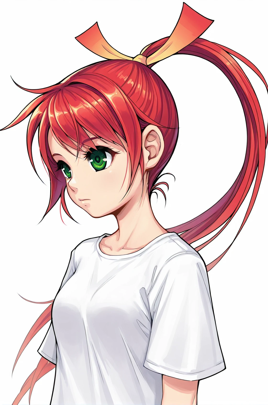 prompt: hanaPangya, green eyes, red hair, yellow hair ribbon, ponytail