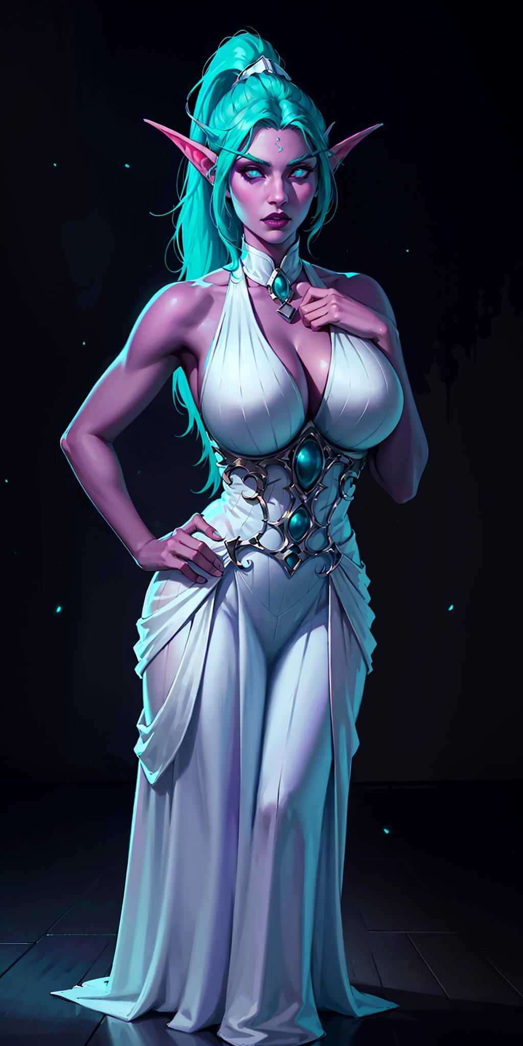To summon her use the following tags: tyrande whisperwind, night elf, 1girl, pointy ears, long hair, green hair, colored skin, jewelry, medium breasts or large breasts, looking at viewer, earring
