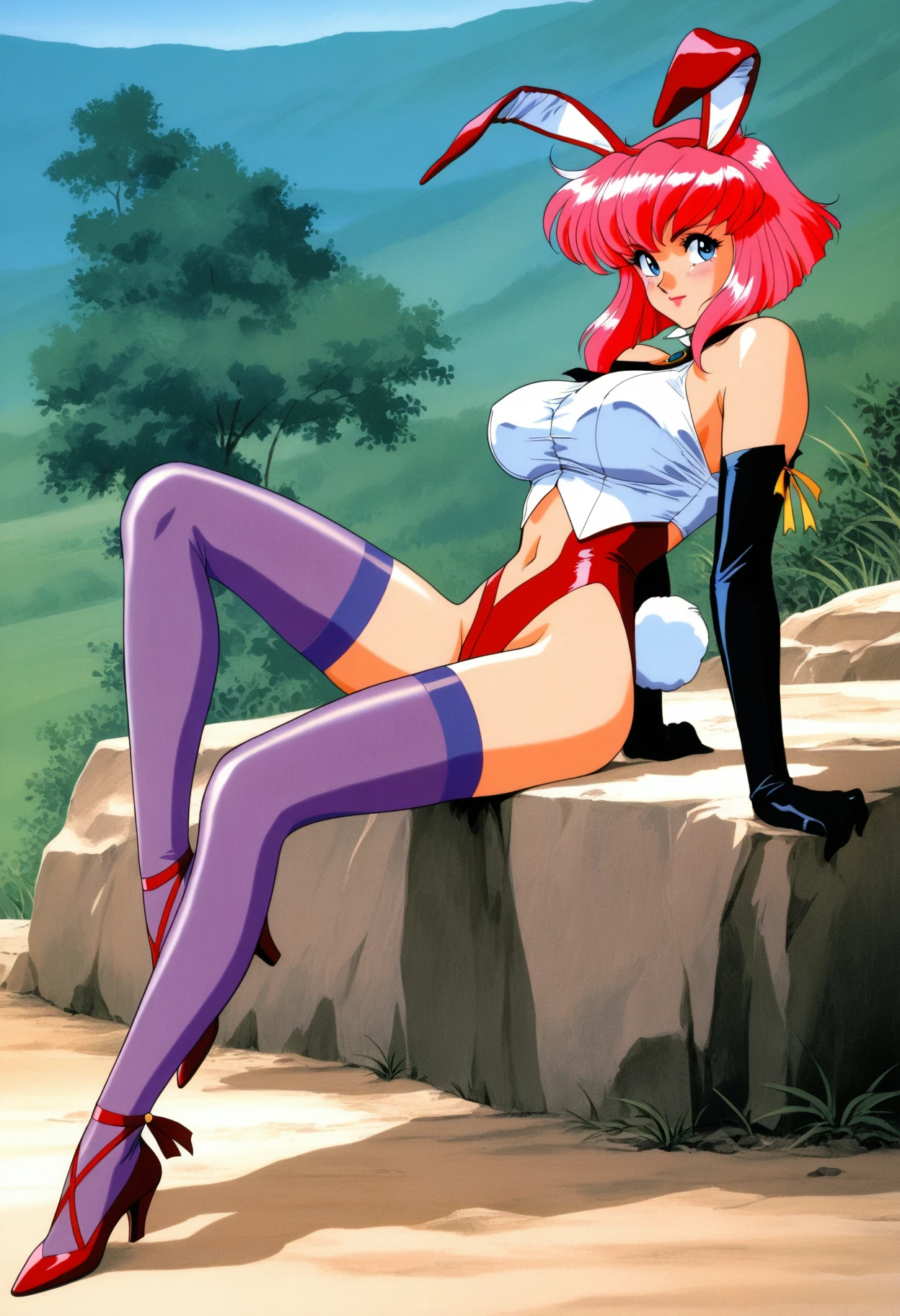 misty_may, rabbit ears, fake animal ears, pink hair,blue eyes,lipstick,makeup, large breasts,