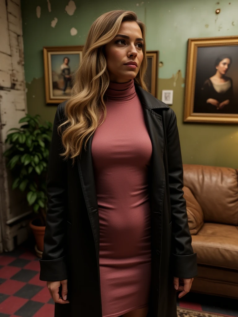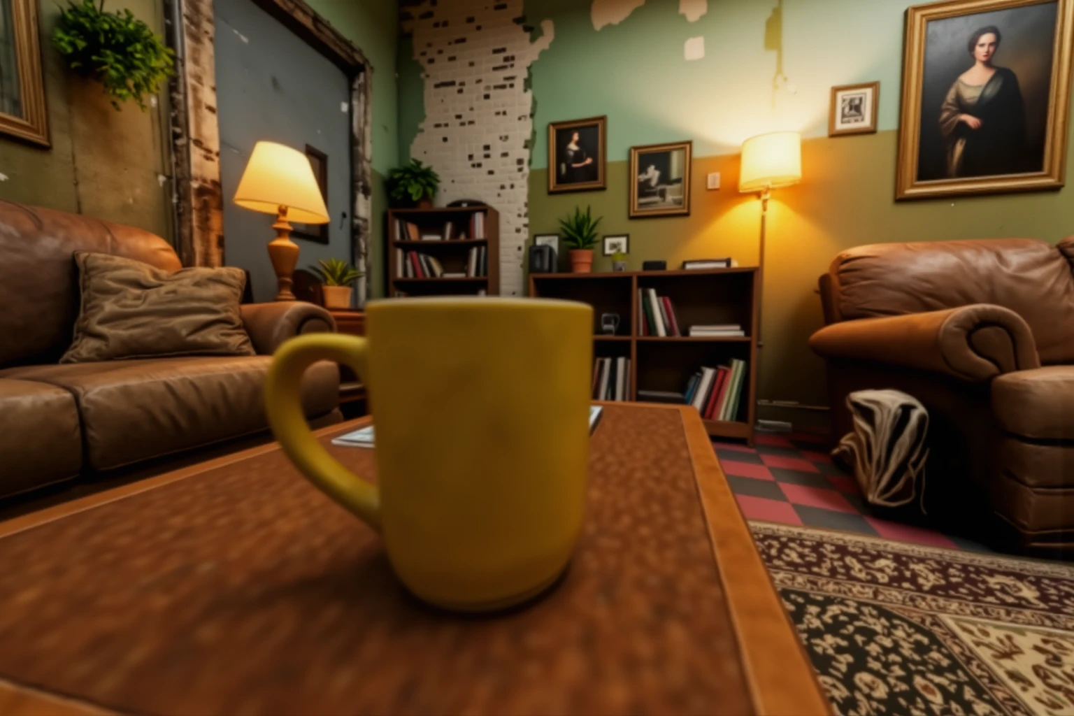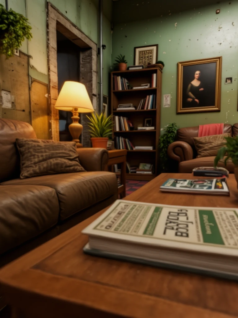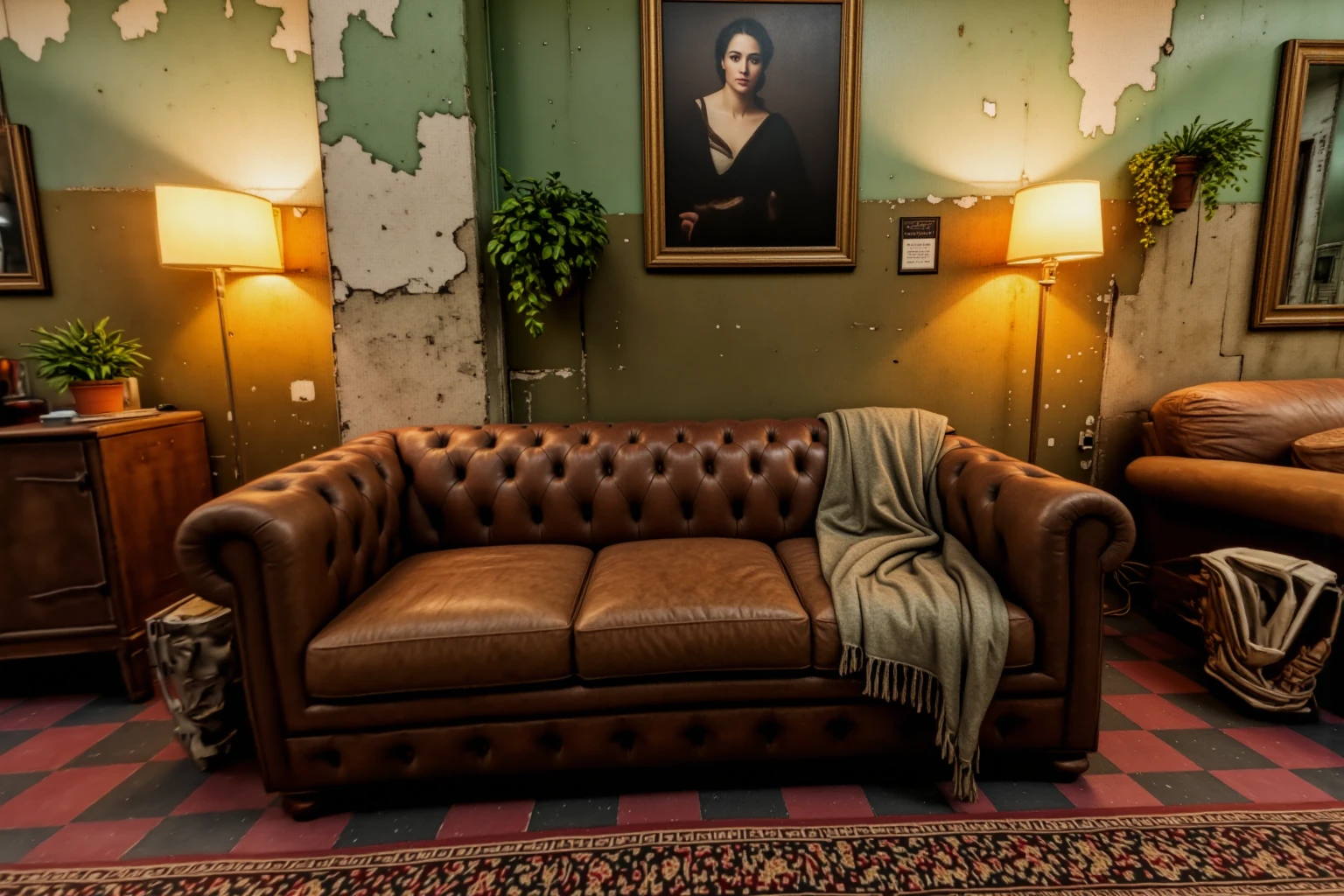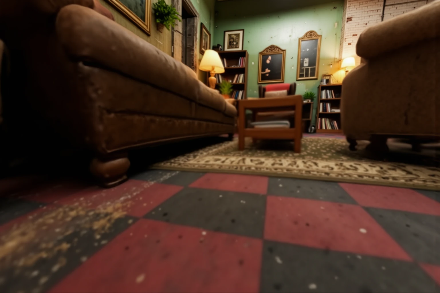 library-style living room, interior with a warm, spacious vintage lived-in atmosphere and softly aged character. The room features multiple seating areas arranged around wooden furniture, including leather sofas and fabric armchairs, set on layered oriental rugs over a red-and-black checkered tile floor. Tall wooden bookcases filled with books line the walls, interspersed with framed paintings, mirrors, and small decorative objects. The walls are painted a muted green with peeling, distressed textures revealing age and wear. Warm table lamps and floor lamps cast soft amber light, creating cozy pools of illumination, while overhead fluorescent lights provide subtle ambient fill. Potted plants add organic accents throughout the space. The overall lighting is balanced and warm, with gentle shadows, emphasizing a calm, intimate, and nostalgic interior environment suitable for reading, conversation, and quiet retreat