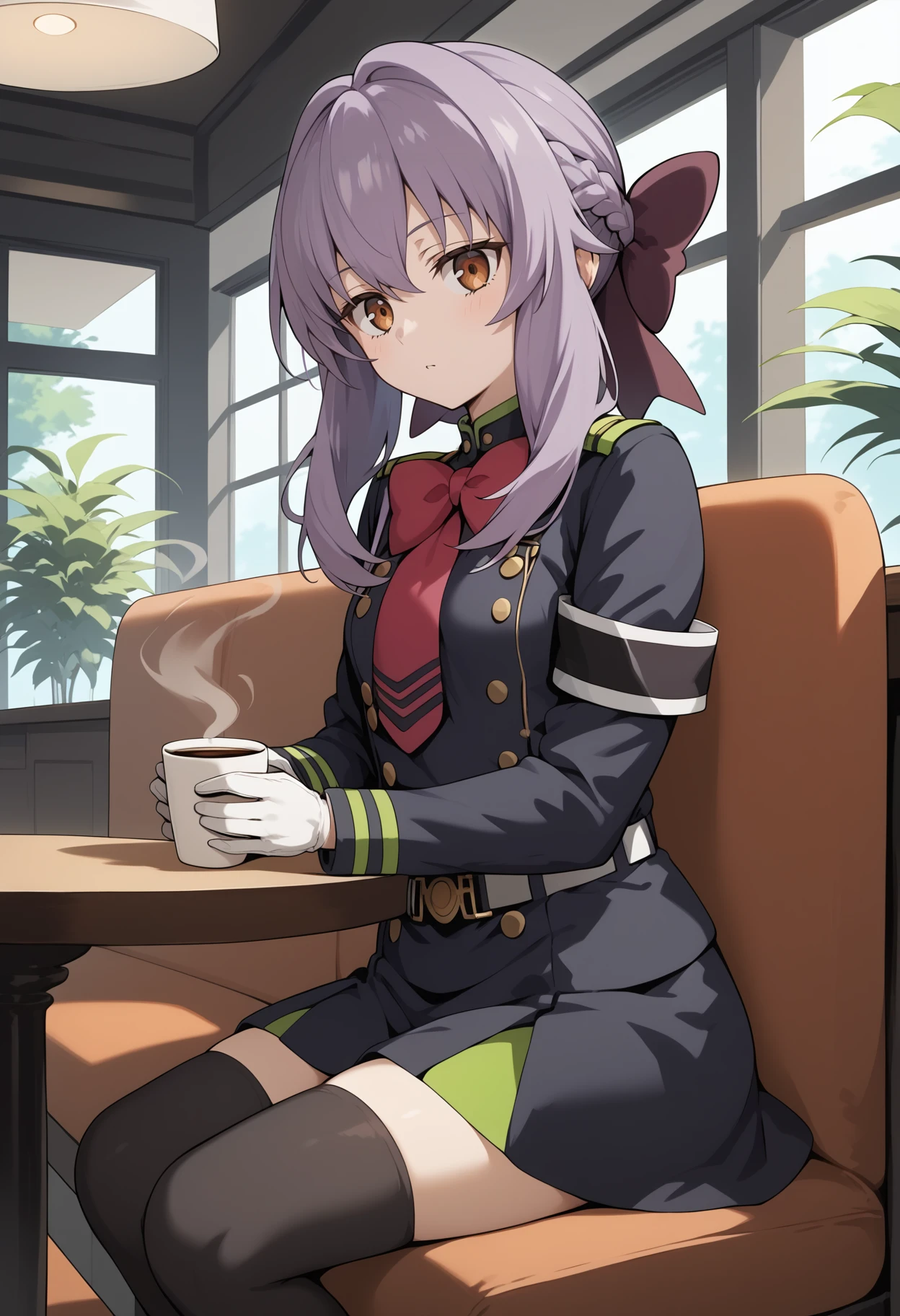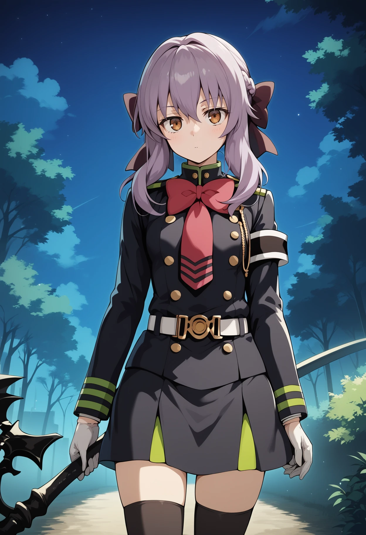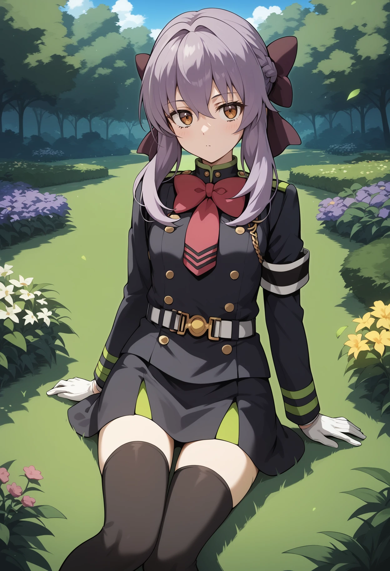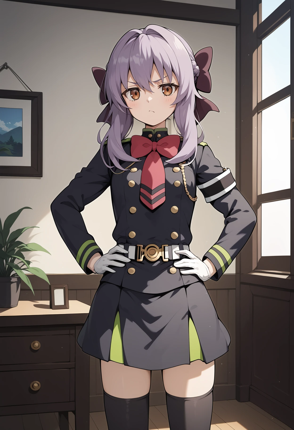 aashinoa, long hair, purple hair, hair bow, brown eyes, small breasts, military uniform, red bowtie, black dress, long sleeves, armband, white gloves, belt, black thighhighs
