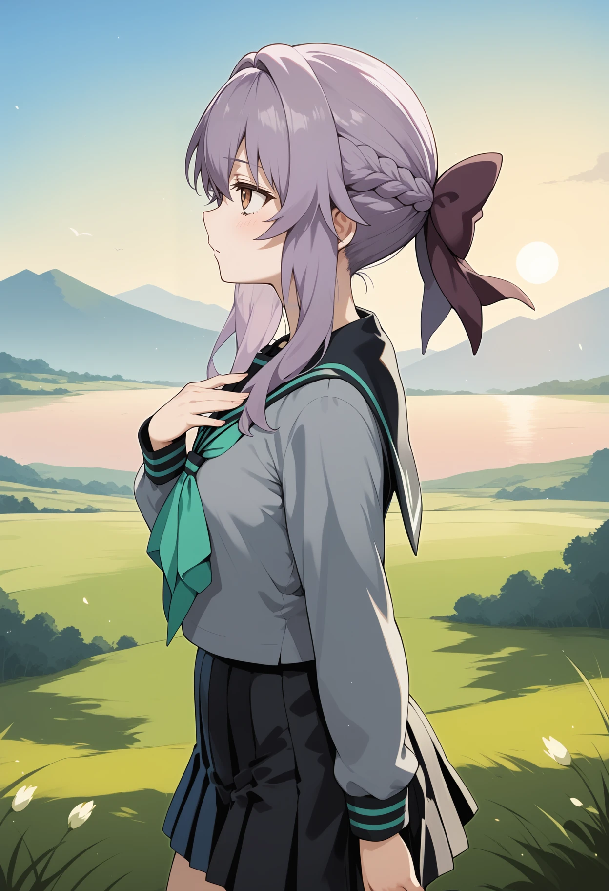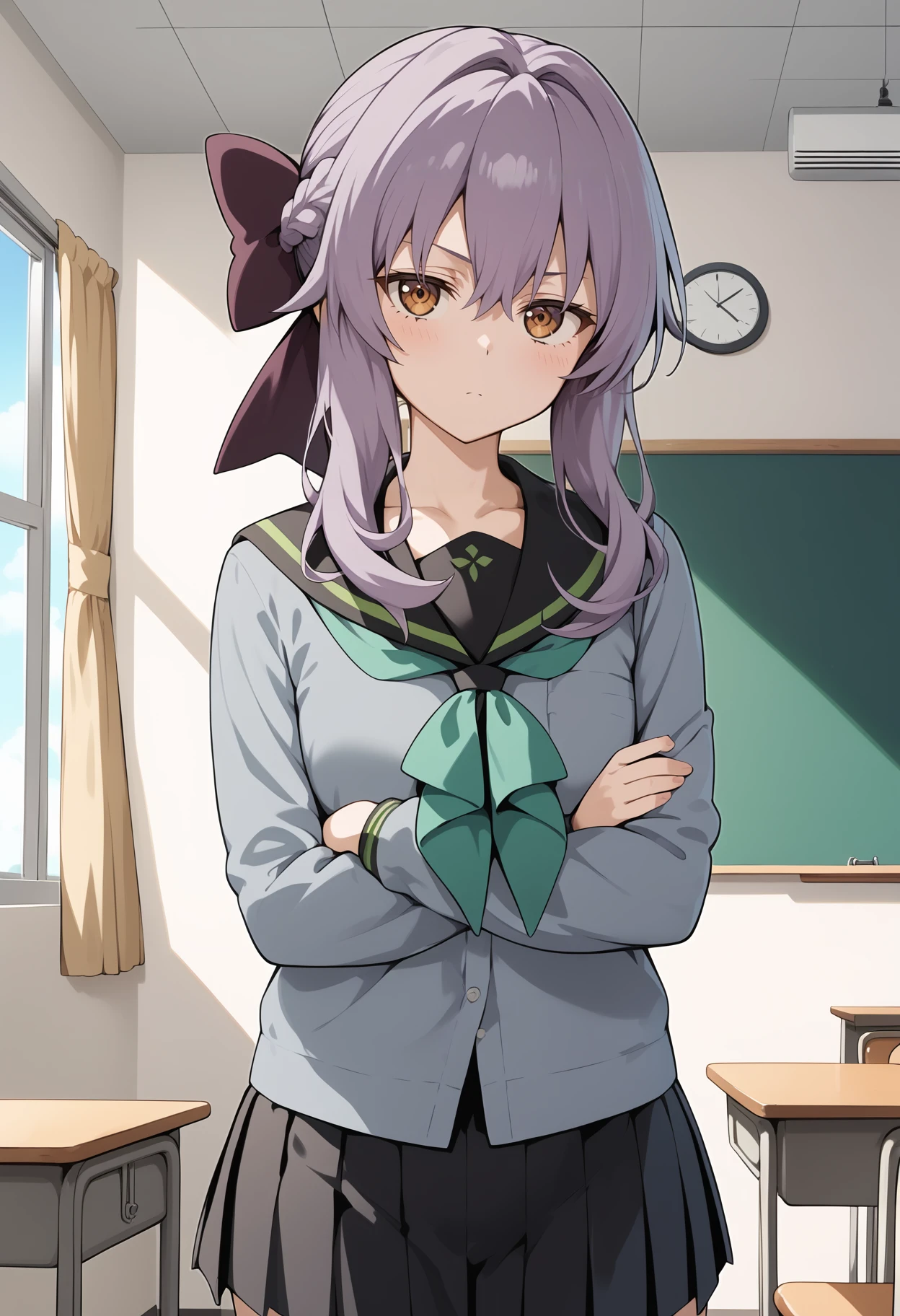 aashinoa, long hair, purple hair, hair bow, brown eyes, small breasts, school uniform, black sailor collar, green neckerchief, grey shirt, long sleeves, pleated skirt, black skirt