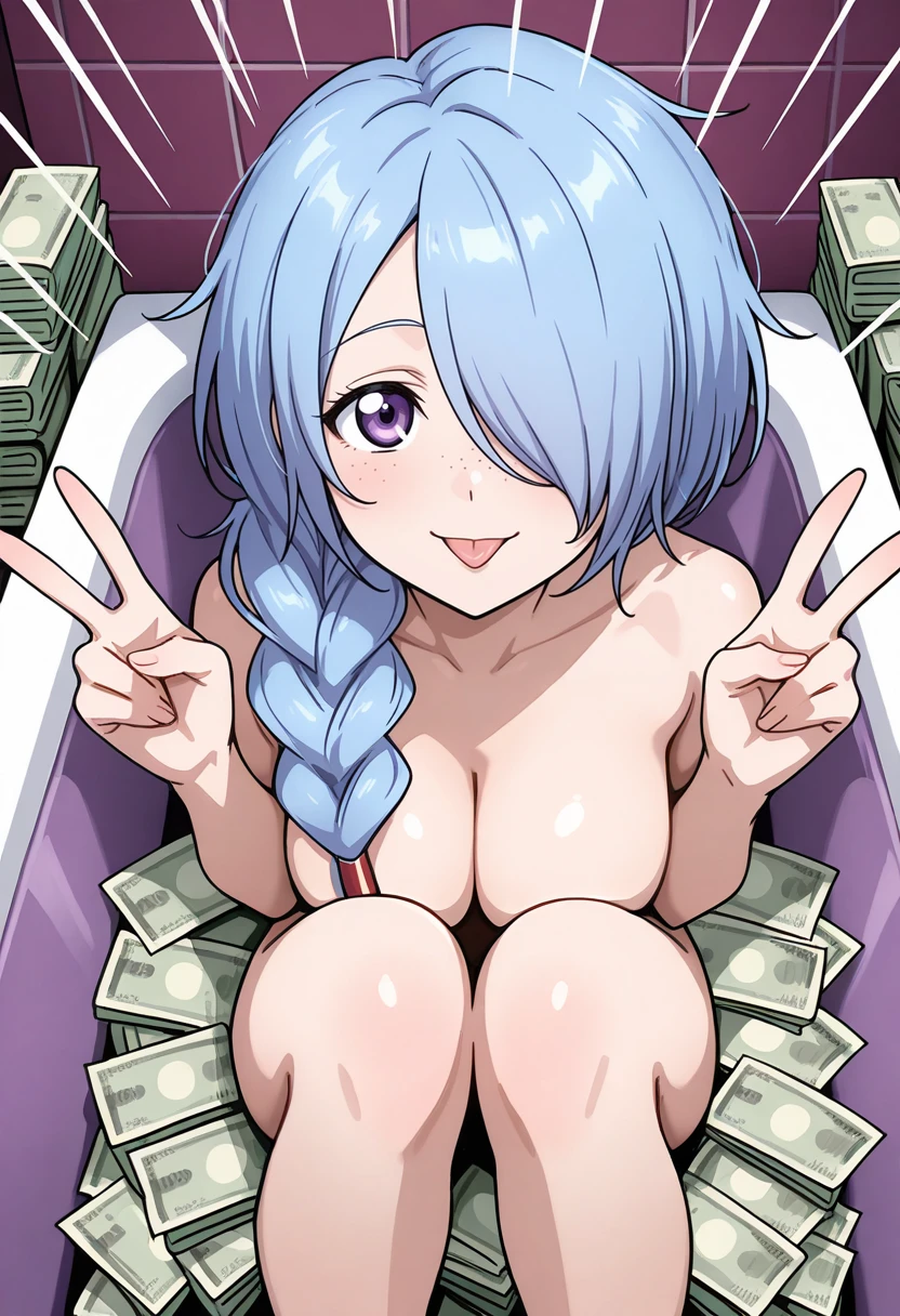 bodysuit, detached sleeves, green fingerless gloves, cleavage cutout, navel cutout, black panties, bare shoulders, bare thighs, blue hair, hair over one eye, long hair, single braid, face freckles, purple eyes