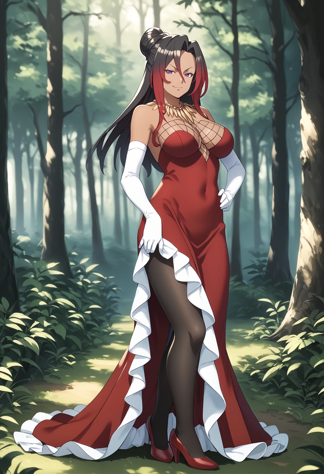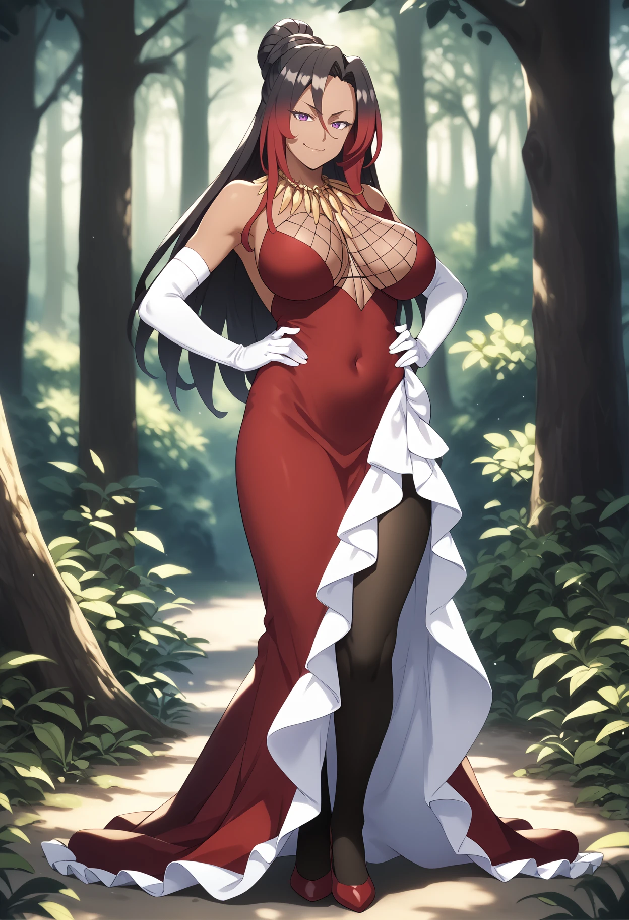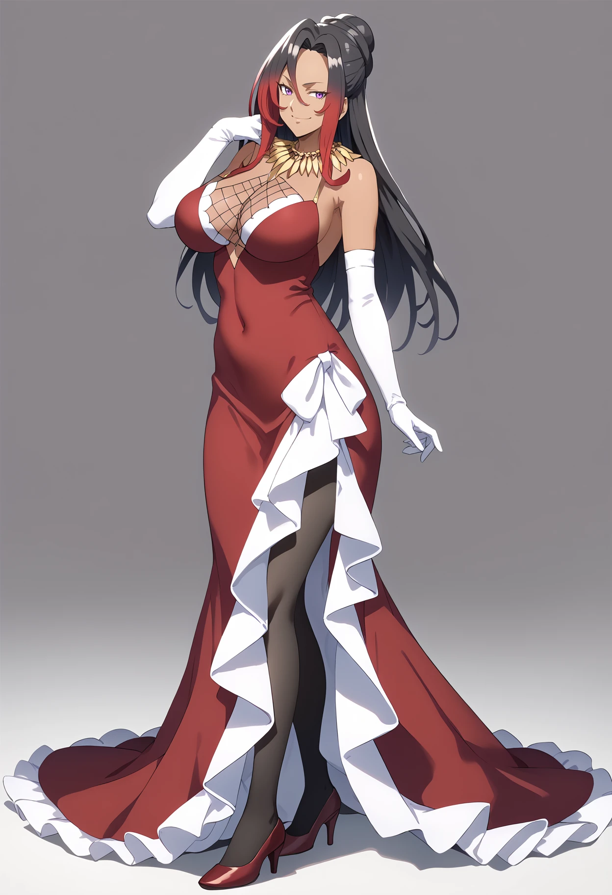 Outfit prompts : necklace, large breasts, red dress, white elbow gloves, black pantyhose, red high heels