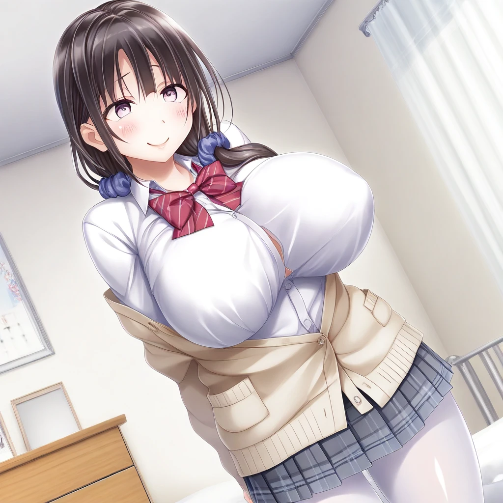Recommend Prompt:Ikue Kogure, purple eyes, black hair, long hair, low sidetail, hair scrunchie, bangs,