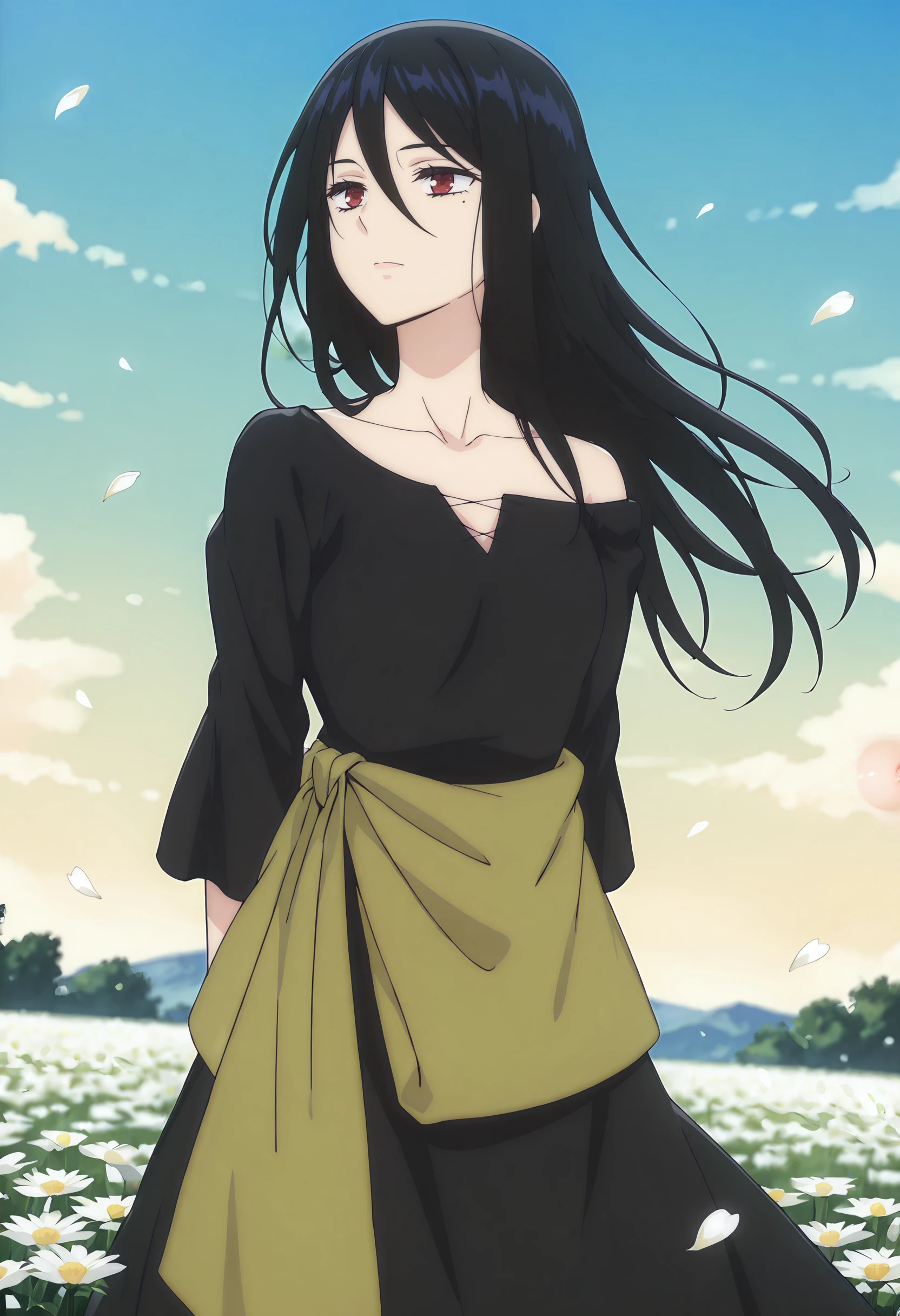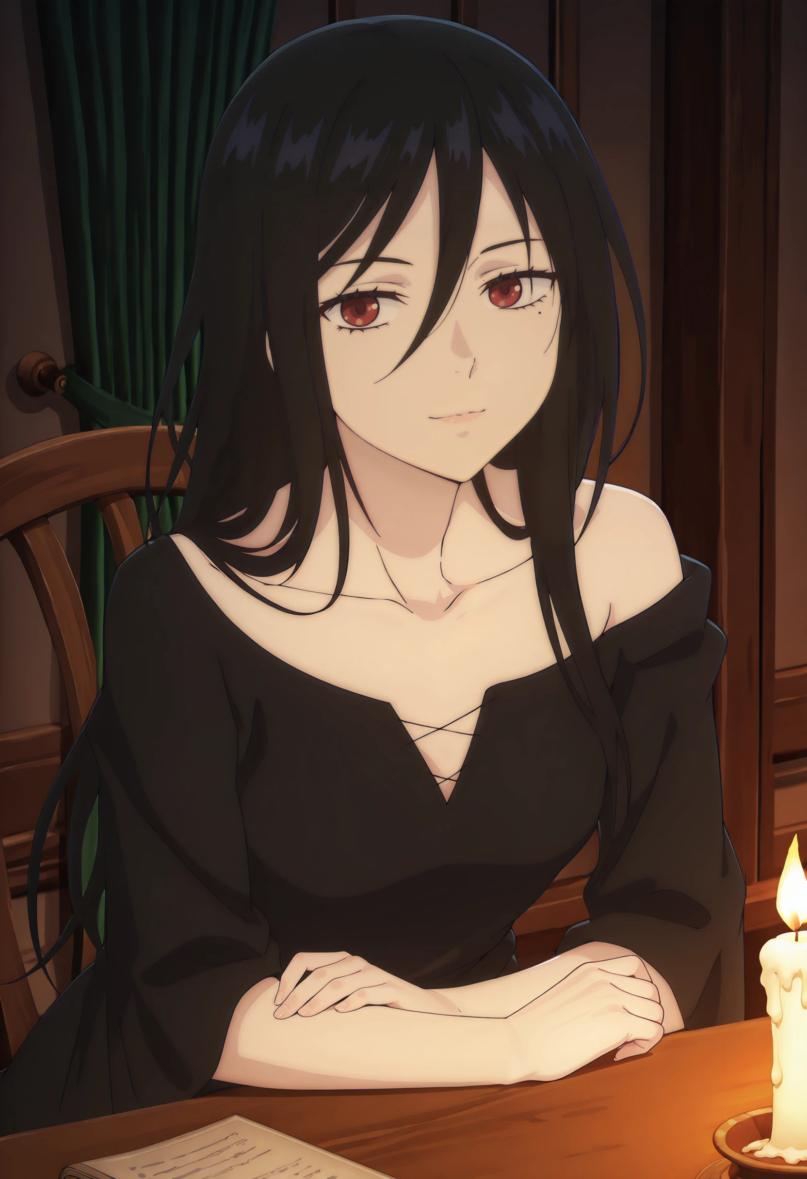 NiehimeAnastasia, mole under eye, red eyes, black hair, long hair, hair between eyes