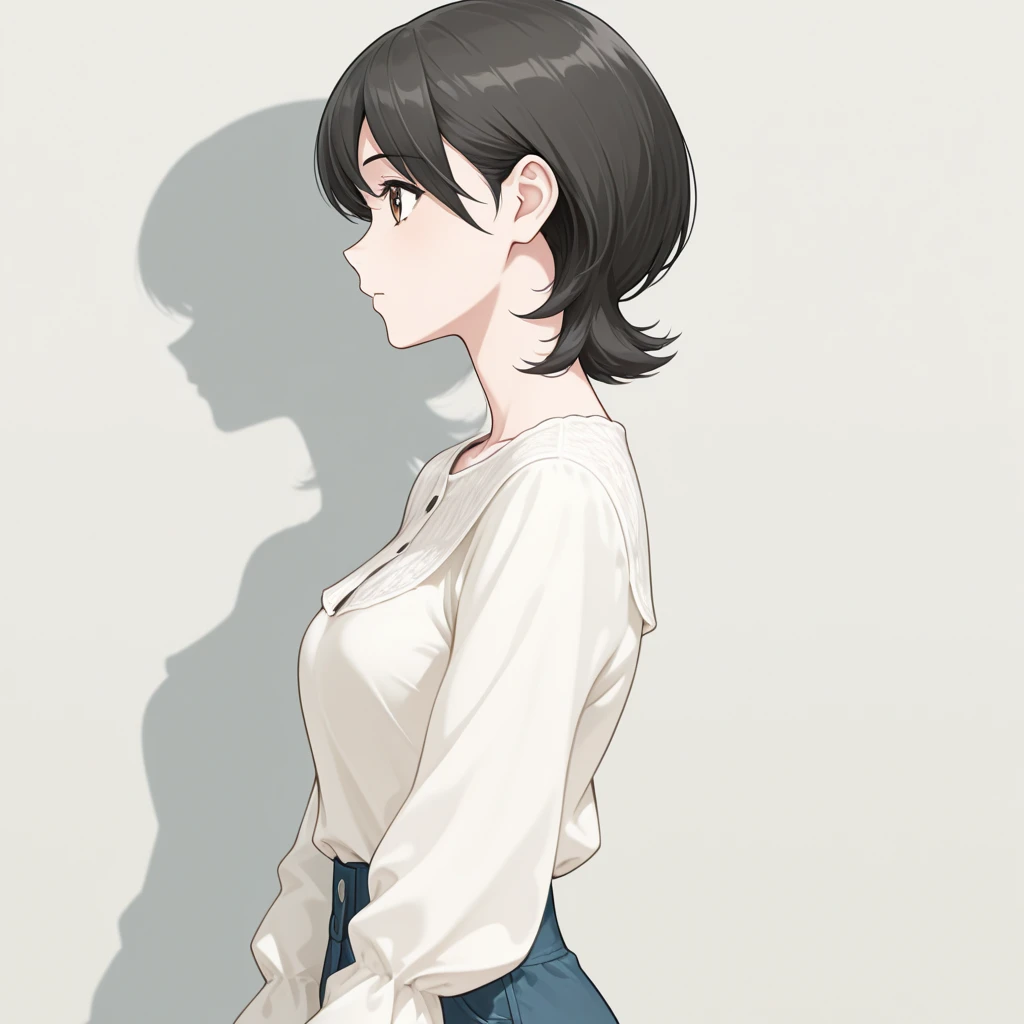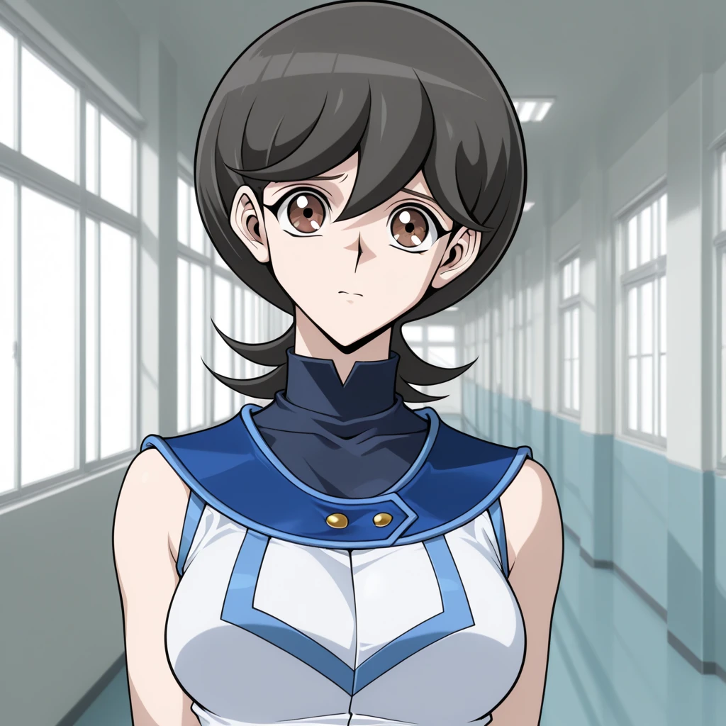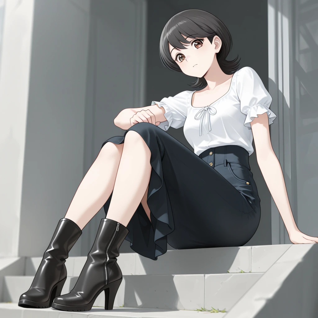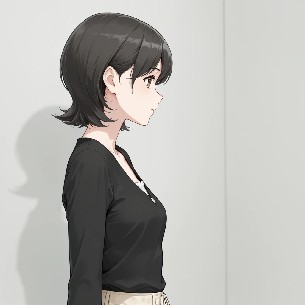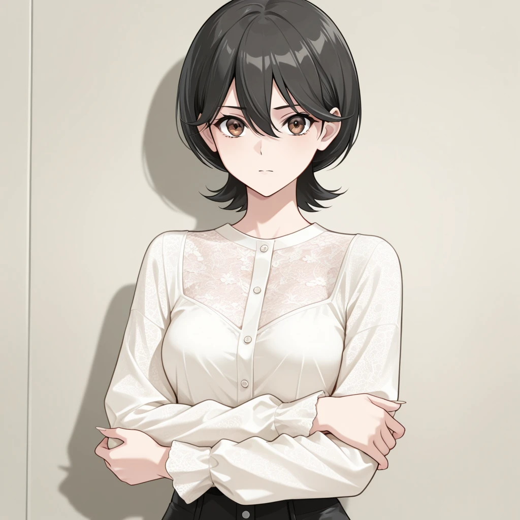 black hair,brown eyes, short hair, hair between eyes