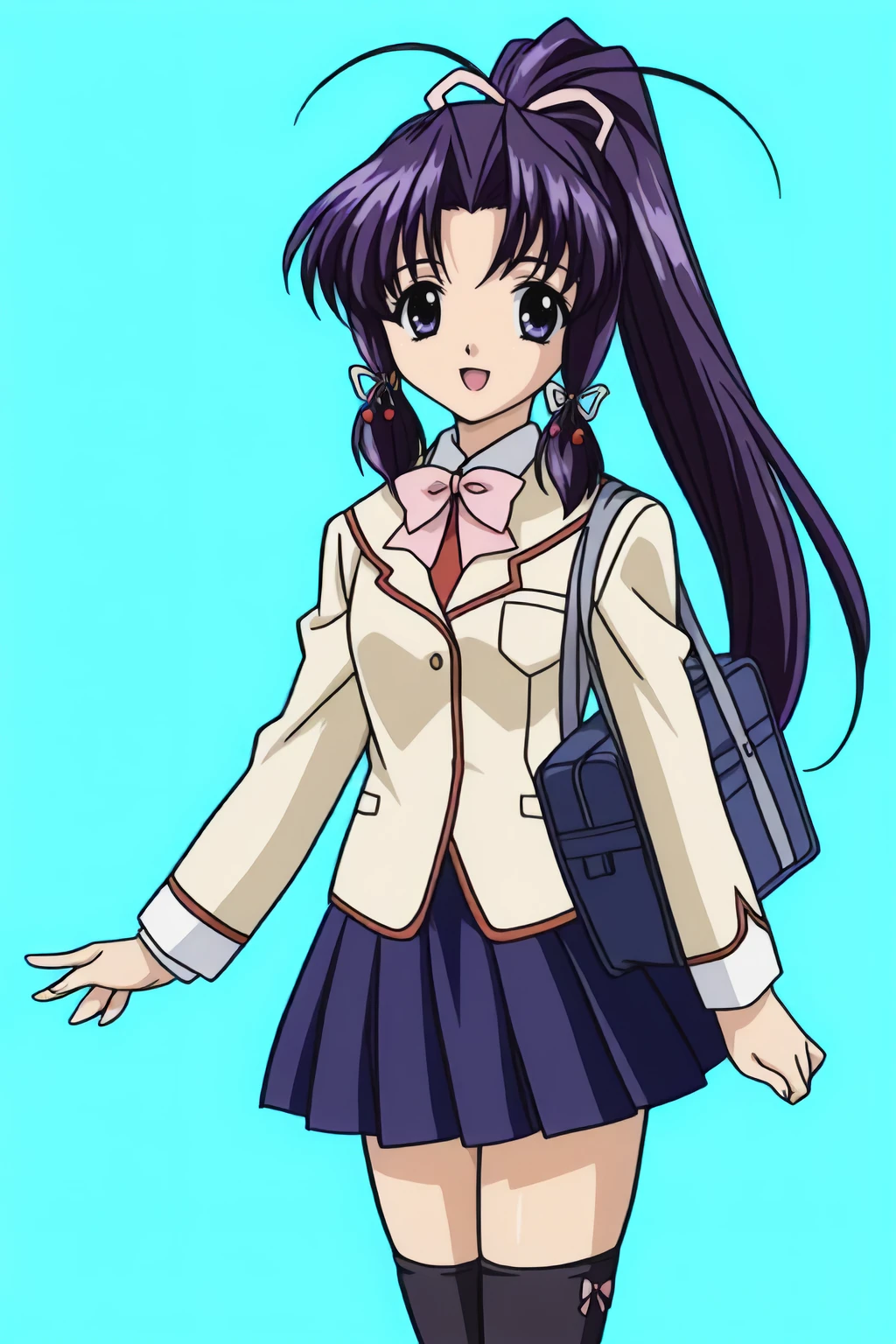 blazer, jacket, long hair, long sleeves, pink bow, ponytail, school bag, school uniform, skirt, thighhighs