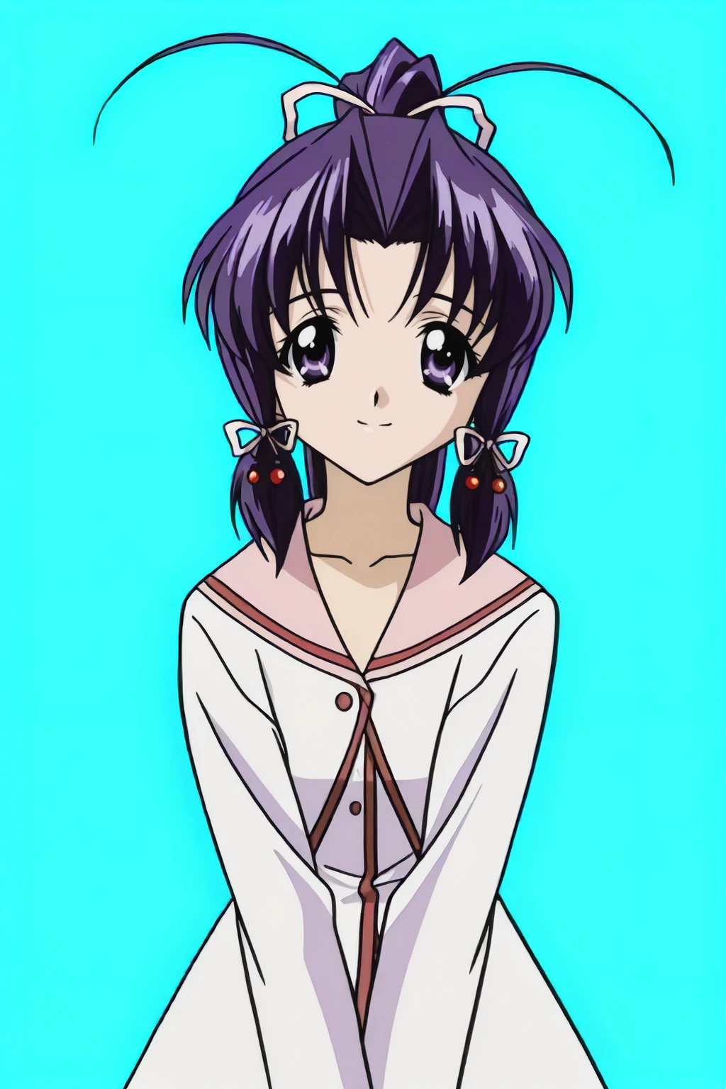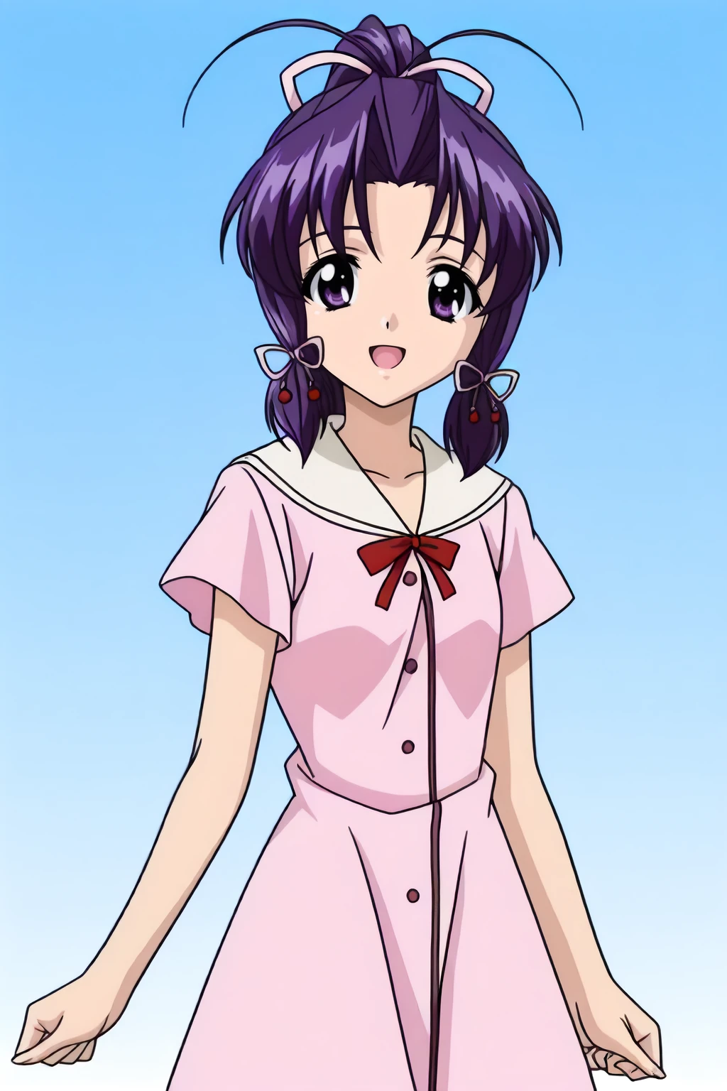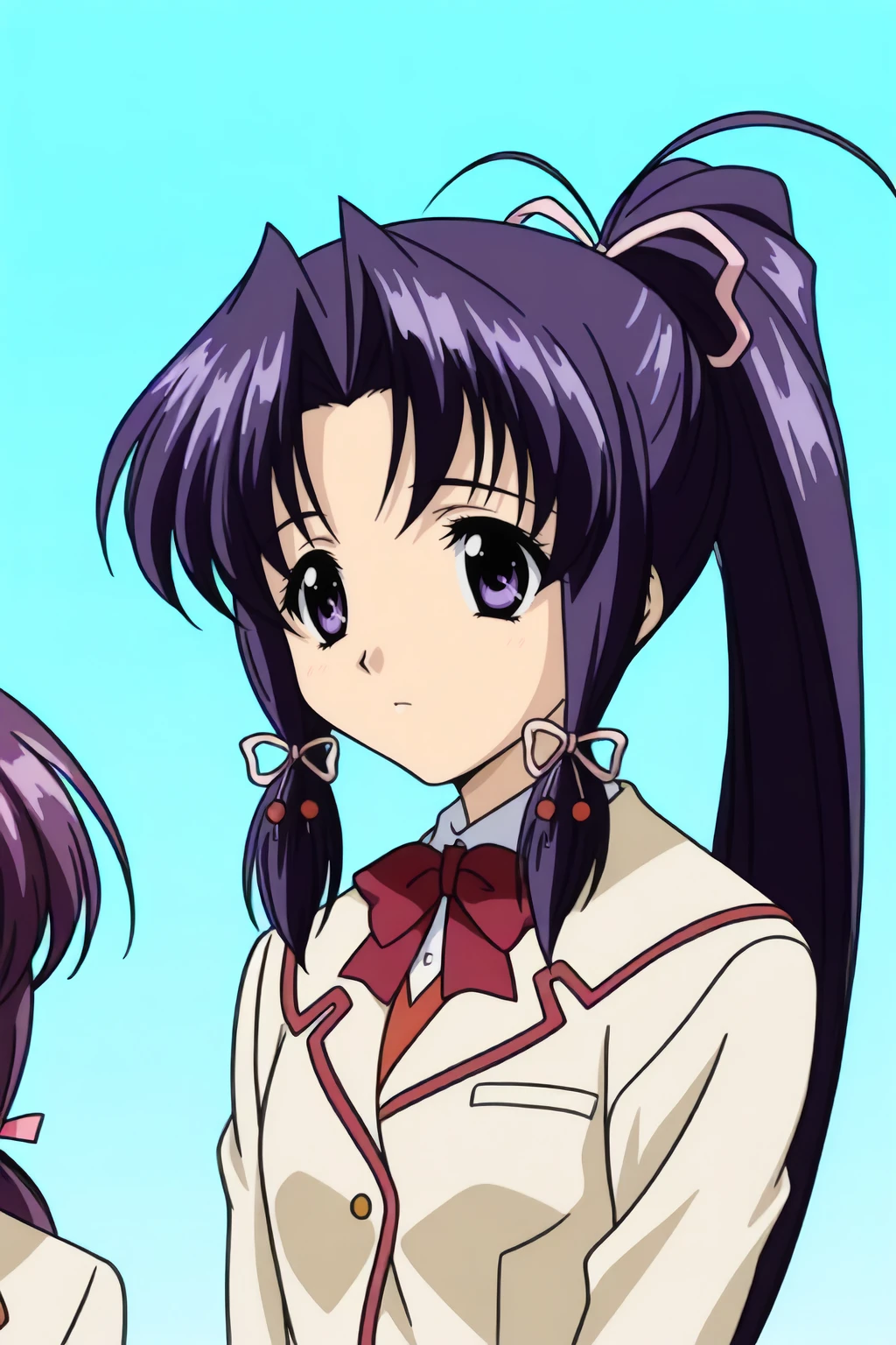 blazer, bowtie, hair ribbon, jacket, long hair, long sleeves, pink-red bow, ponytail, school uniform, sidelocks
