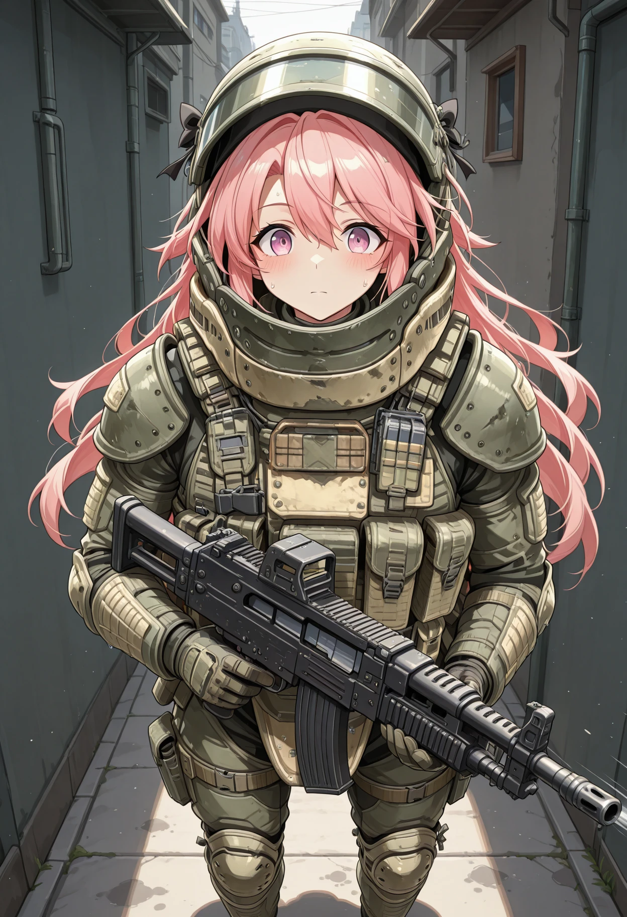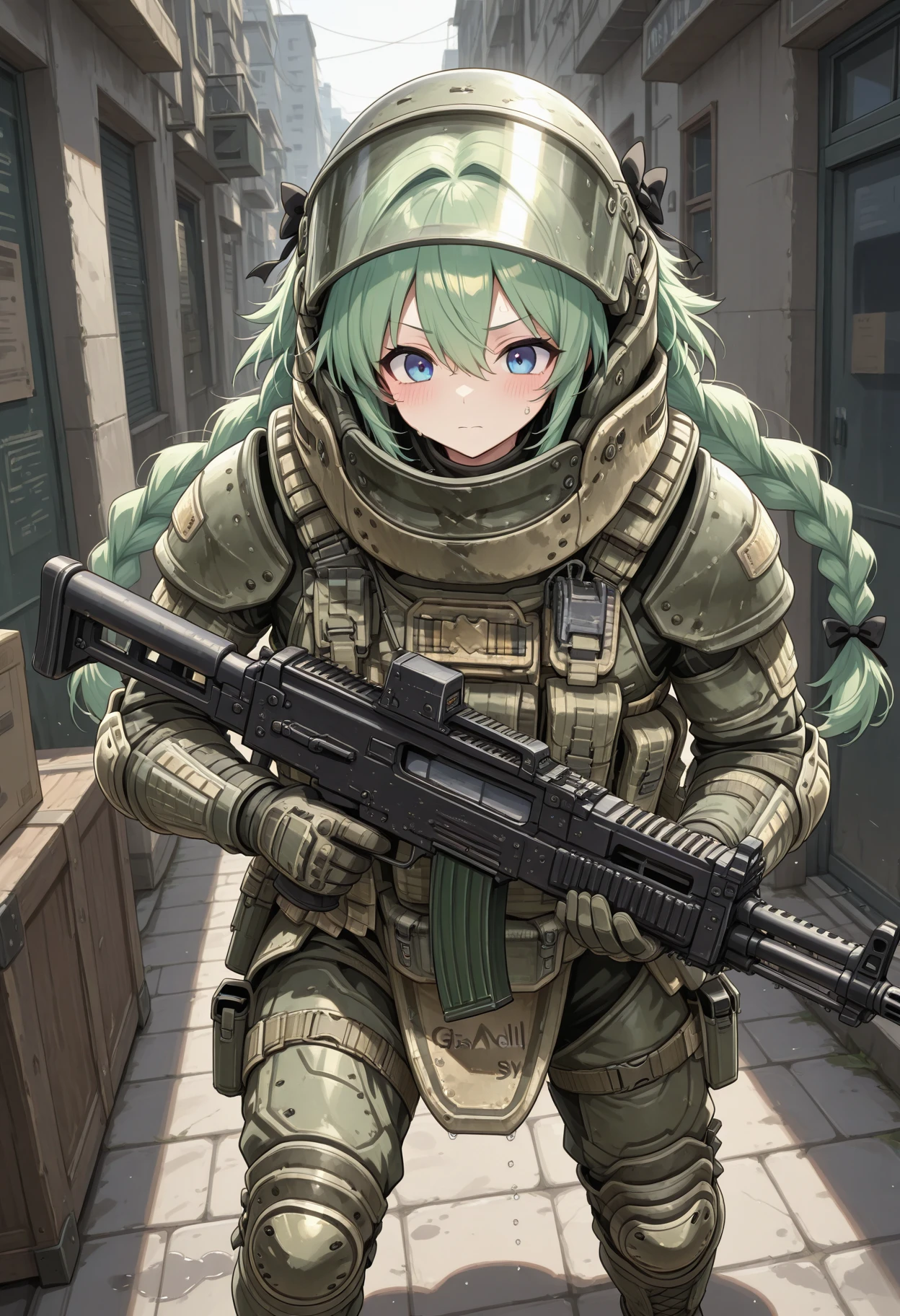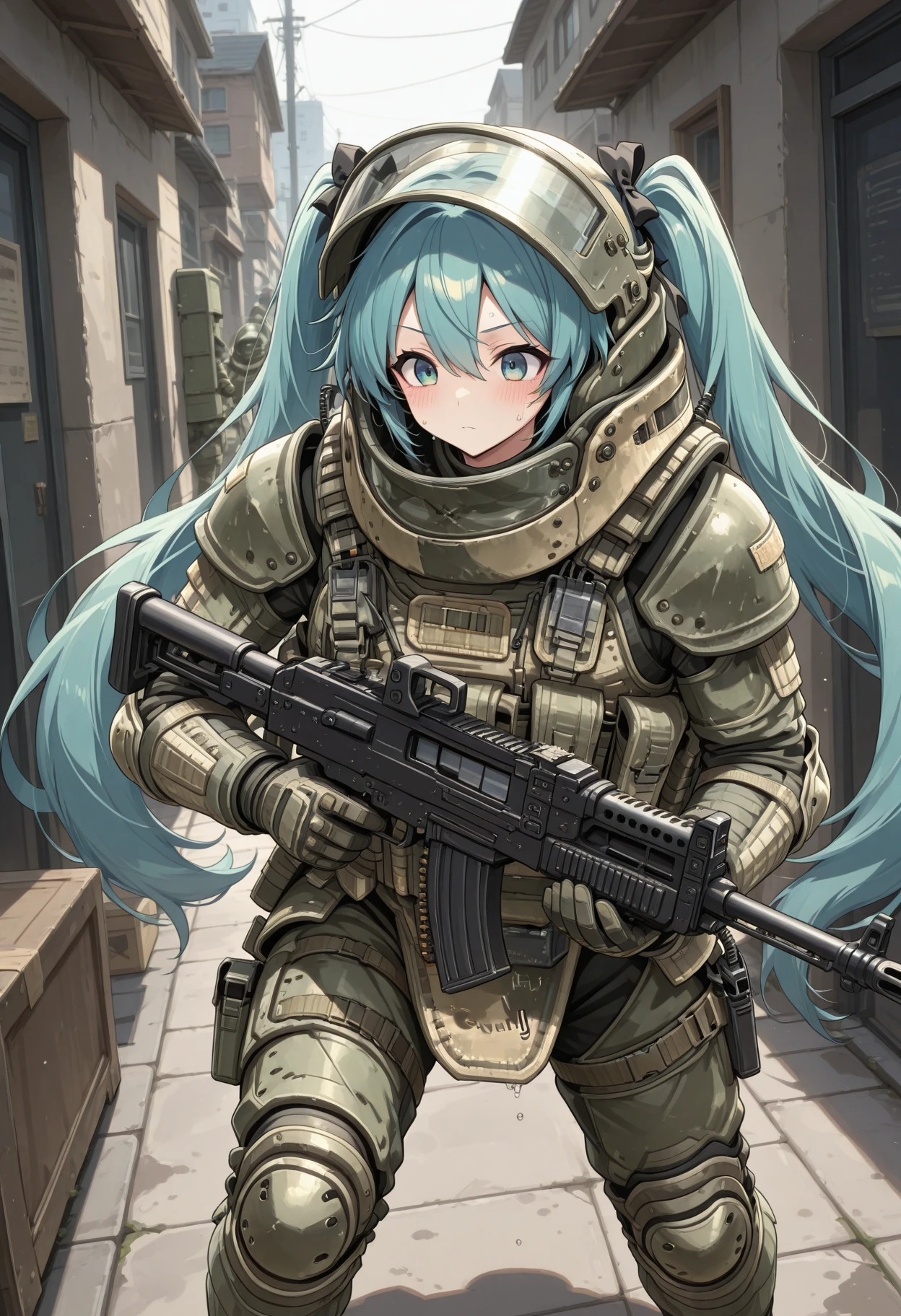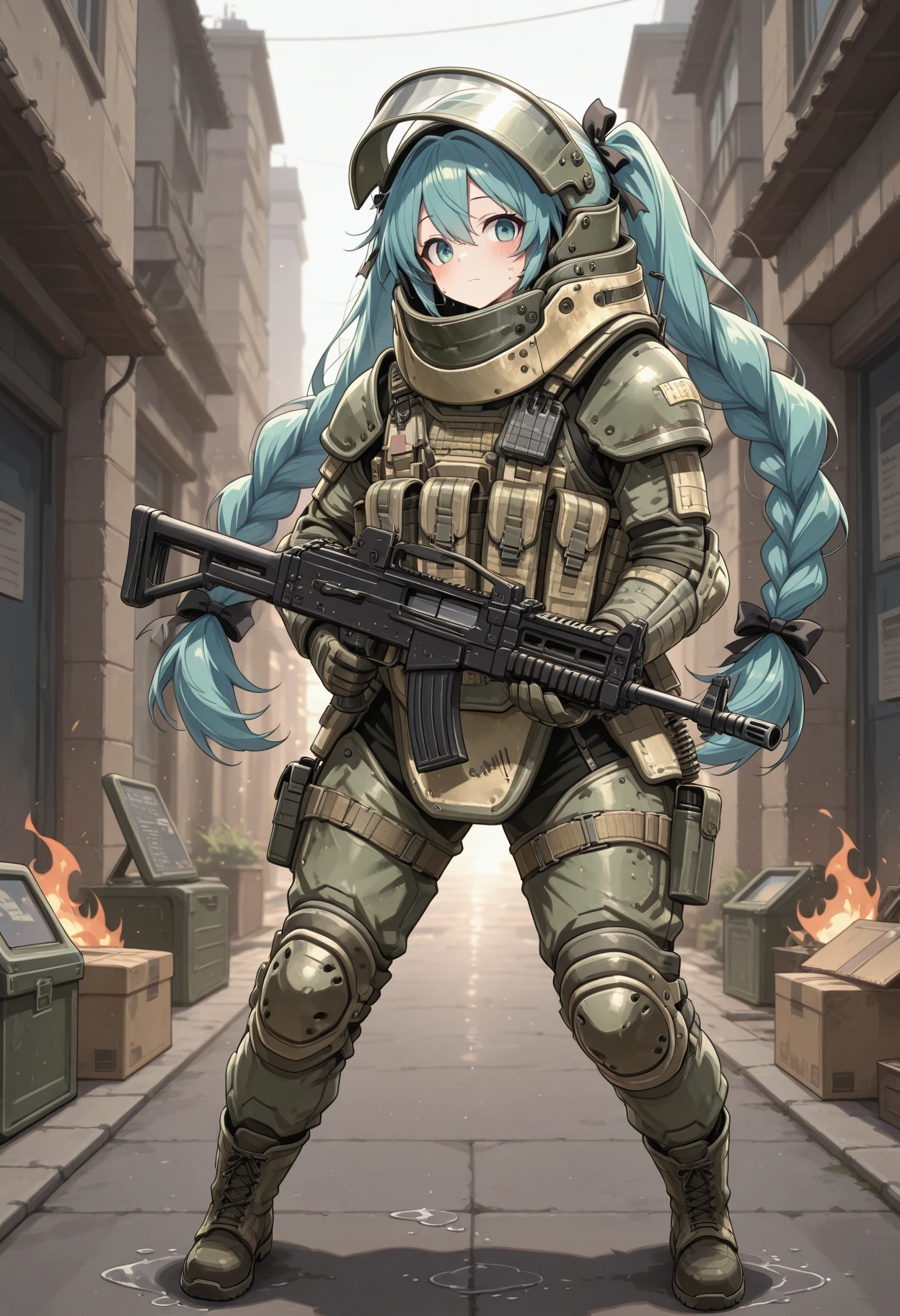heavy helmet with flip-up visor, neck guard armor, shoulder pauldrons, chest plate with molle pouches, magazine pouches, groin guard armor, knee pads, elbow pads, tactical gloves, combat boots, tactical radio, webbing, load-bearing vest, reinforced plating, weathered military texture, ballistic shield compatible armor