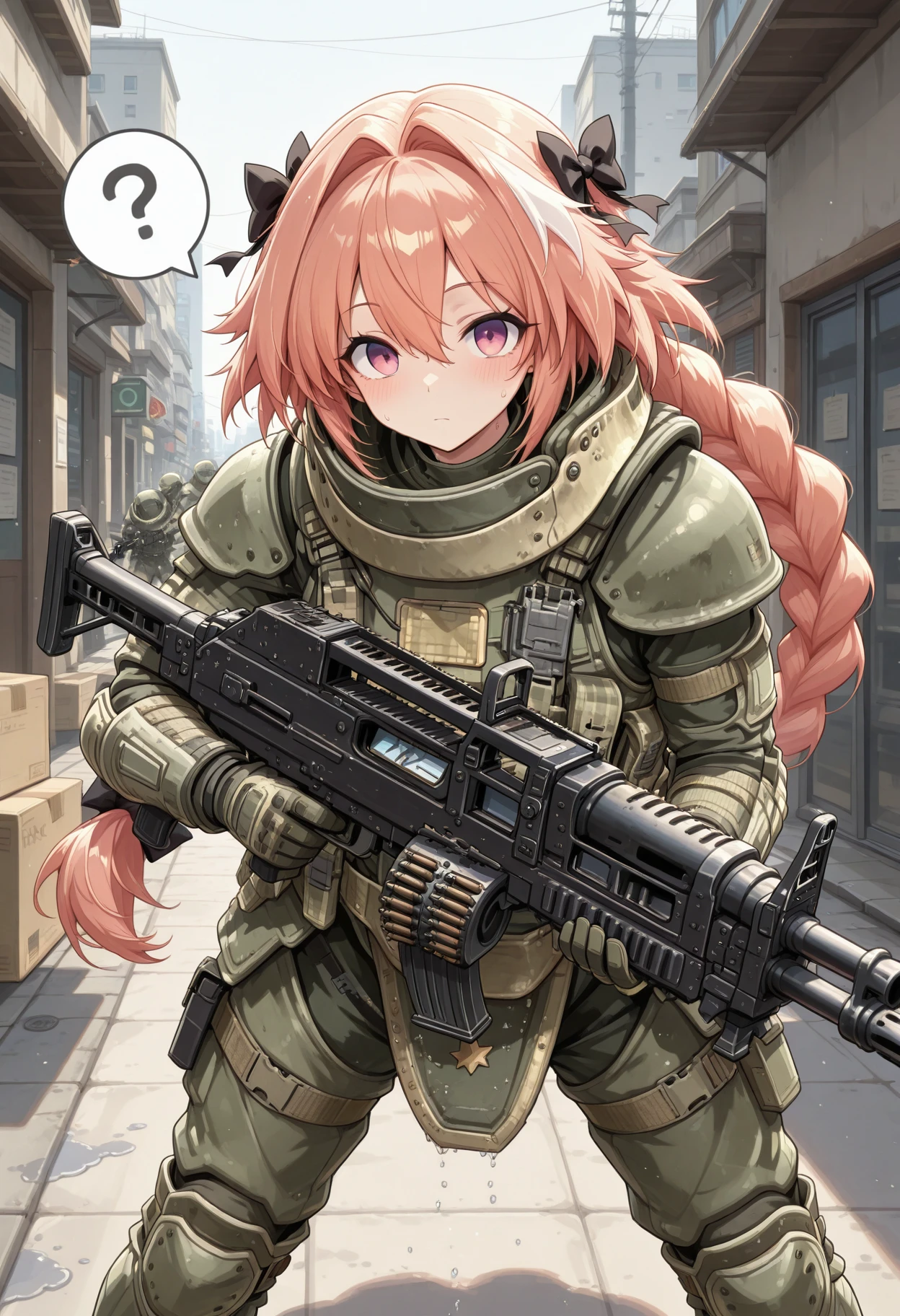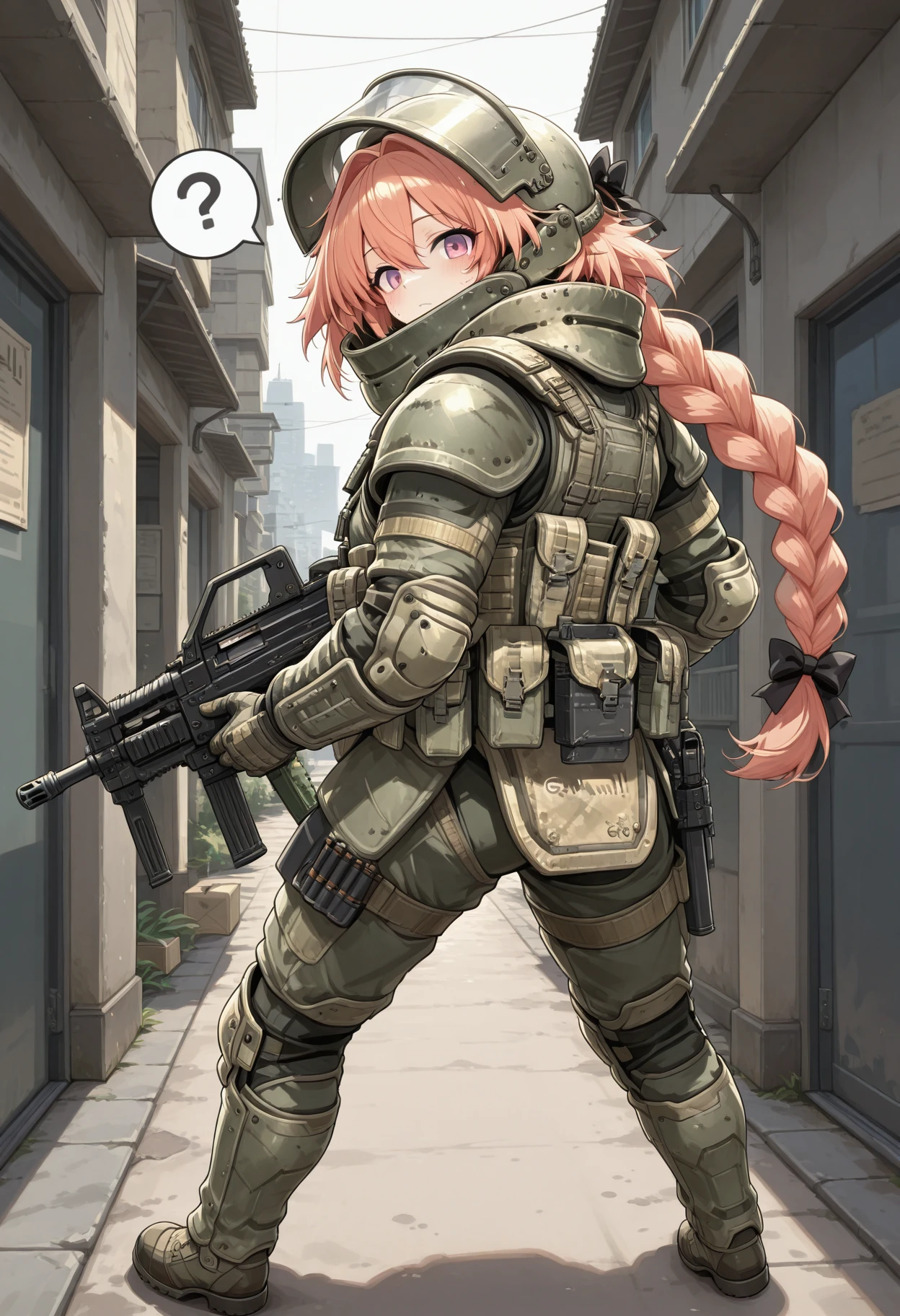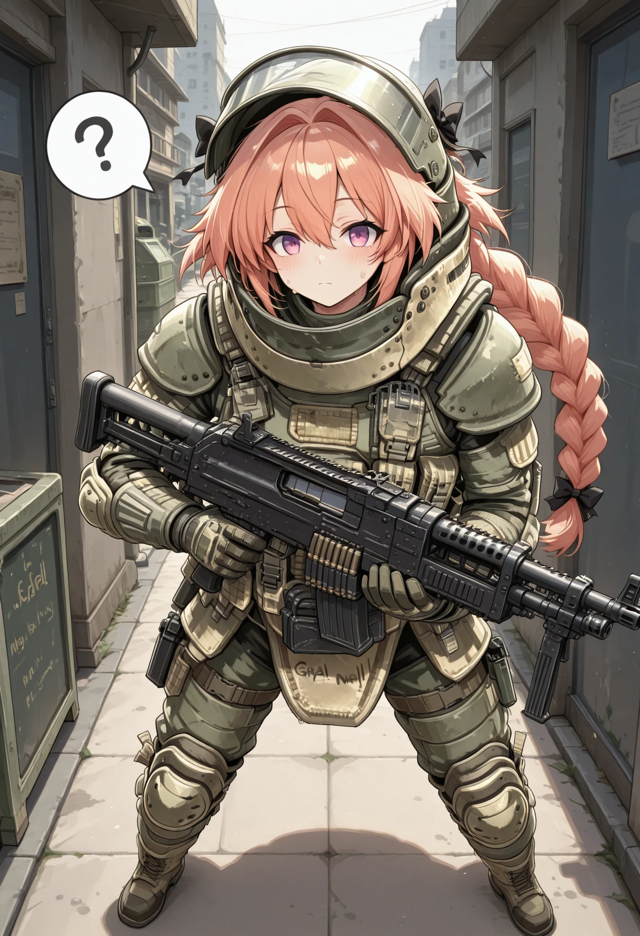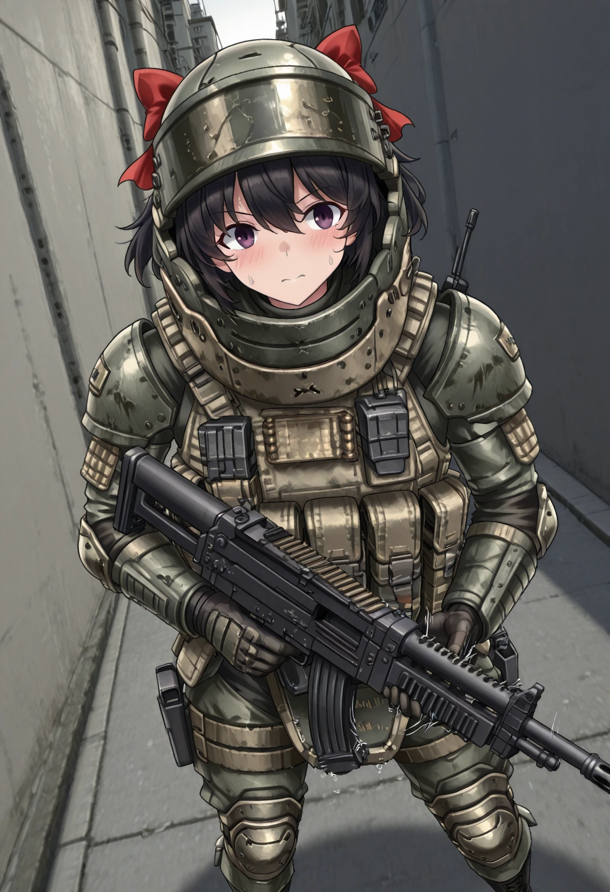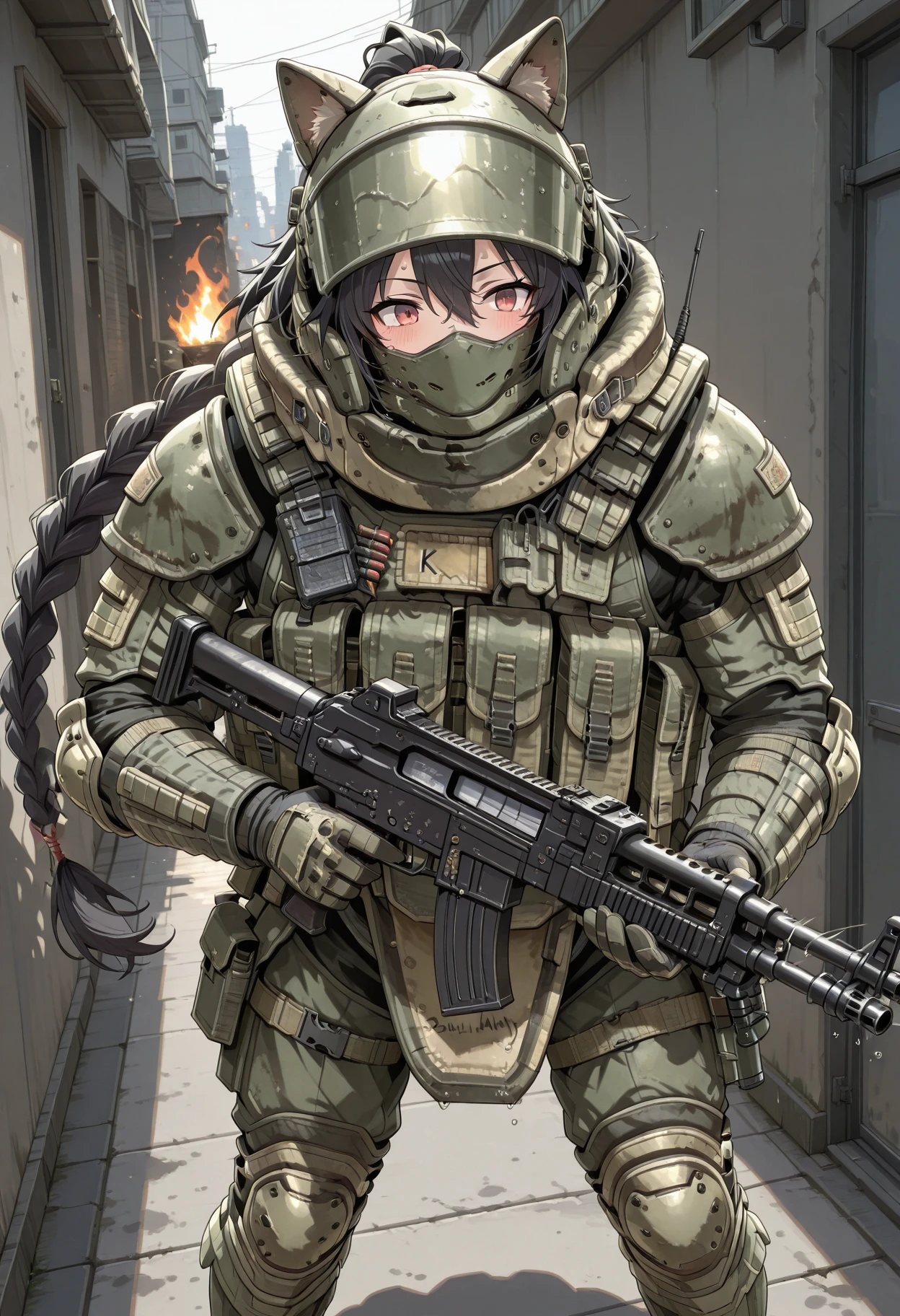 heavy helmet with flip-up visor, neck guard armor, shoulder pauldrons, chest plate with molle pouches, magazine pouches, groin guard armor, knee pads, elbow pads, tactical gloves, combat boots, tactical radio, webbing, load-bearing vest, reinforced plating, weathered military texture, ballistic shield compatible armor