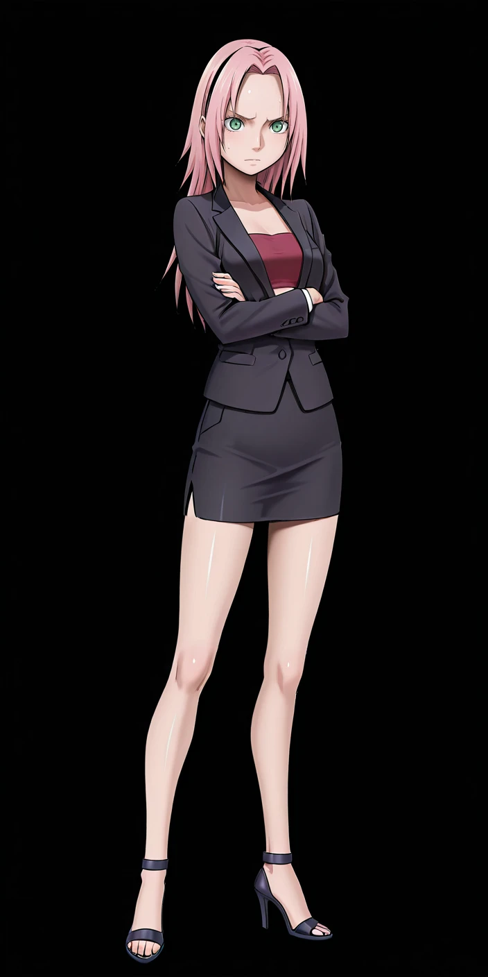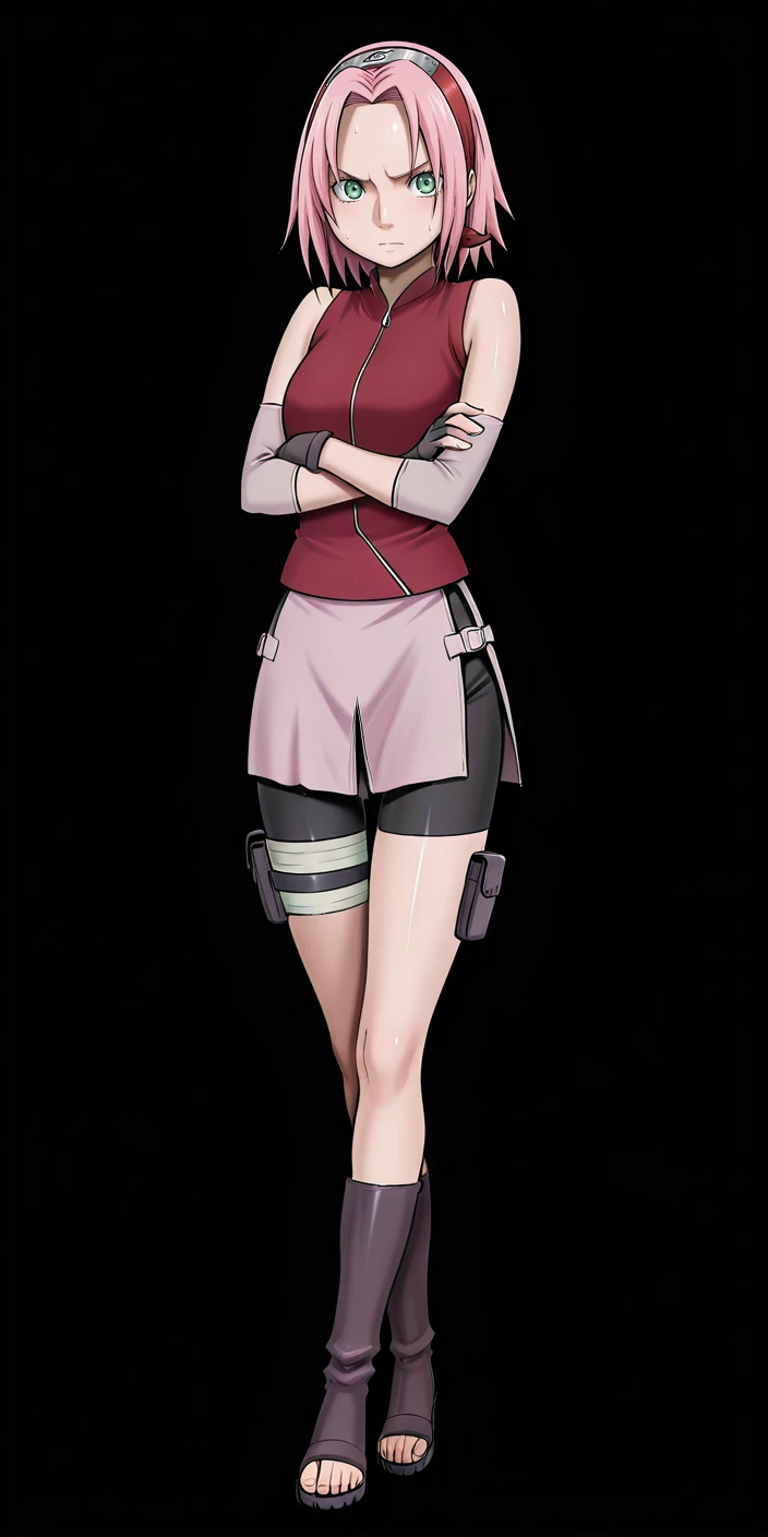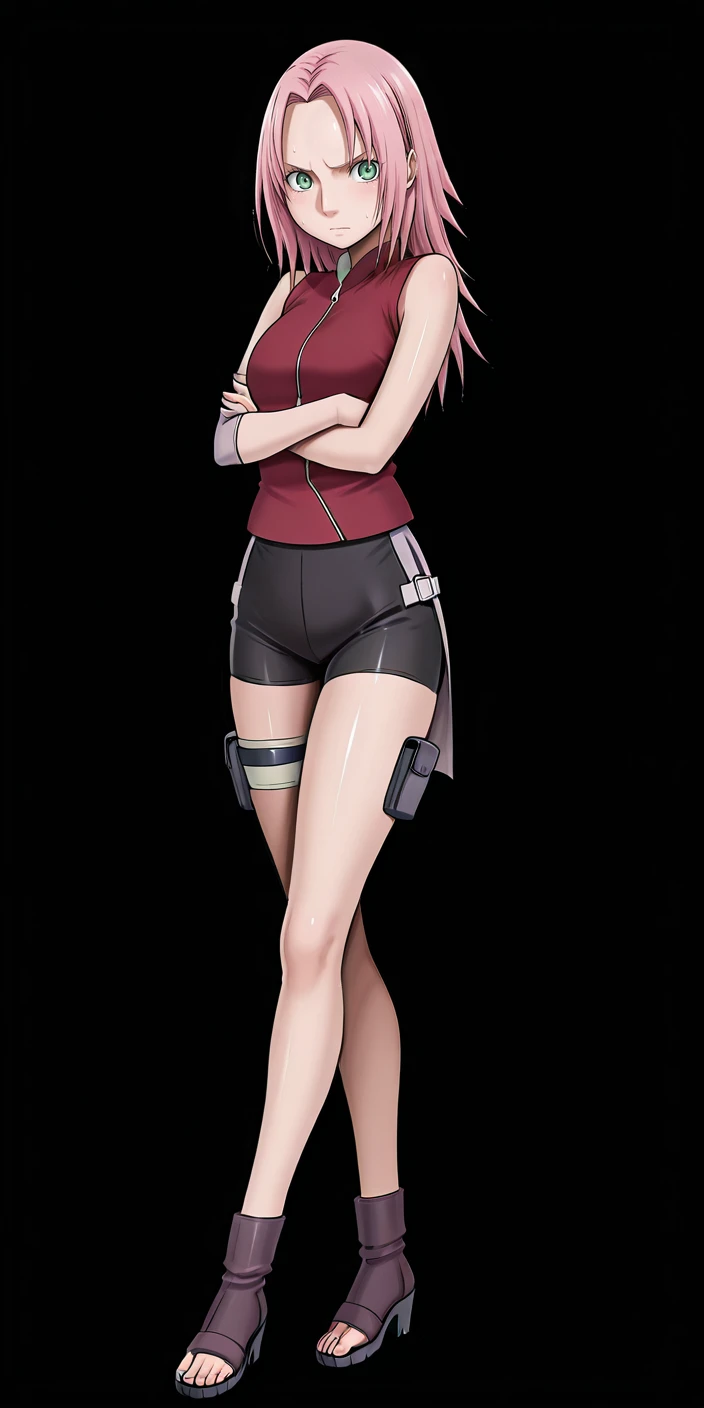 Sakura haruno,pink hair,short hair,green eyes,high boots,shorts, sleeveless, black gloves, shiny, fingerless gloves,sleeveless shirt, thigh strap, black shorts,bike shorts, red shirt, red jacket, red hairband, sleeveless jacket, toeless footwear, thigh pouch, konohagakure symbol, pink skirt with slits