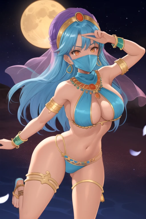 ArabianMoon, 1girl, solo, long hair, large breasts, navel, cleavage, brown eyes, jewelry, blue hair, purple bikini, earrings, midriff, dark skin, bracelet, dark-skinned female, orange eyes, mouth veil, armlet, anklet, bracer, thighlet, dancer, harem outfit, arabian clothes
