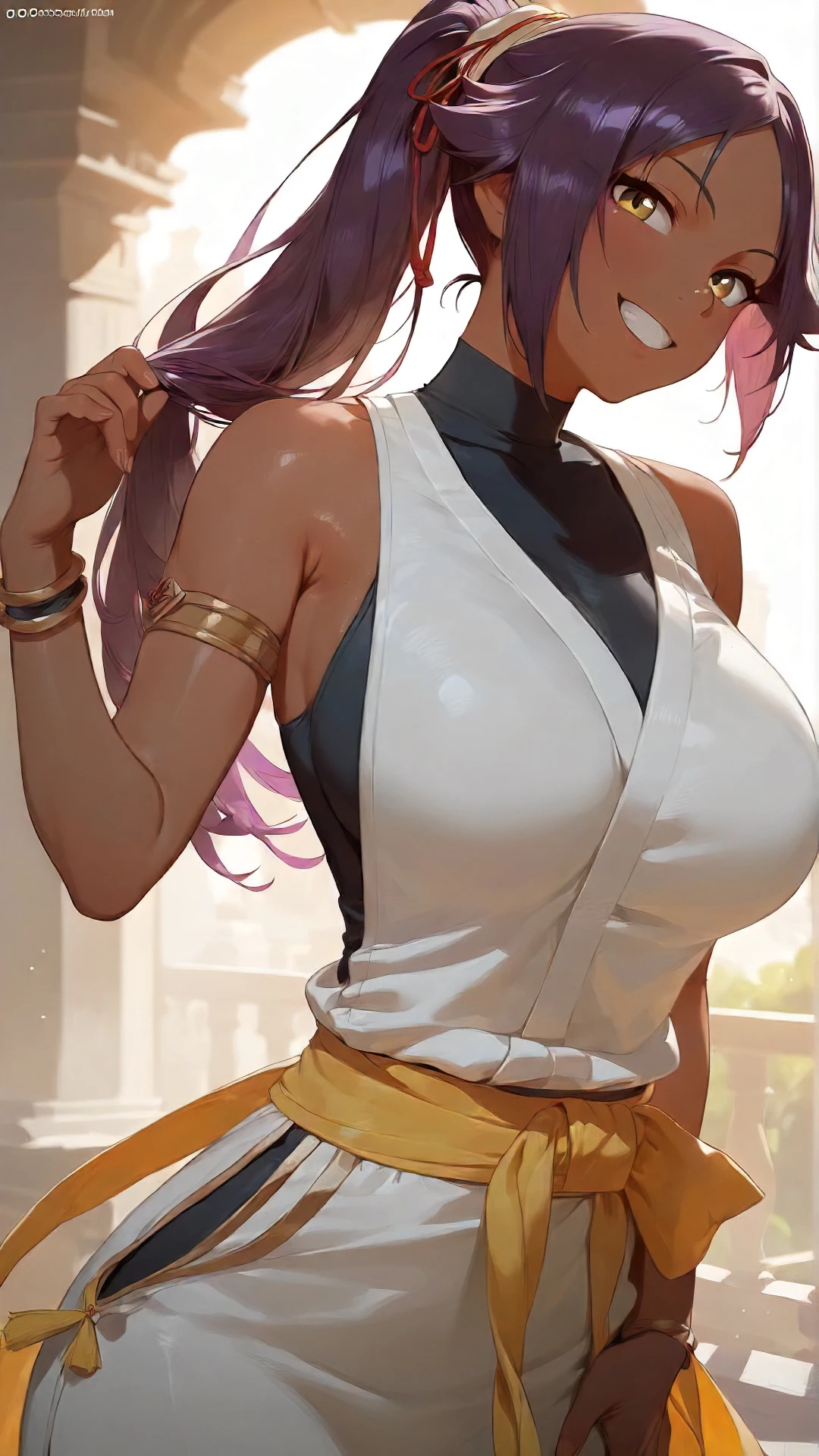 shihouin_yoruichi, an anime girl, 1girl, solo, long hair, breasts, smile, large breasts, white background, ponytail, purple hair, dark skin, grin, dark-skinned female,