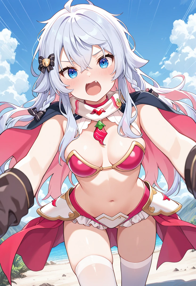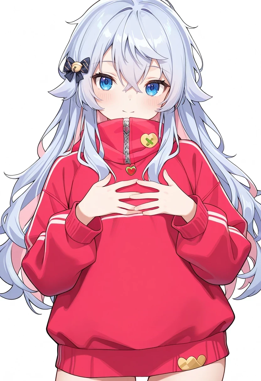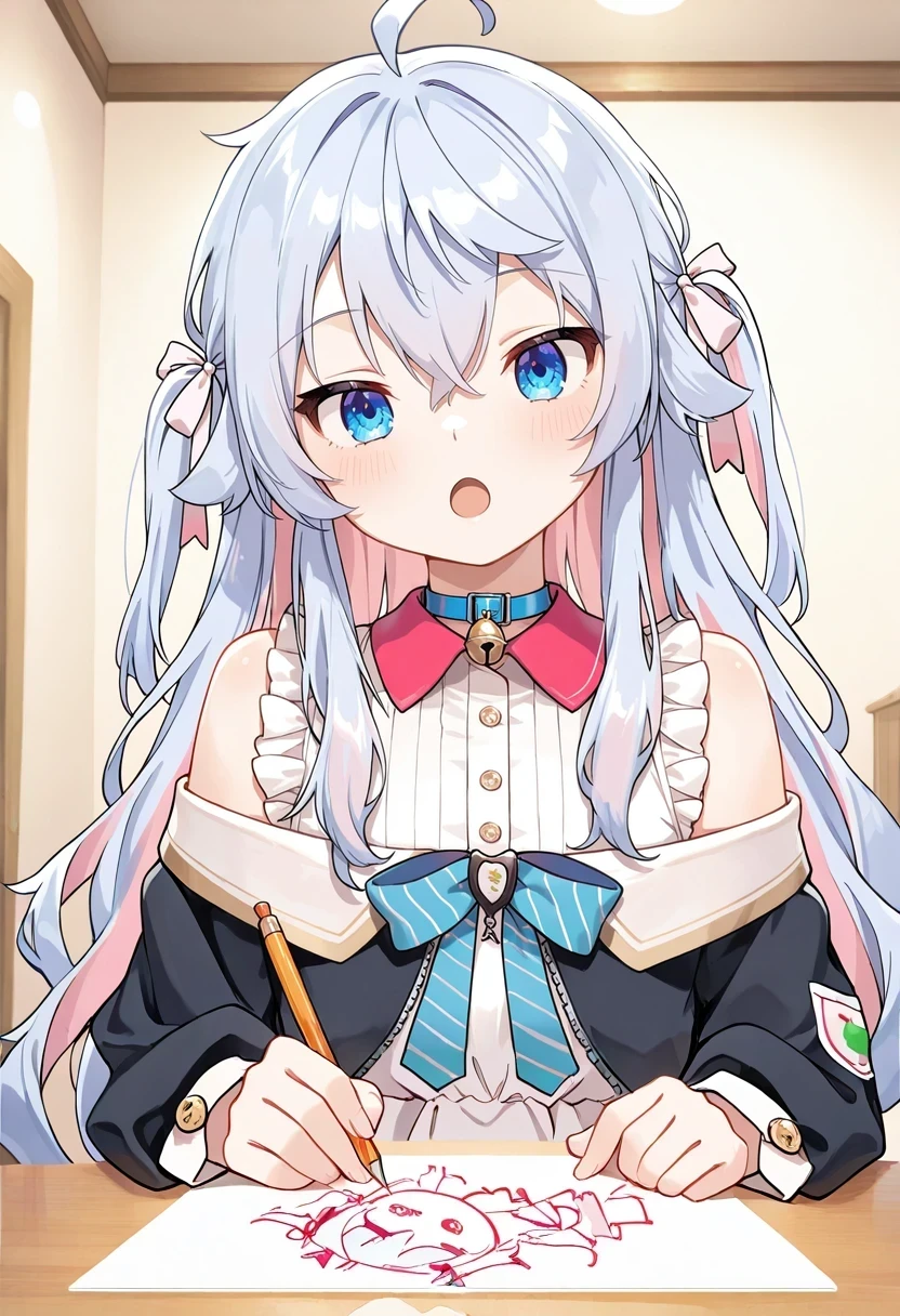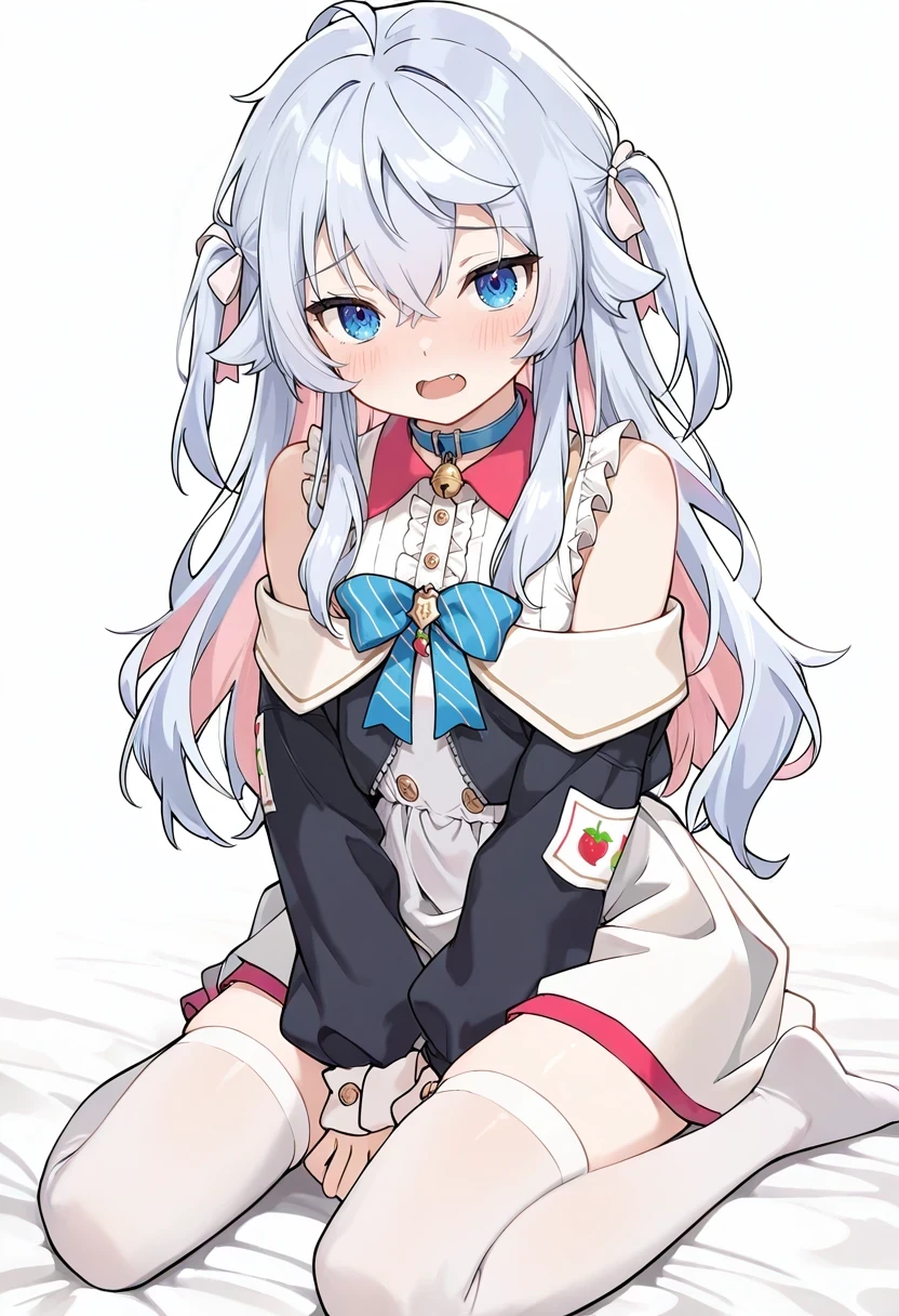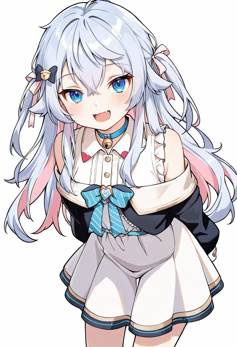 two side up,hair ribbon,black jacket,off-shoulder jacket,white dress,blue bow,blue choker,neck bell,wing collar,Description