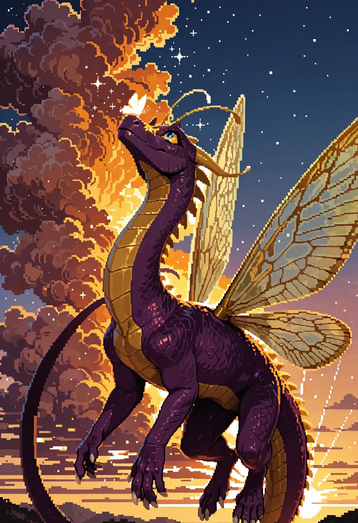 faerie dragon, dragon, purple scales, antennae, blue eyes, yellow sclera, white claws, yellow accents, (yellow belly:0.5), feral, insect wings, tail,