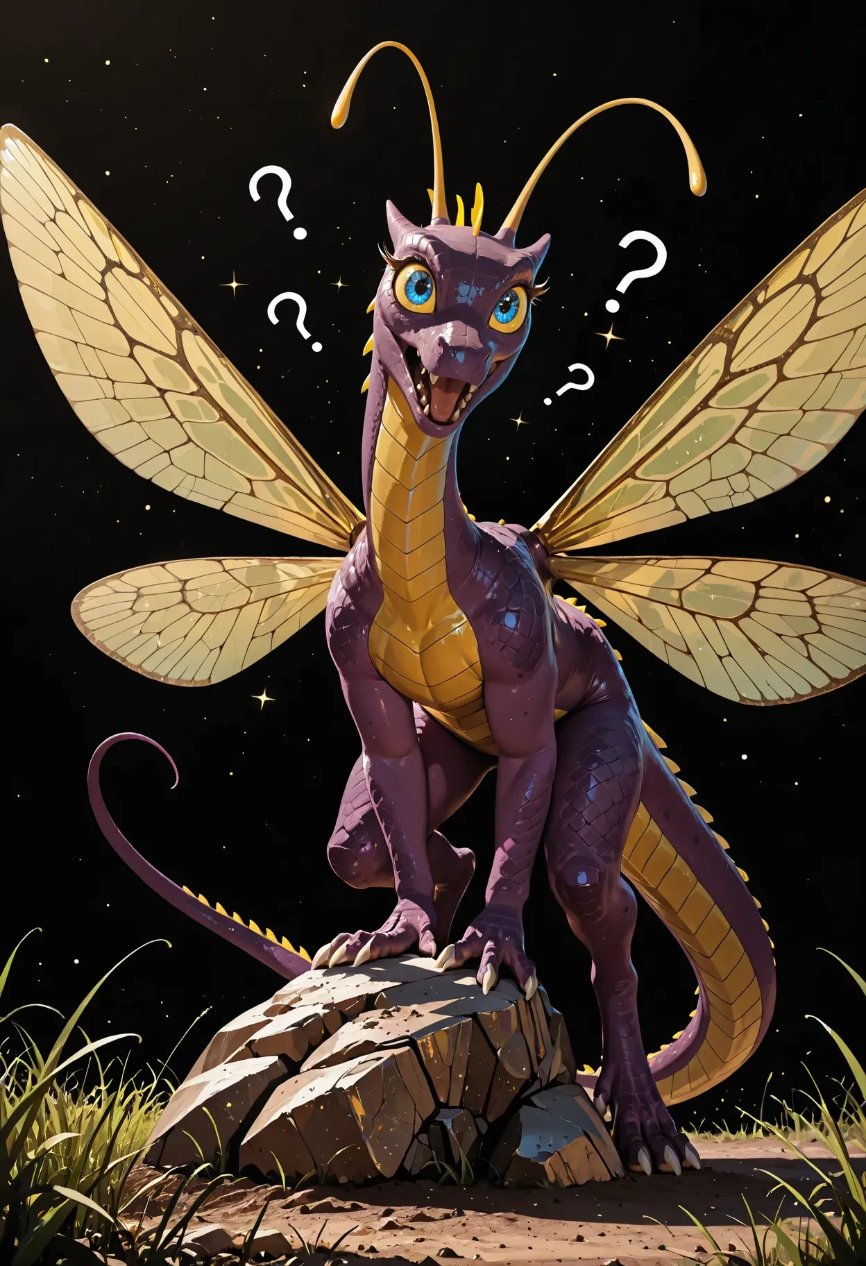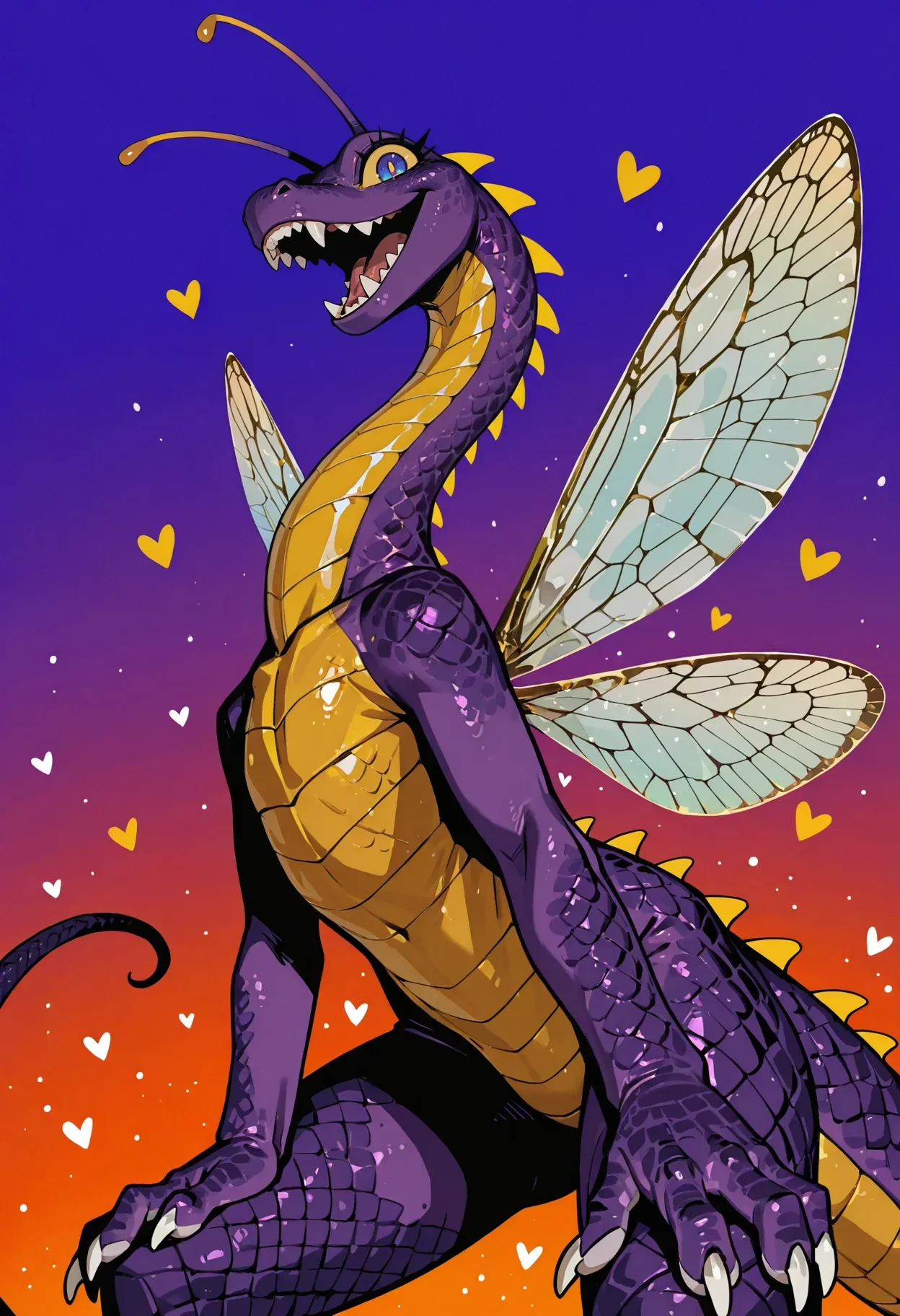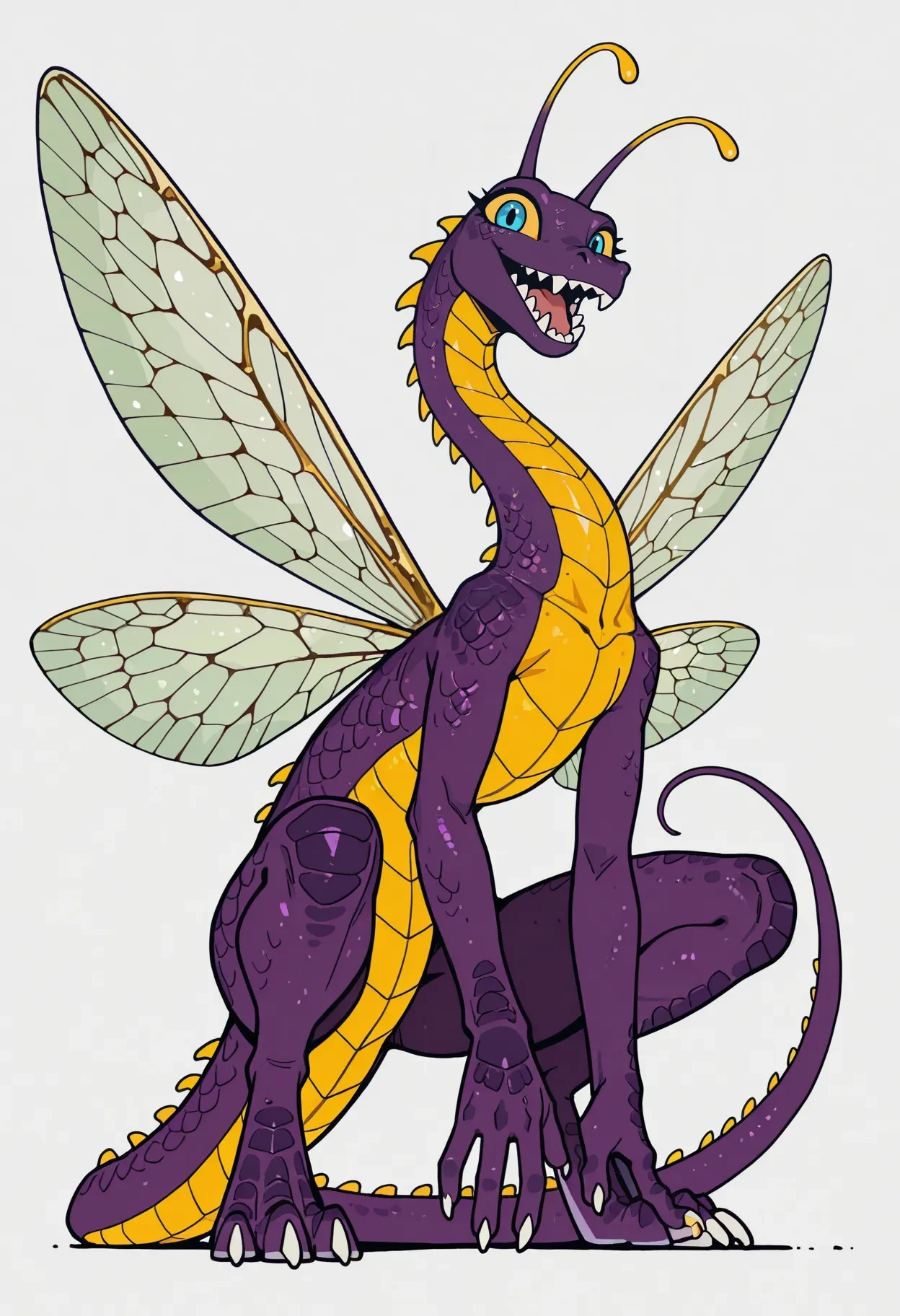 faerie dragon, dragon, purple scales, antennae, blue eyes, yellow sclera, white claws, yellow accents, (yellow belly:0.5), anthro, insect wings, tail,