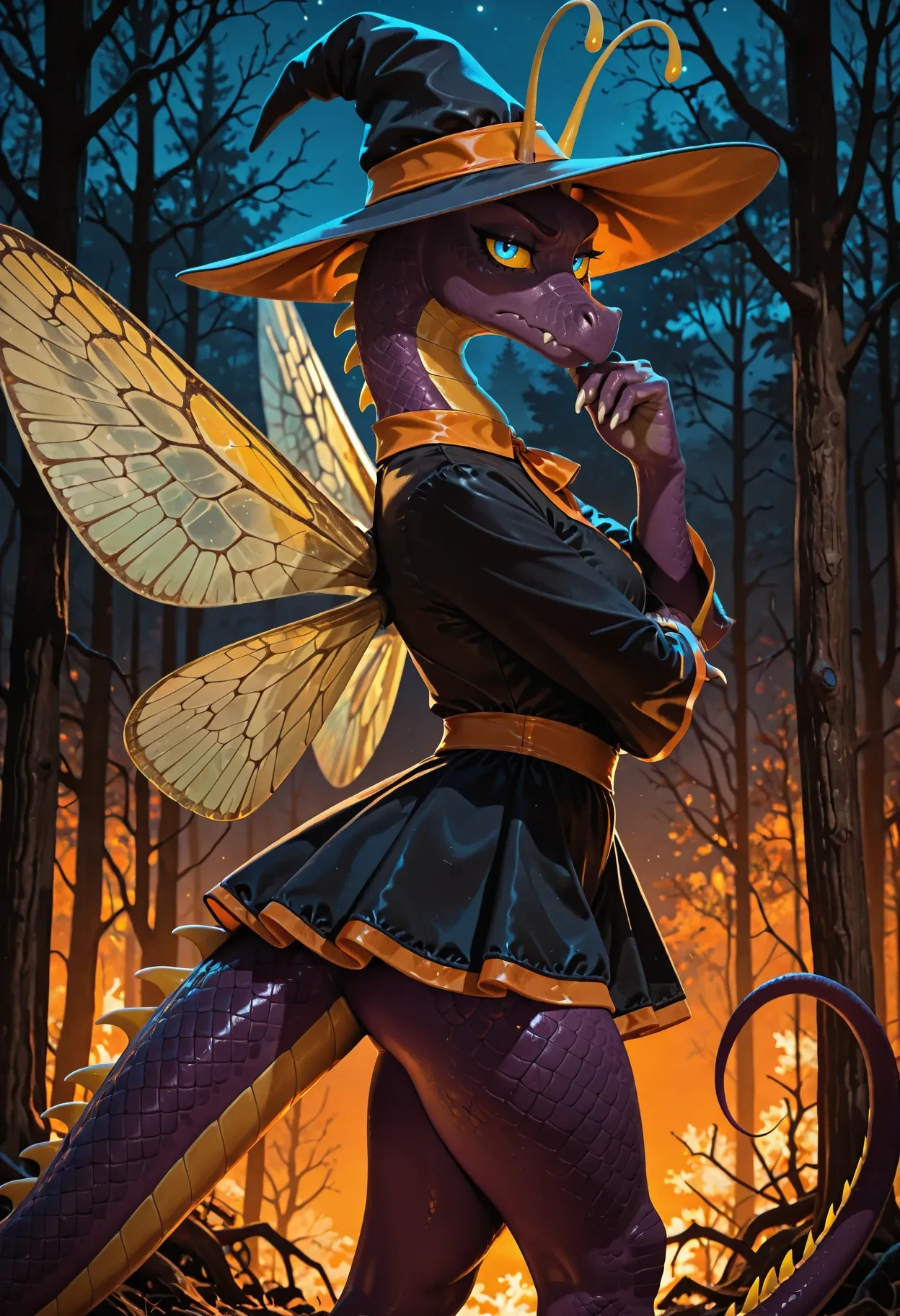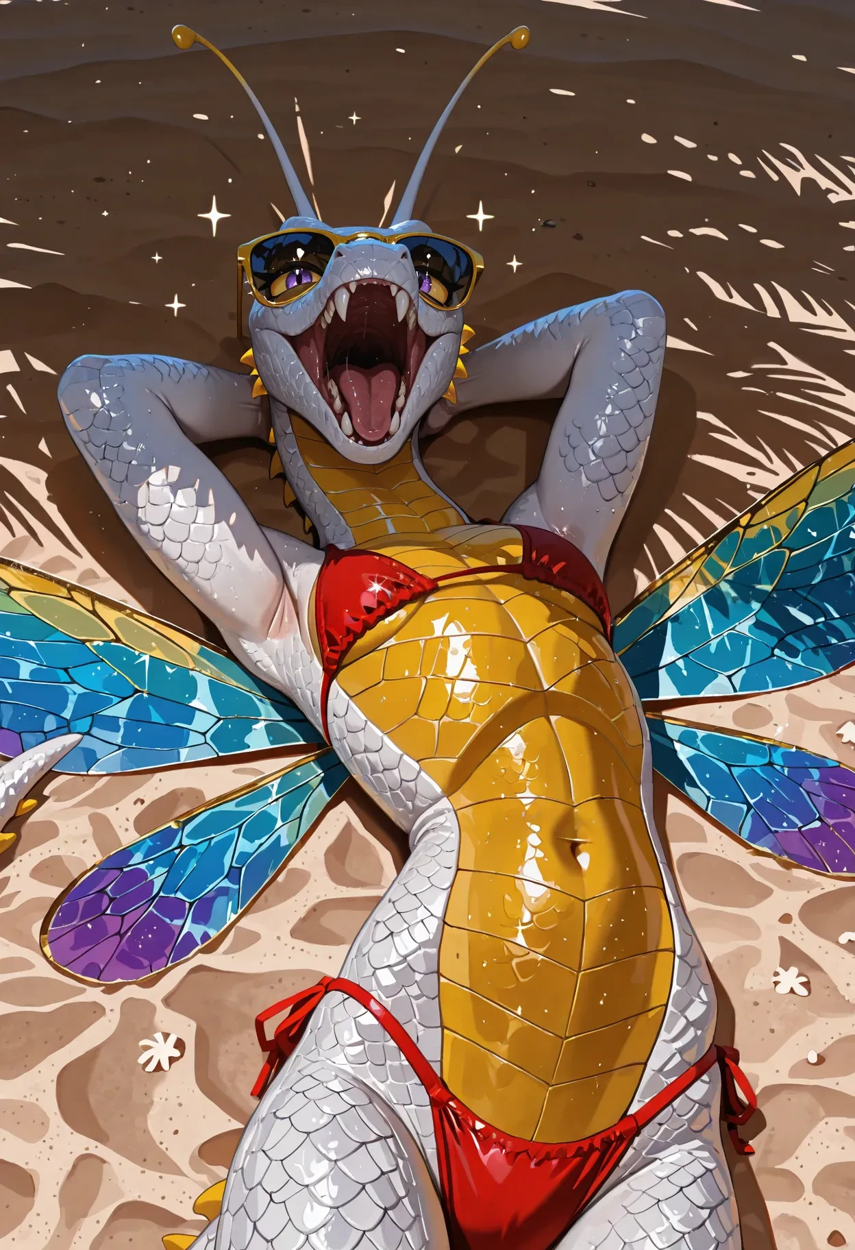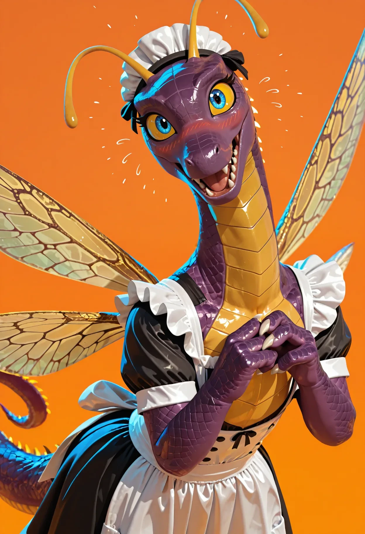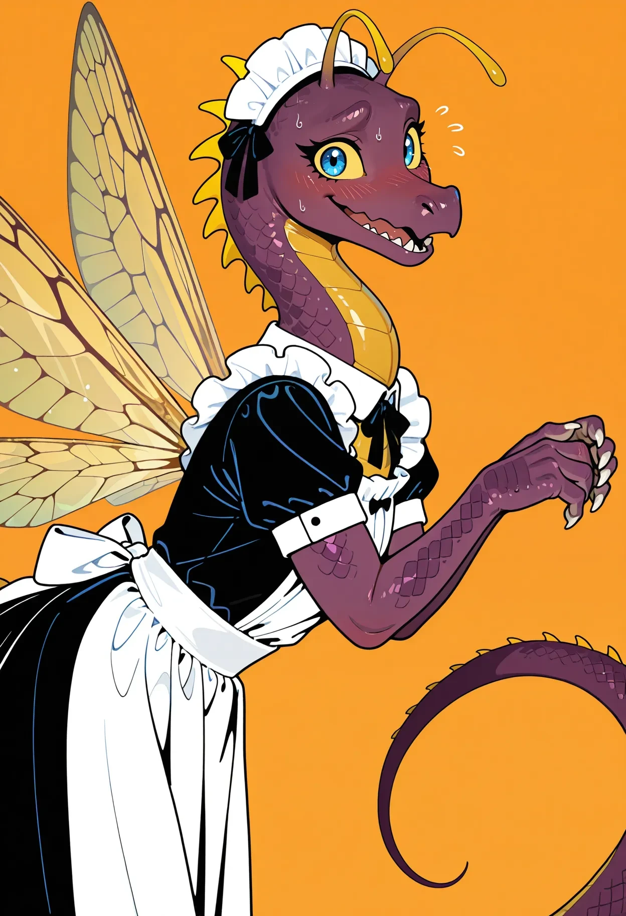 faerie dragon, dragon, purple scales, antennae, blue eyes, yellow sclera, white claws, yellow accents, (yellow belly:0.5), anthro, insect wings, tail,
