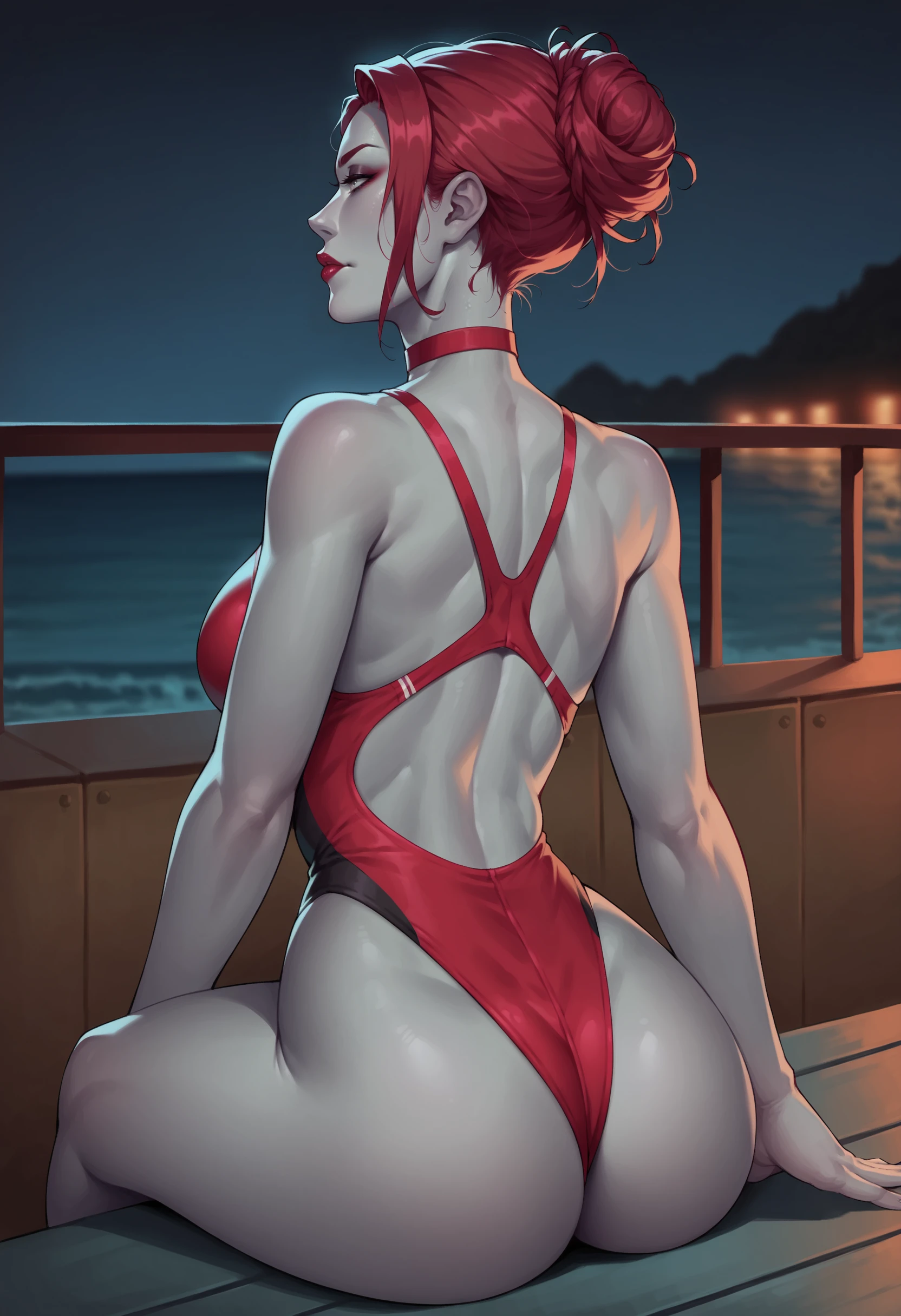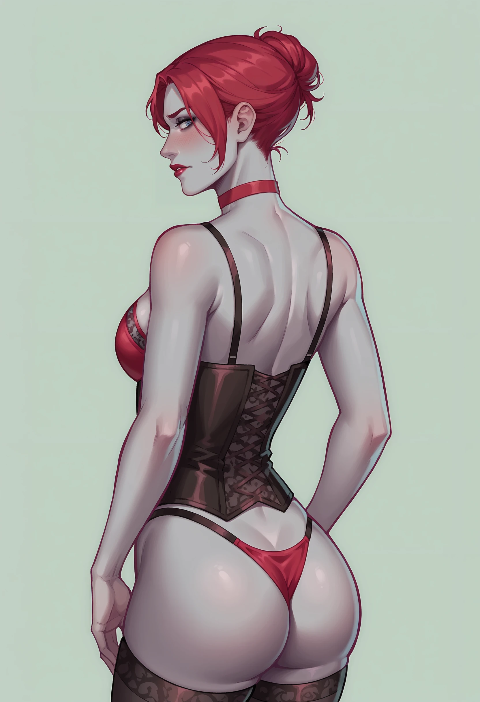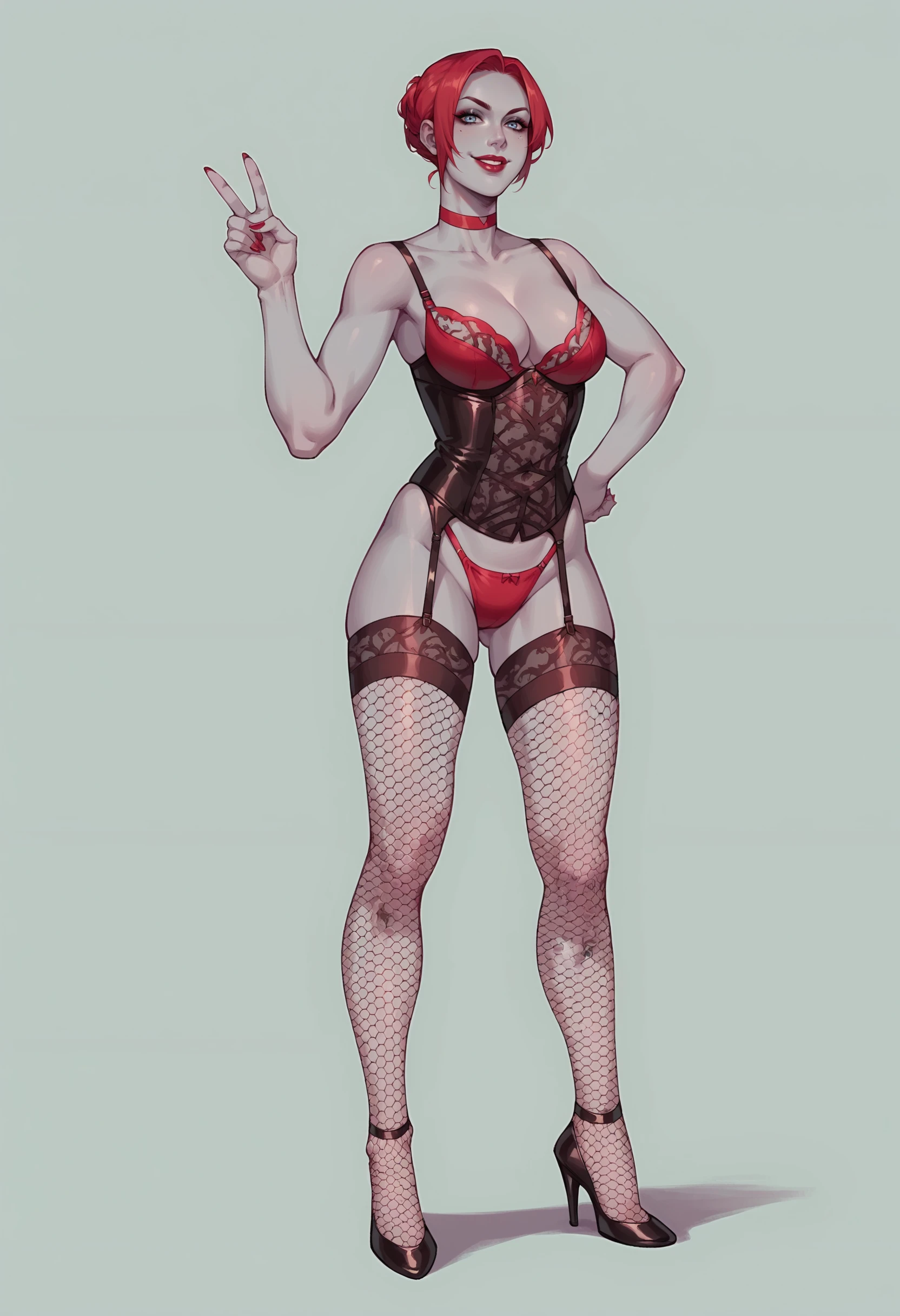 1girl, breasts, large breasts, red hair, lingerie, lipstick, makeup, thighhighs, panties, bra, fishnets, choker, corset, high heels