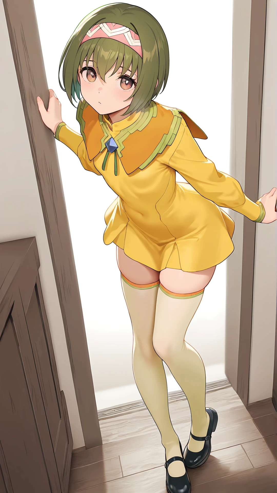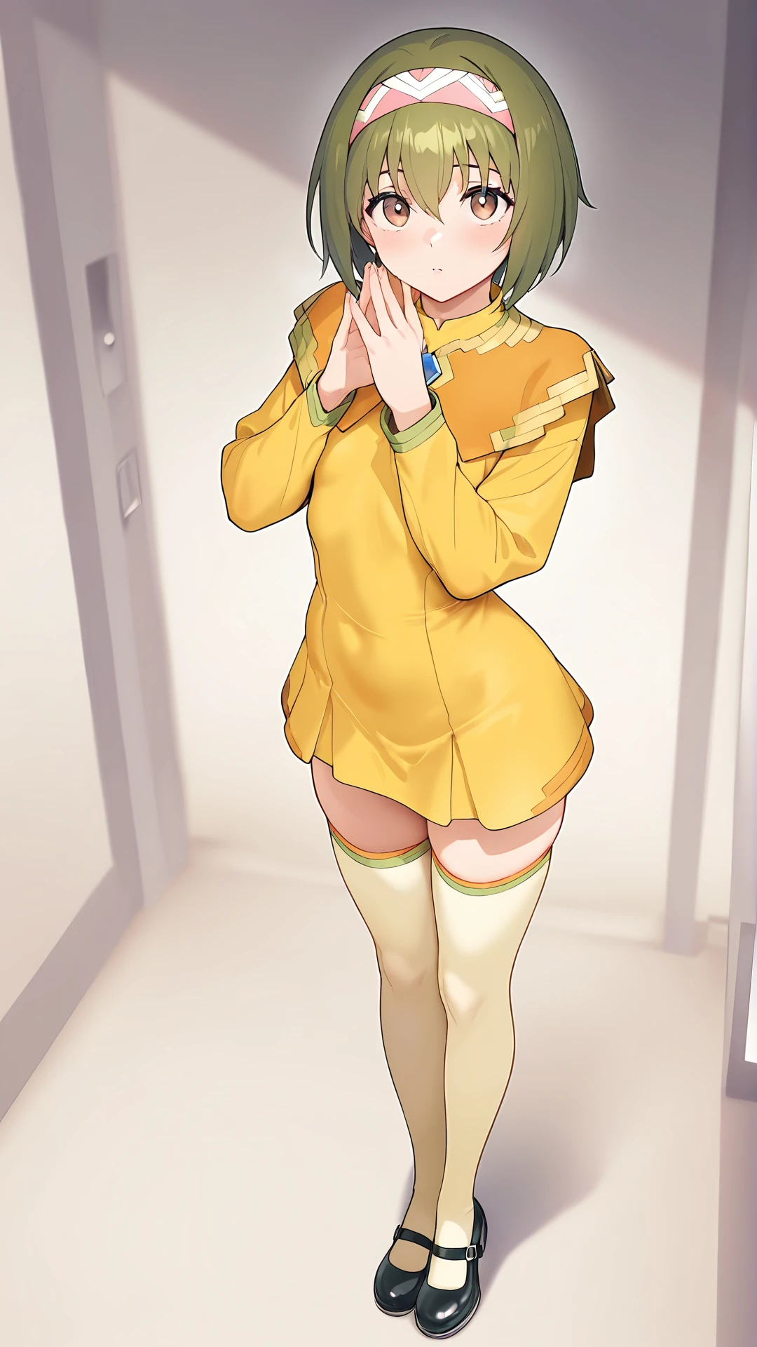 Hilde Shultz,1girl,short hair,green hair,brown hair,brown eyes,hairband,yellow dress,long sleeves,thighhighs,zettai ryouiki,mary janes,