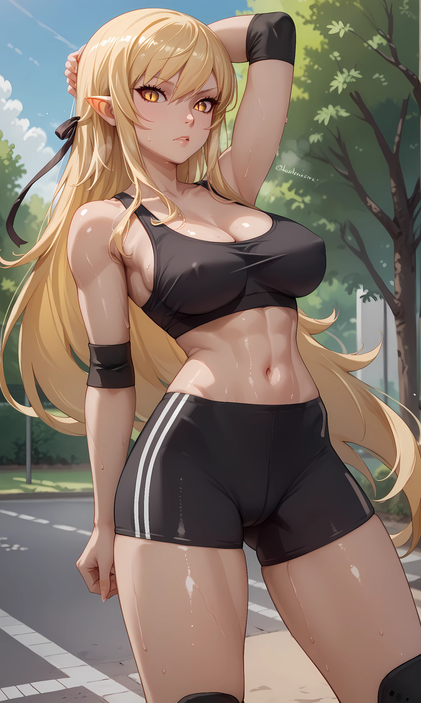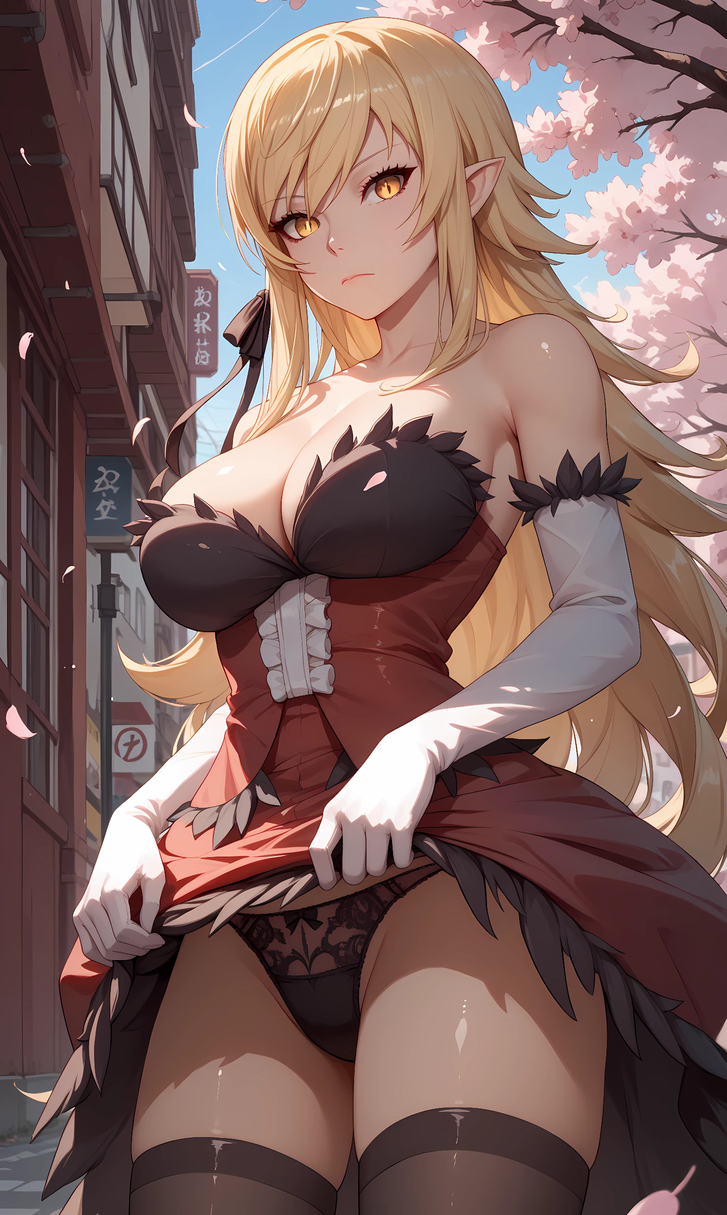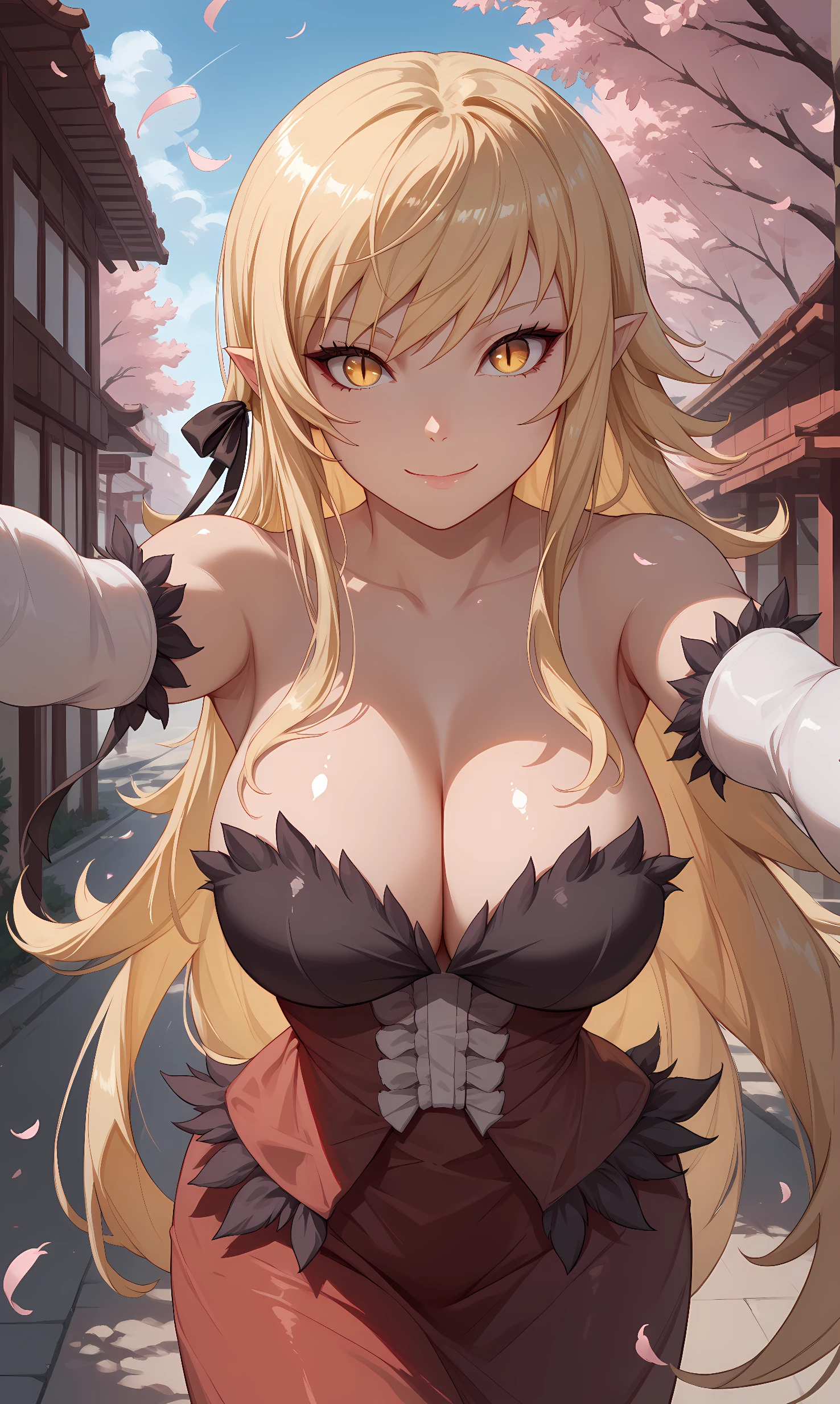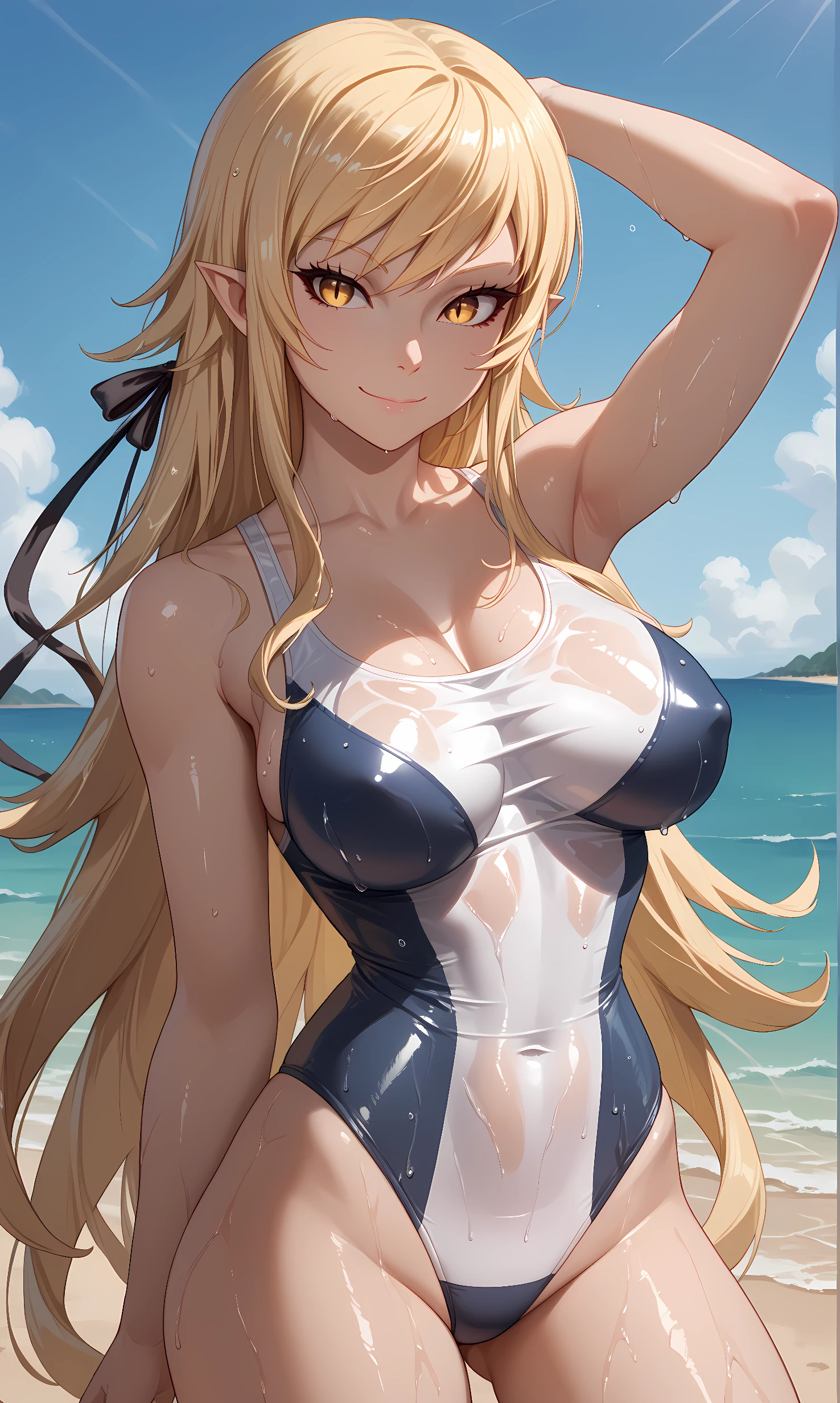 oshino, yellow eyes, slit pupils, blonde hair, very long hair, hair ribbon, black ribbon, pointy ears