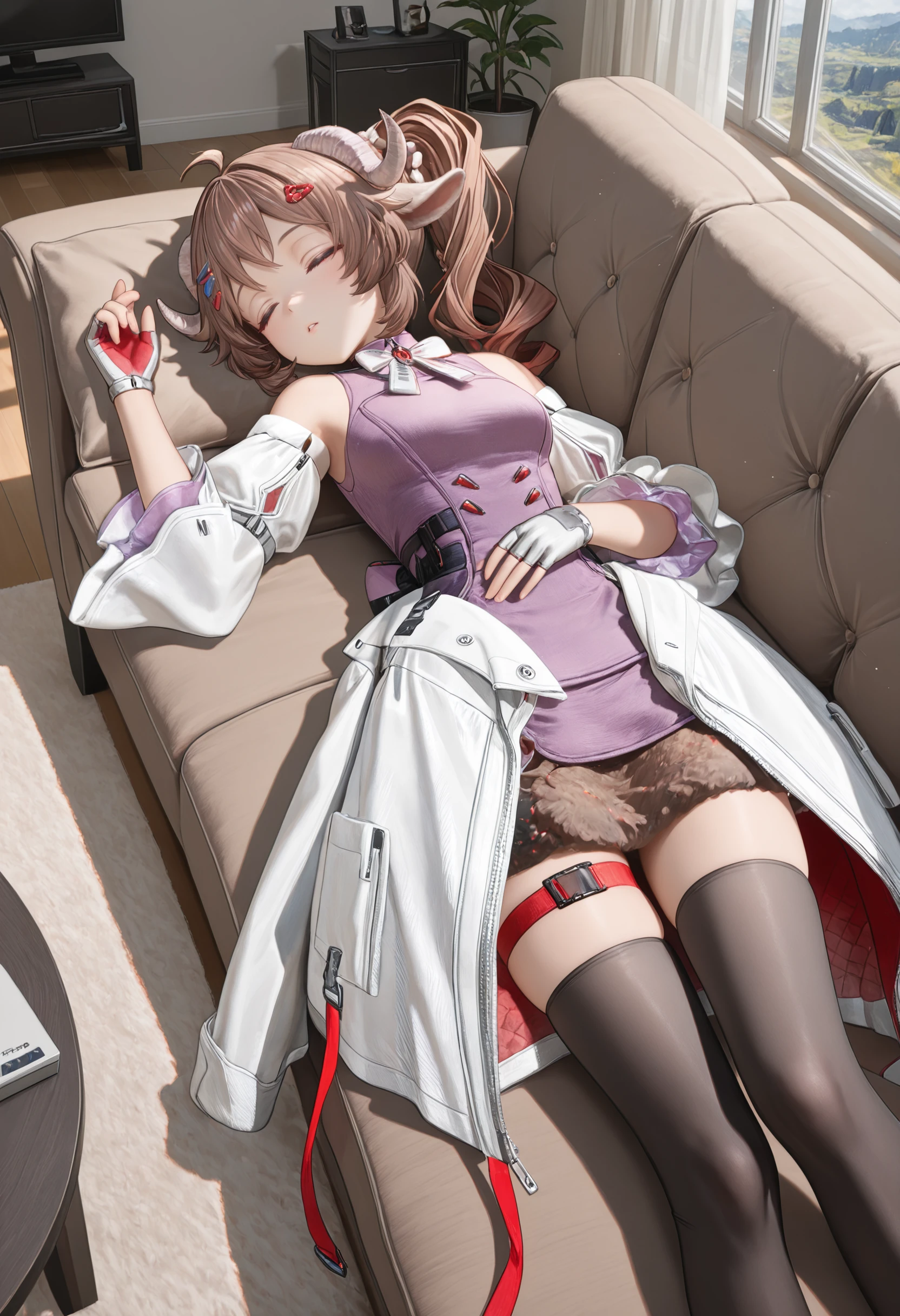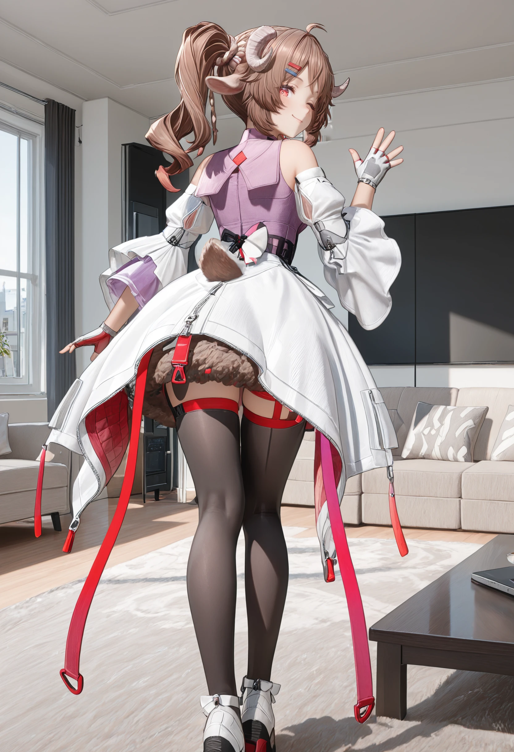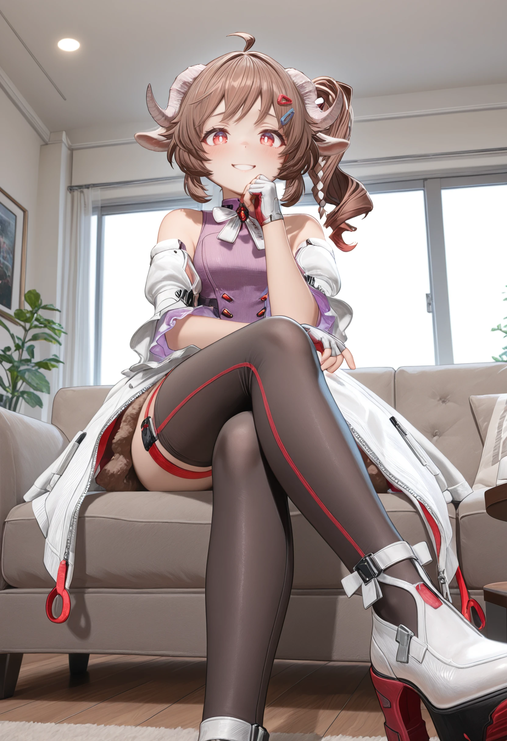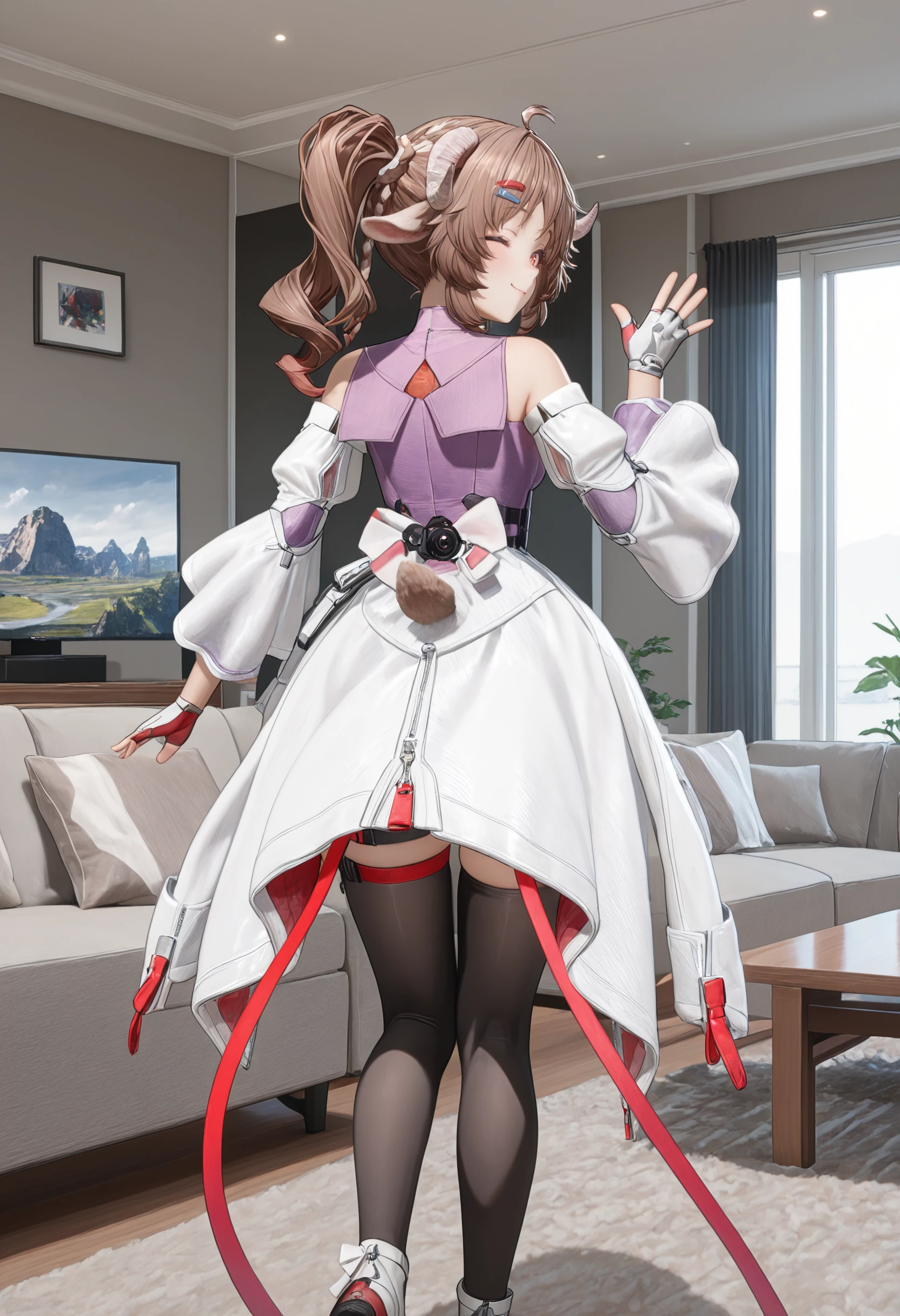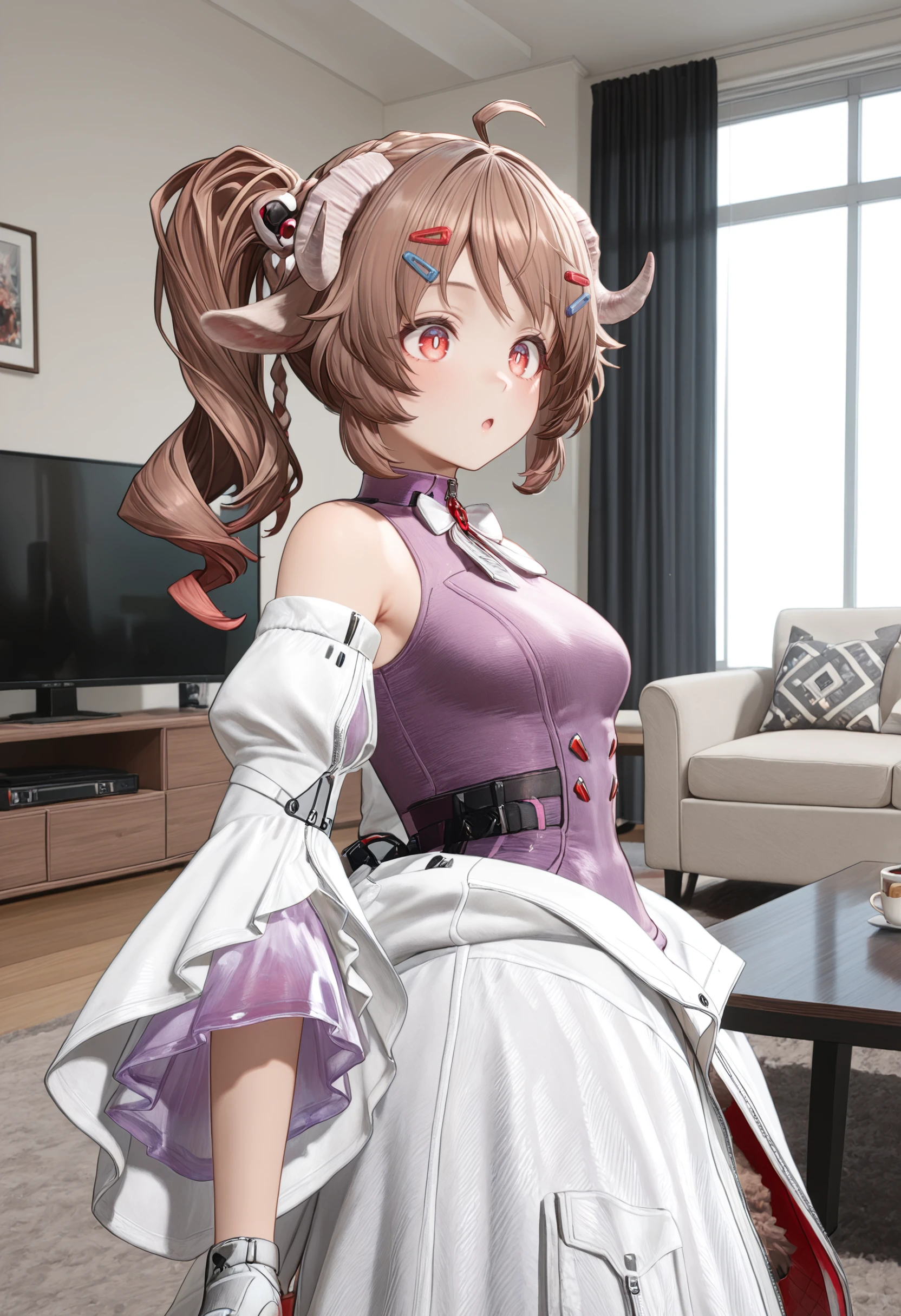 endfield style, 1girl, Ardelia, brown hair, side ponytail, ahoge, blue red hairpins, sheep ears, sheep horns, red eyes, white pupils, sideburns,