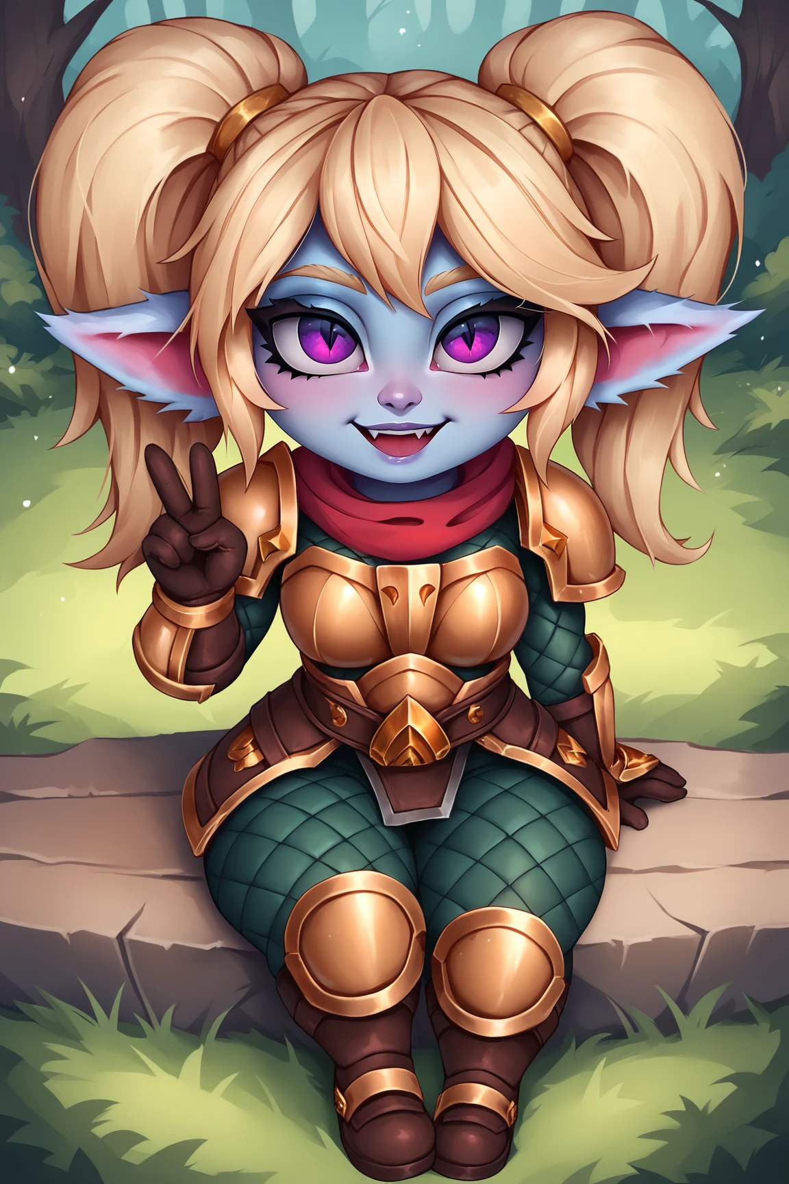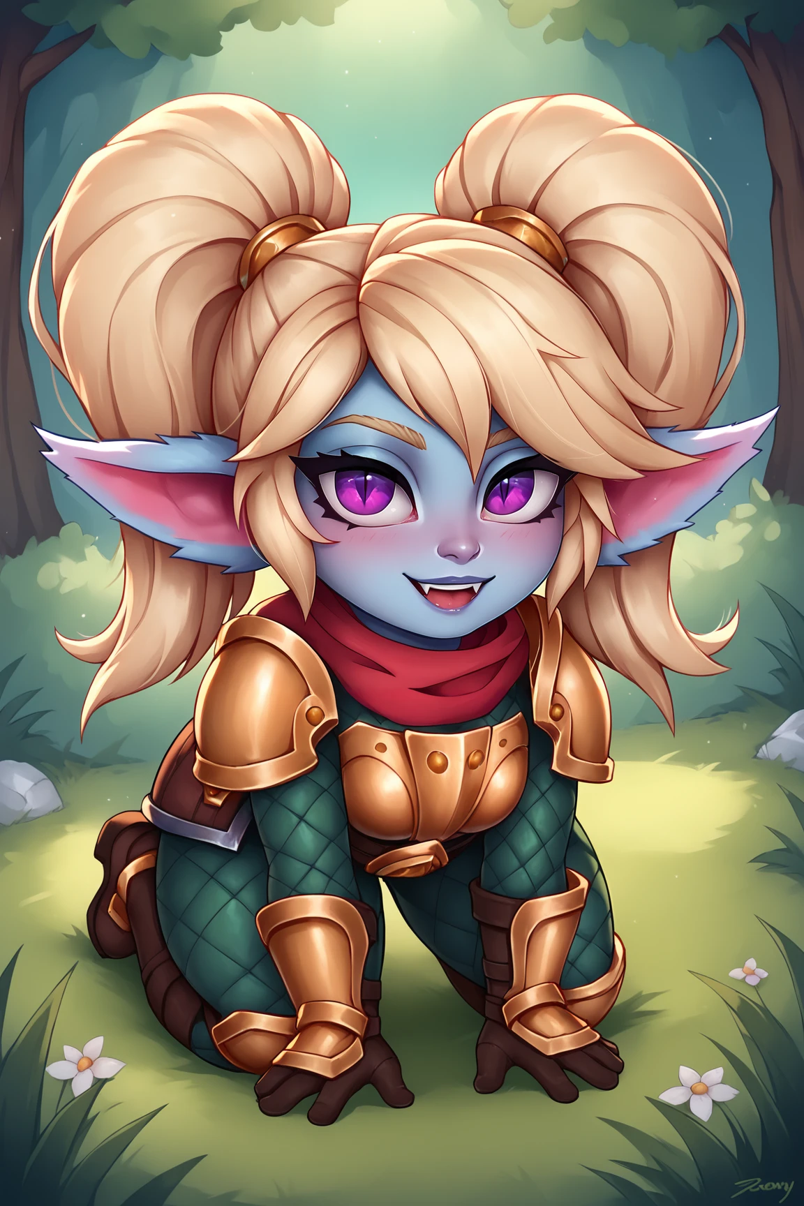 ➜ PoppyLoLXLv2, blue skin, colored skin, shortstack, yordle, purple eyes, blonde hair, twintails, pointy ears, medium breasts, golden armor, armor shoulder, red scarf, breastplate, green snakeskin shirt, brown gloves, armor hips, green snakeskin pants, brown boots]--|======[ 💗 My Settings: 💗 ]======|--[