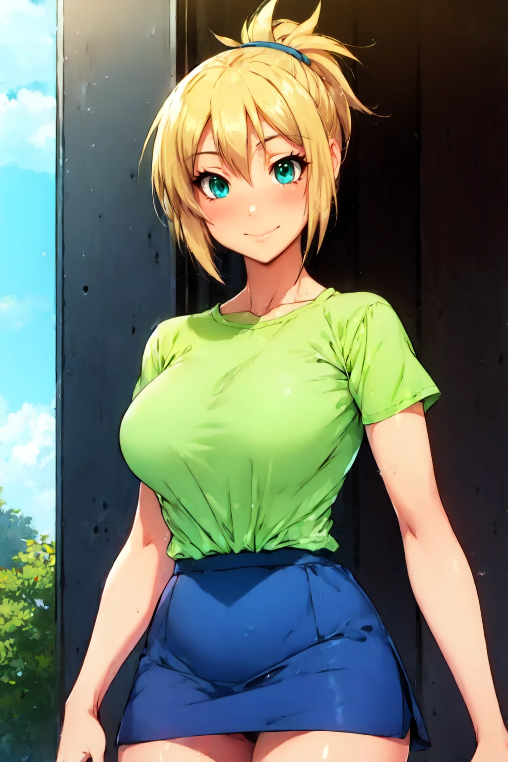 Haruka Fujimino,light blonde hair,aqua eyes,short ponytail,solo,large breasts