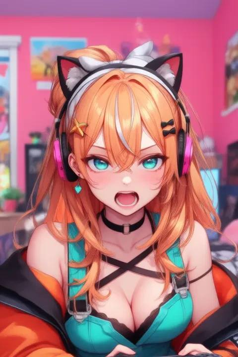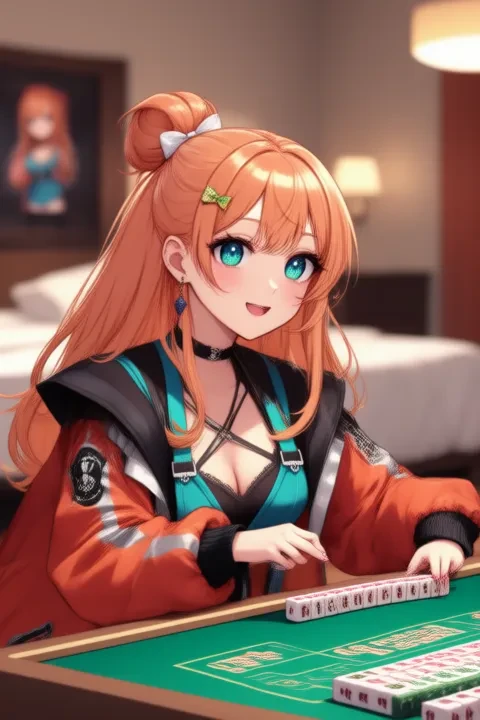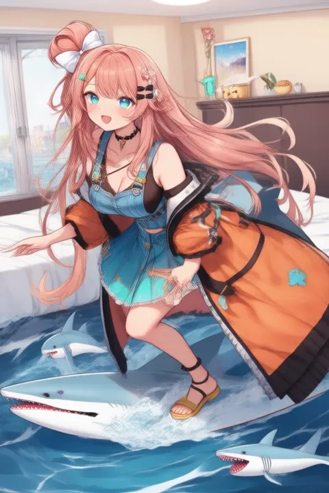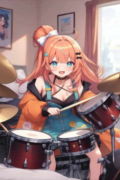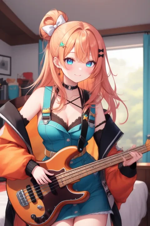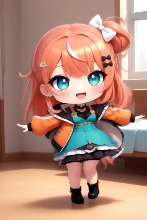 sample prompt:Igarashi rika, An anime-style girl with light orange hair styled in a single bun, with a white scrunchie, and vibrant green eyes. She is wearing a stylish outfit consisting of a teal-colored overall dress layered over a black top. Over this, she wears an oversized orange and black jacket, (she is dancing:3.0), (chibi Nendoroid:3.0) in bedroom.