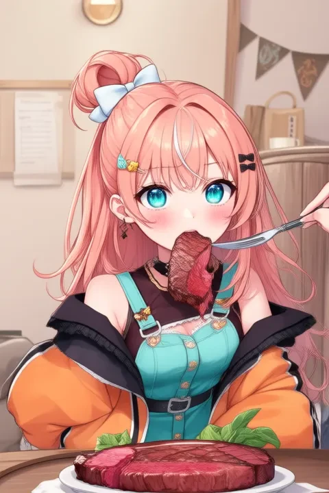 Trigger Word:Igarashi rika, An anime-style girl with light orange hair styled in a single bun, with a white scrunchie, and vibrant green eyes. She is wearing a stylish outfit consisting of a teal-colored overall dress layered over a black top. Over this, she wears an oversized orange and black jacket