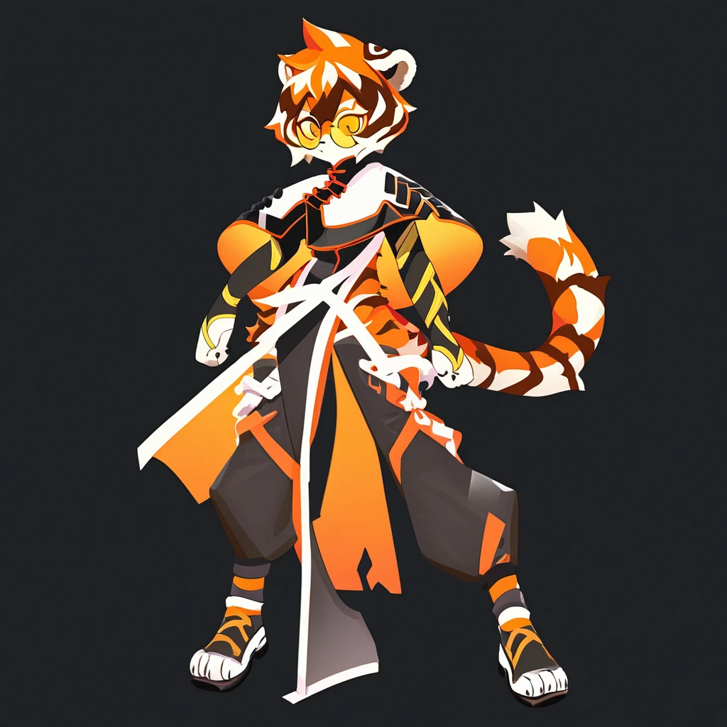 Optional: furry female, tiger ears, orange hair, tiger girl, short hair, multicolored fur, tiger tail, orange-tinted eyewear, pelvic curtain, pants, white capelet