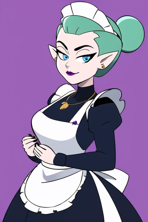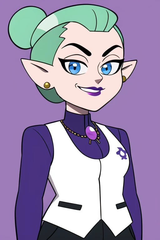 1girl, solo, green hair, single hair bun, blue eyes, lipstick, pointy ears