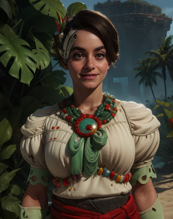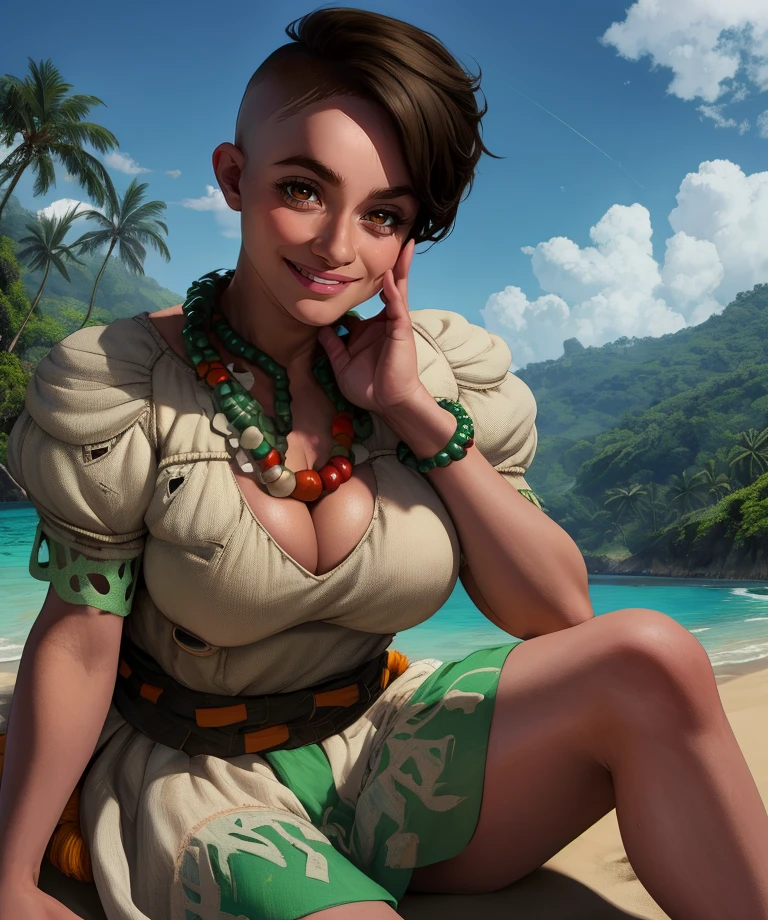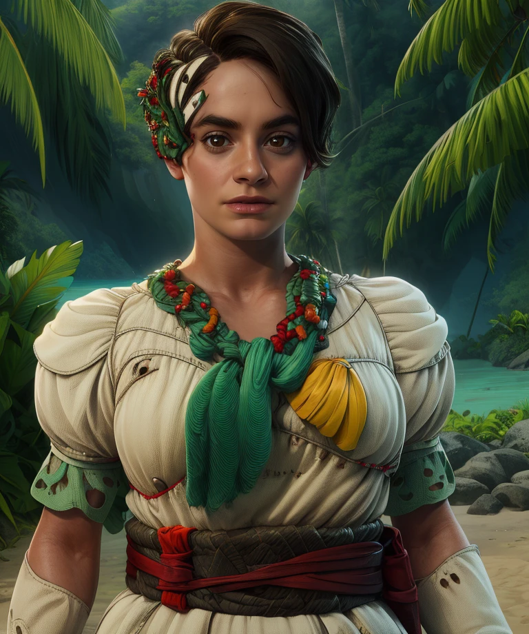 bead necklace, short puffy sleeves, white and green dress, or white dress, long shorts, headpiece, sandals, ---- red sash,