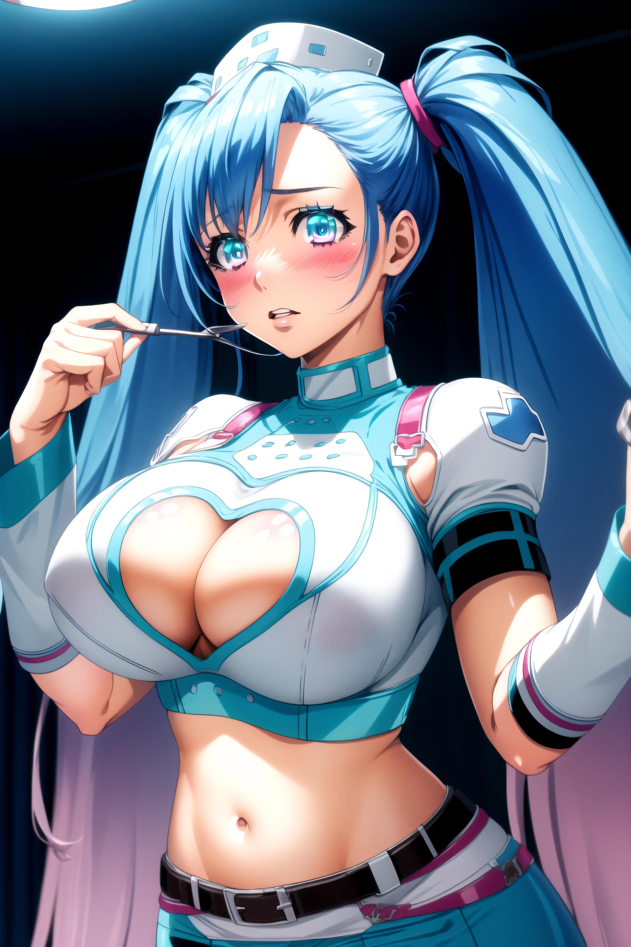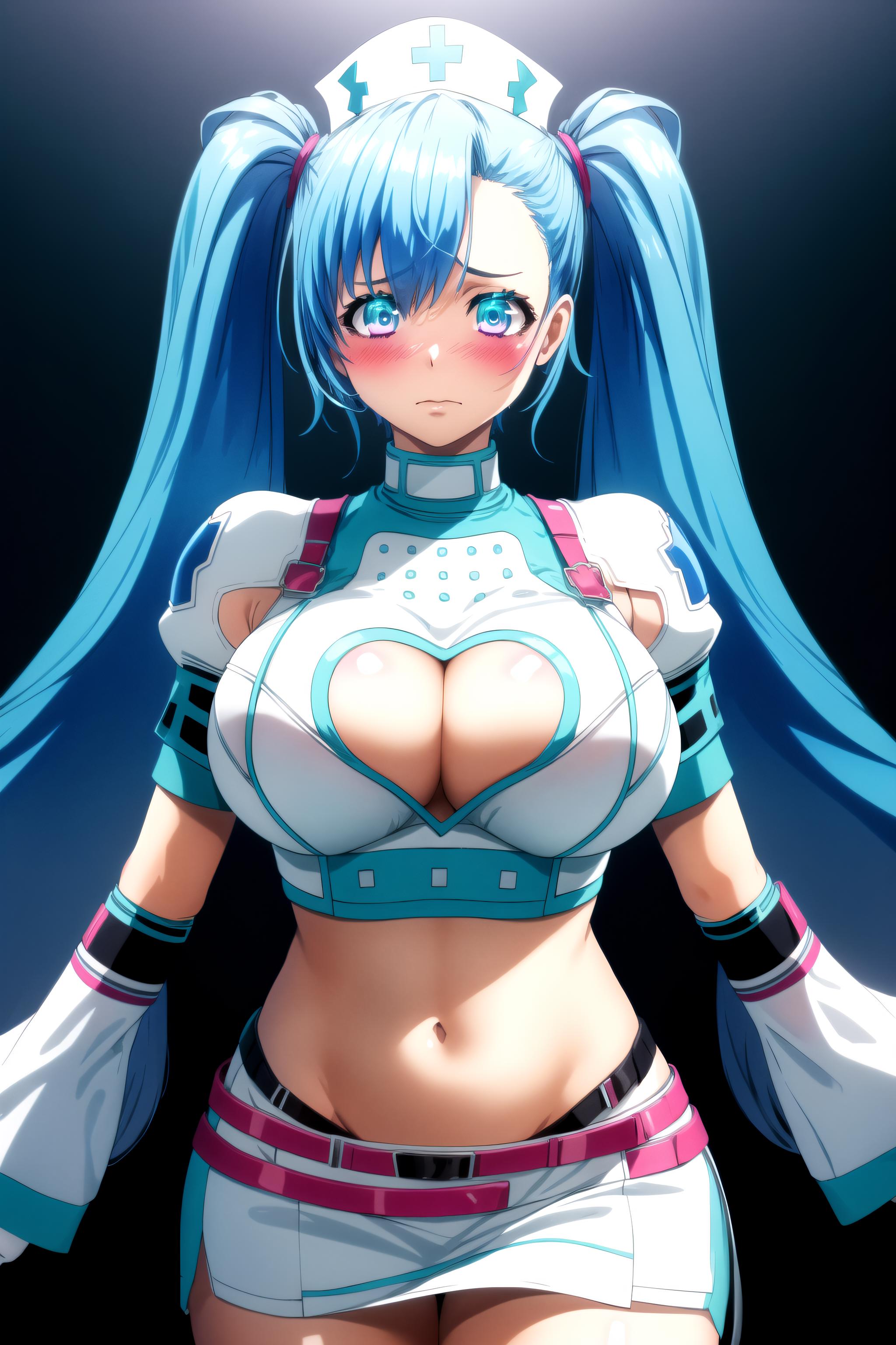 Main Outfit - white crop top, white miniskirt, white arm warmers, white thigh boots, nurse cap