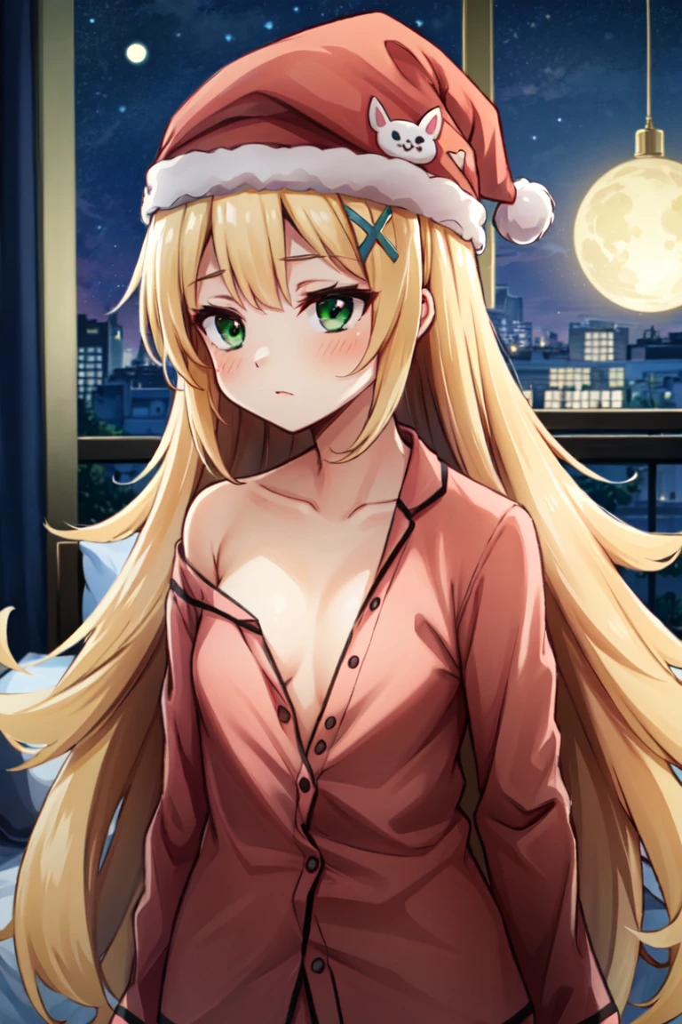 blonde hair, green eyes, long hair, messy hair, expressionless, pajamas, nightcap, x hair ornament, off shoulder