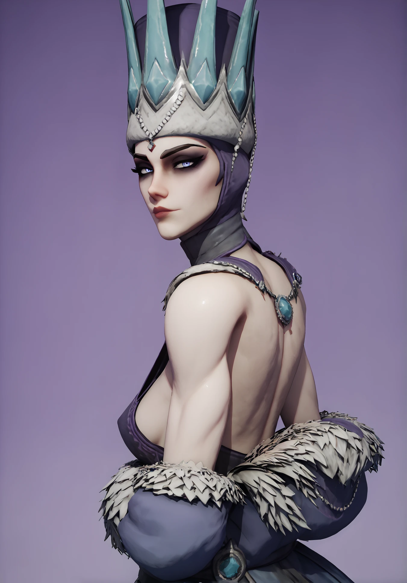 Fur cape, purple dress, necklace, circlet, fur-trimmed hat, crown, headscarf (Illustrious)