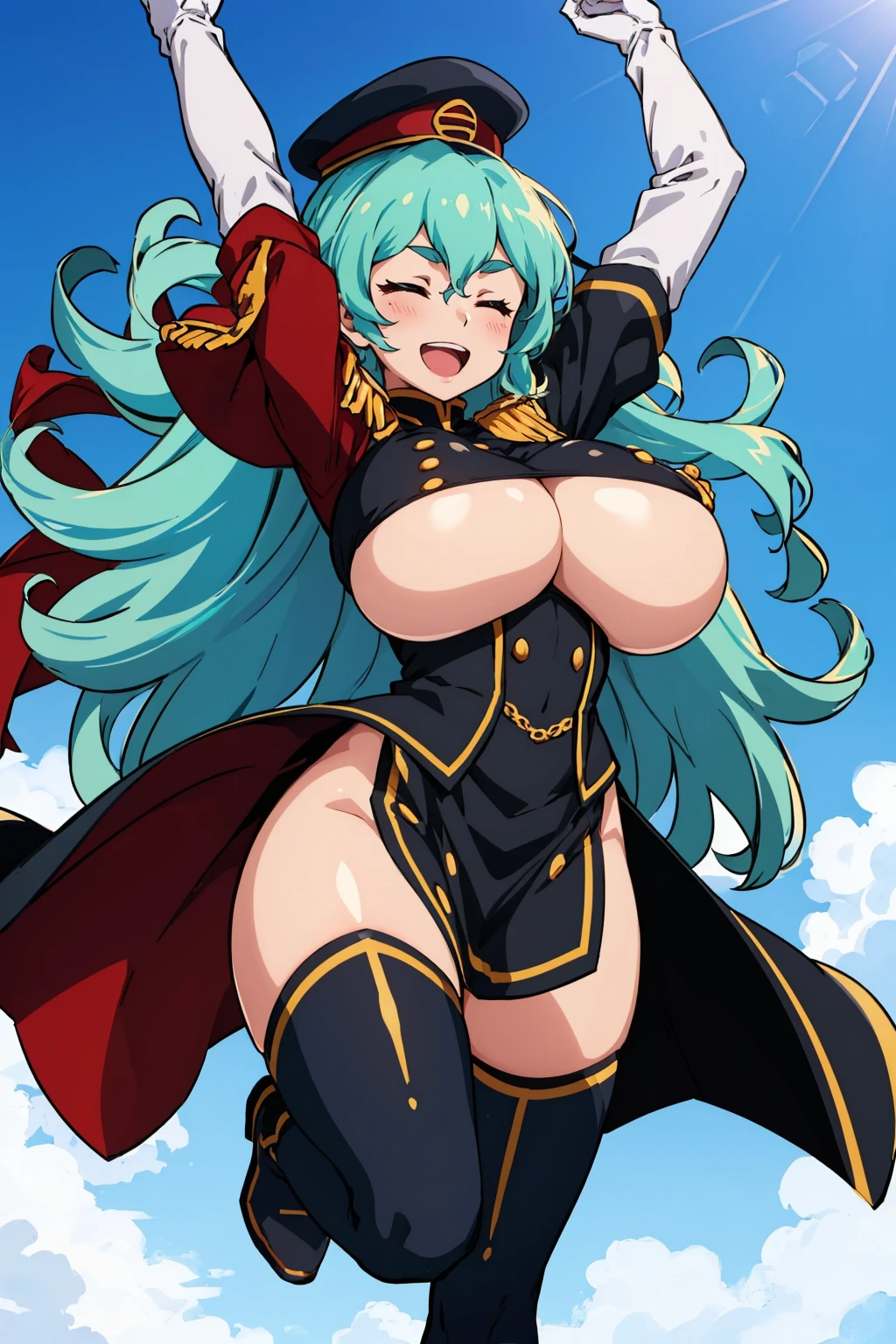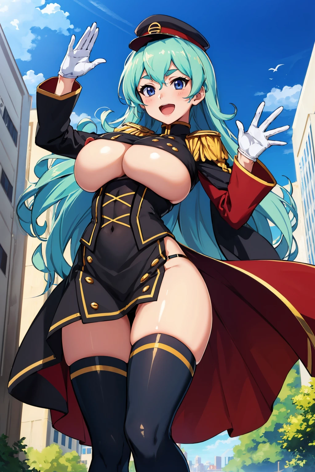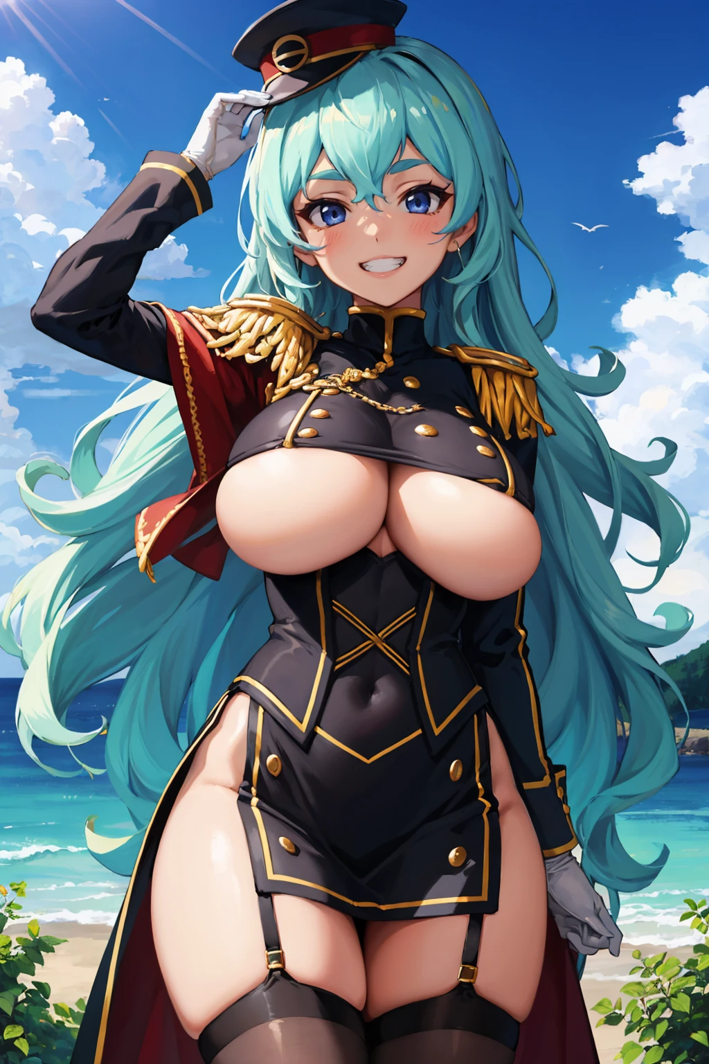 black hat, peaked cap, epaulettes, black dress, uniform, underboob cutout, garter straps, black thighhighs, white gloves